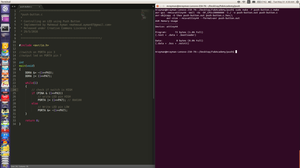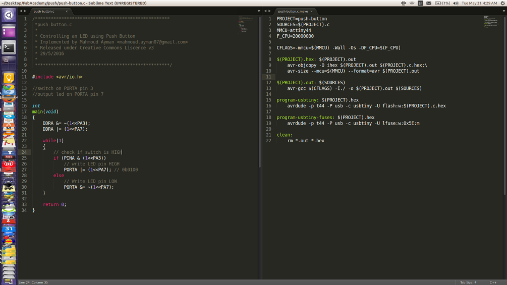 When programming in C, you'll need to understand how the MCU is working on a low-level; you'll need to read the datasheet for the ATtiny44, not the whole thing of course just the I/O section, and you can find it here. You'll also need some experience in programming, especially bitwise operations. I have implemented two files, push-button.c, which contains the actual code, and push-button.c.make file, which contain -basically- some commands to automate the compilling and execution of the .c file.