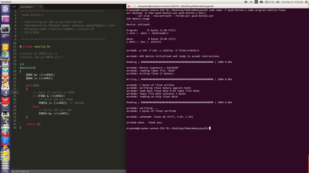 then configuring the fuses on board make -f push-button.c.make program-usbtiny-fuses