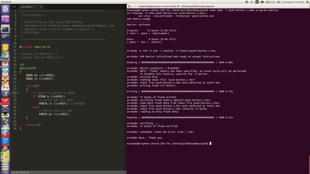 finally uploading the HEX file make -f push-button.c.make program-usbtiny