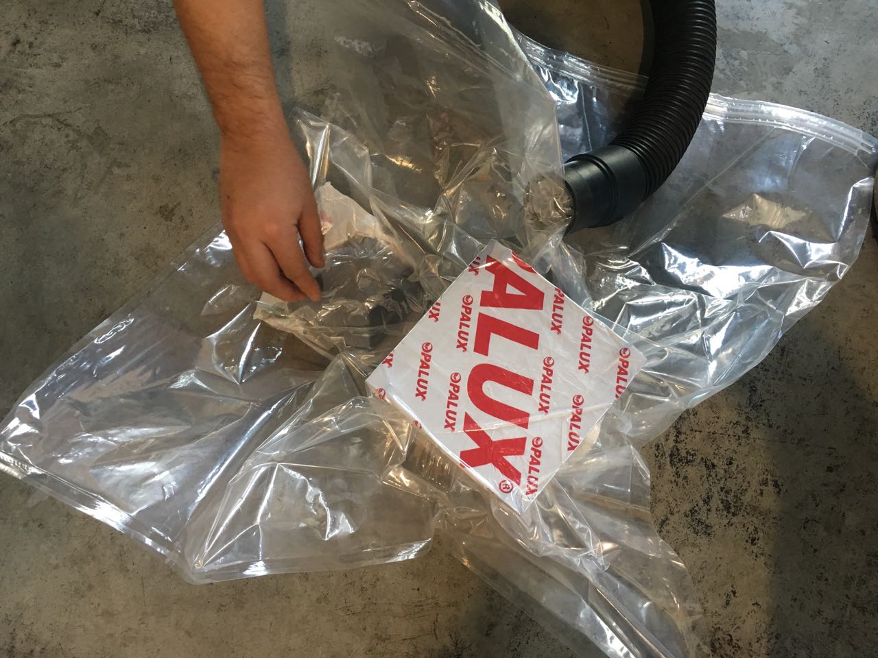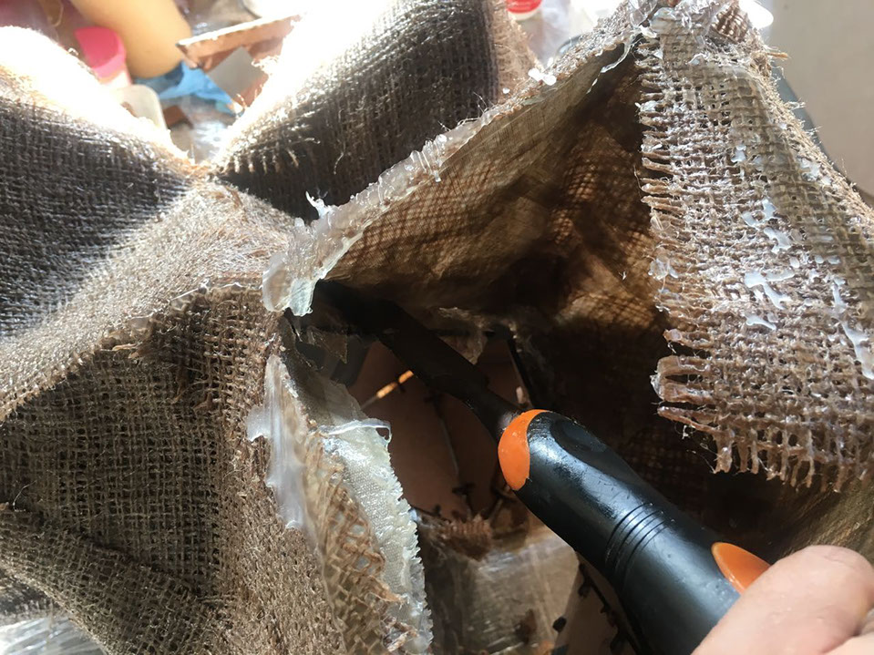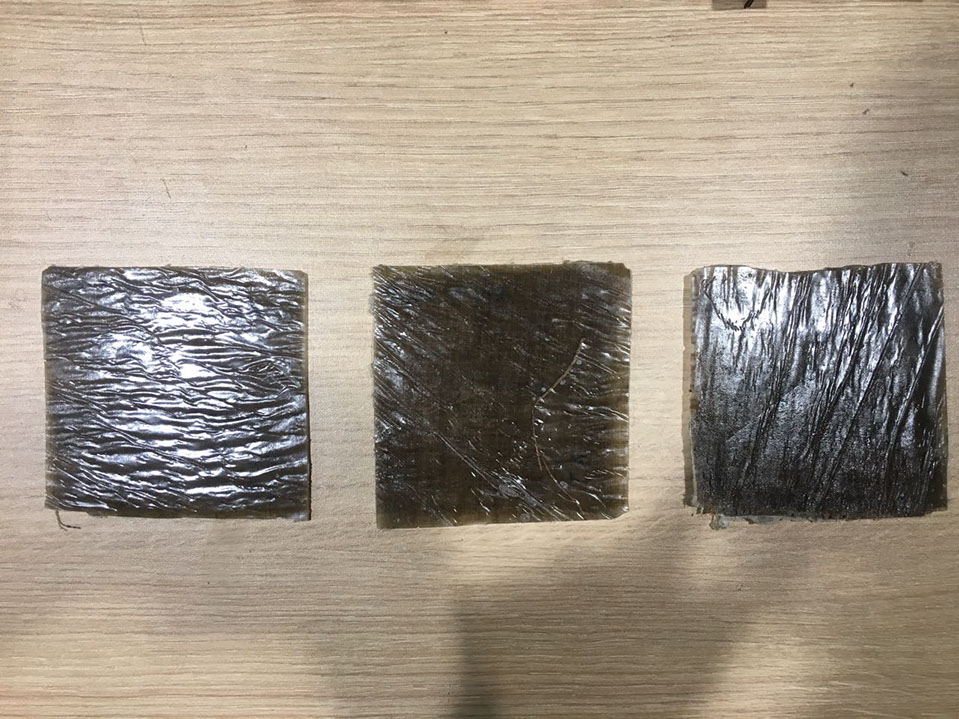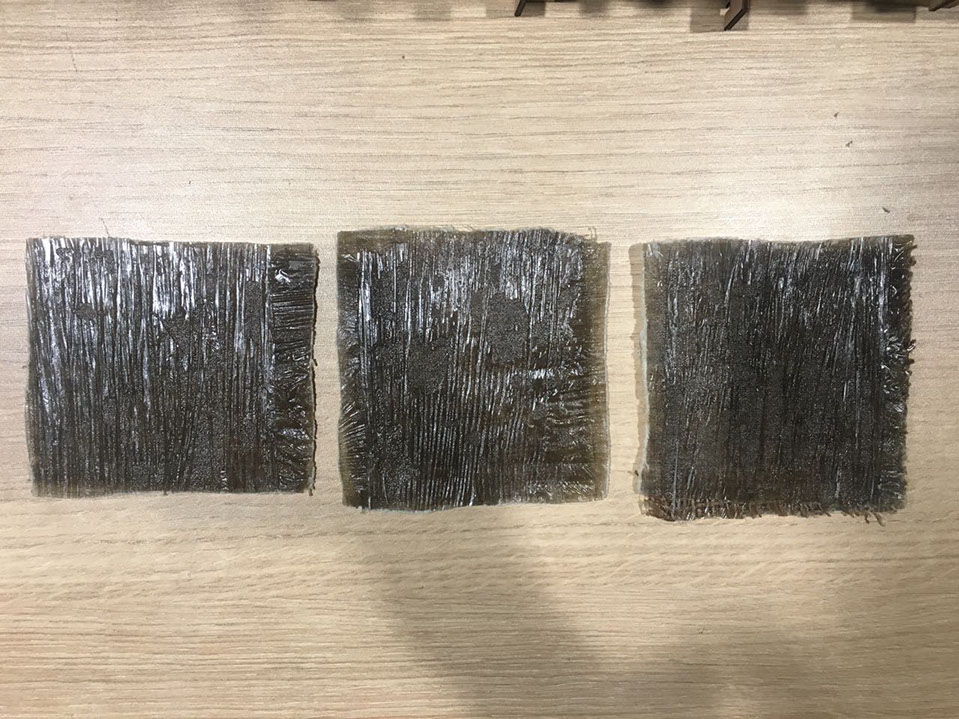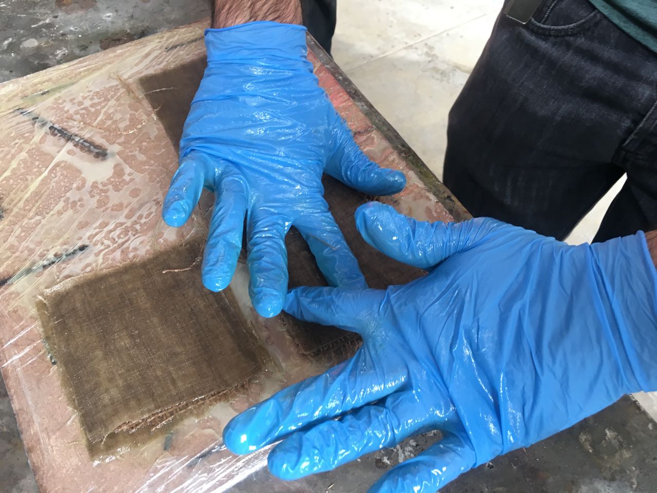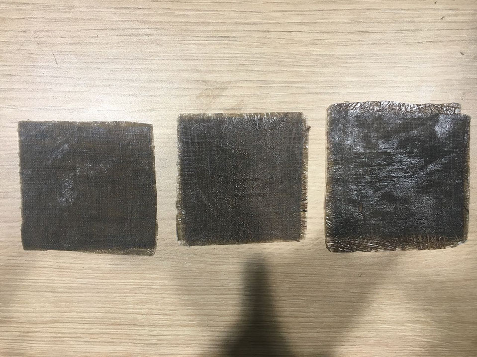 For the third test we remove the resin with the hands tightening as much as possible. We place the samples inside mdf supports and place them inside a plastic bag that has a valve to extract the air with a vacuum cleaner. It took two days to dry well. The result as seen in video 2 was: Texture not very even, material more or less flexible and more or less compact.