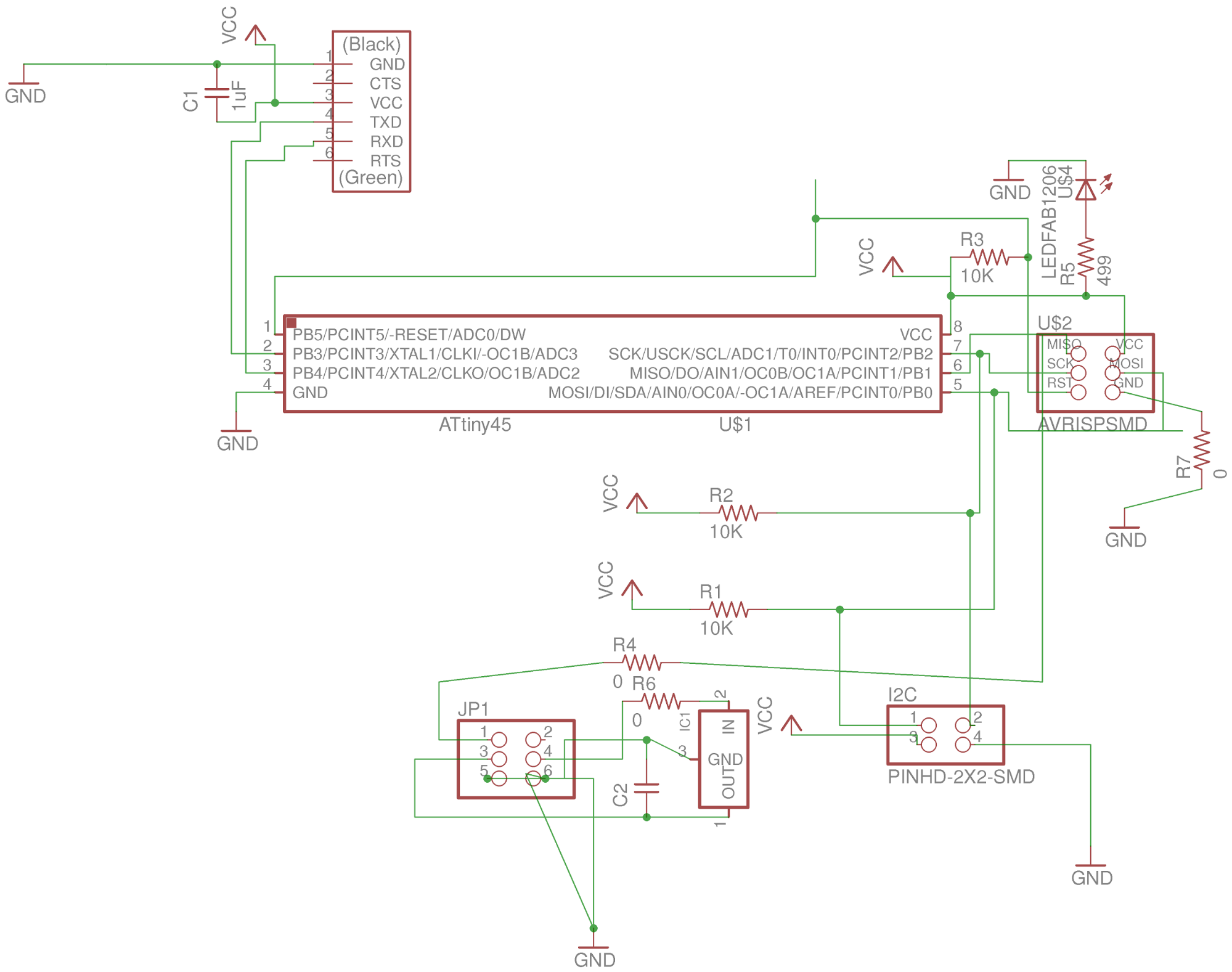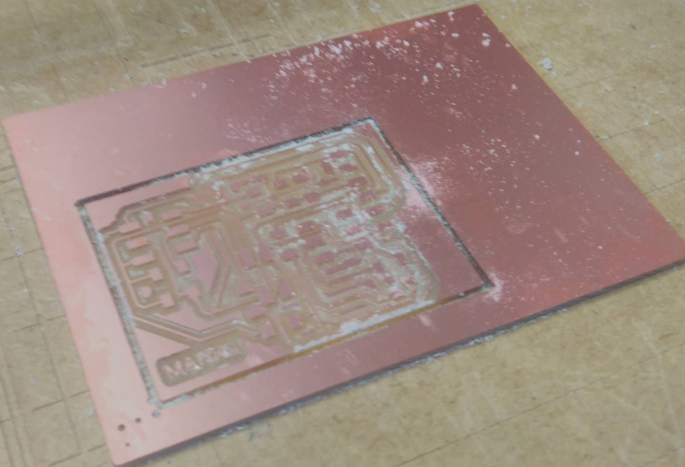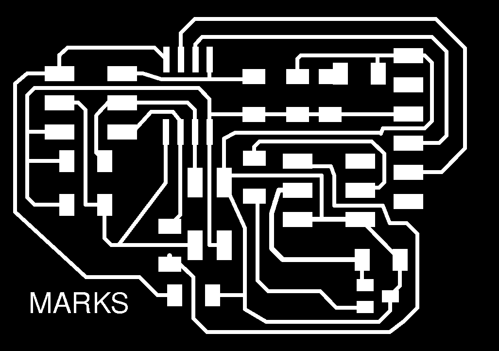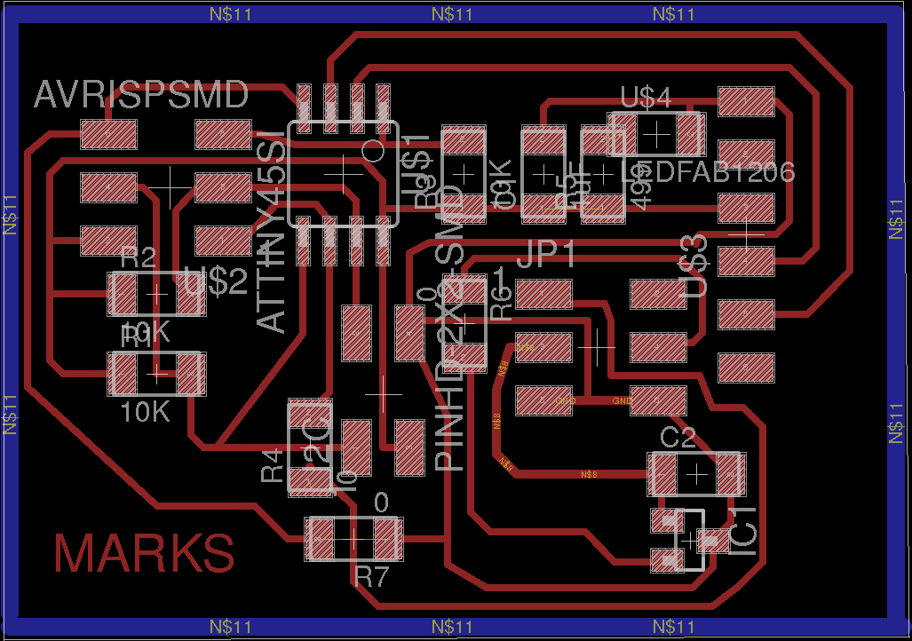 The ATtiny45 datasheet shows two pins with PWM modes, ICSP protocol and I2C communications. Then, we link these pins in the circuit. The datasheet can download here. I have designed the PCB in Eagle software. The images below are results of our design. The image left shows the elements links, the middle image is prepared to mill in the Roland machine, and after finding union traces in fabmodules , we have correct the traces. Finally, we got right circuit without mistakes in its traces.