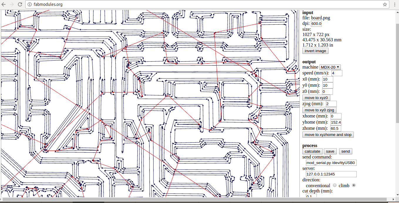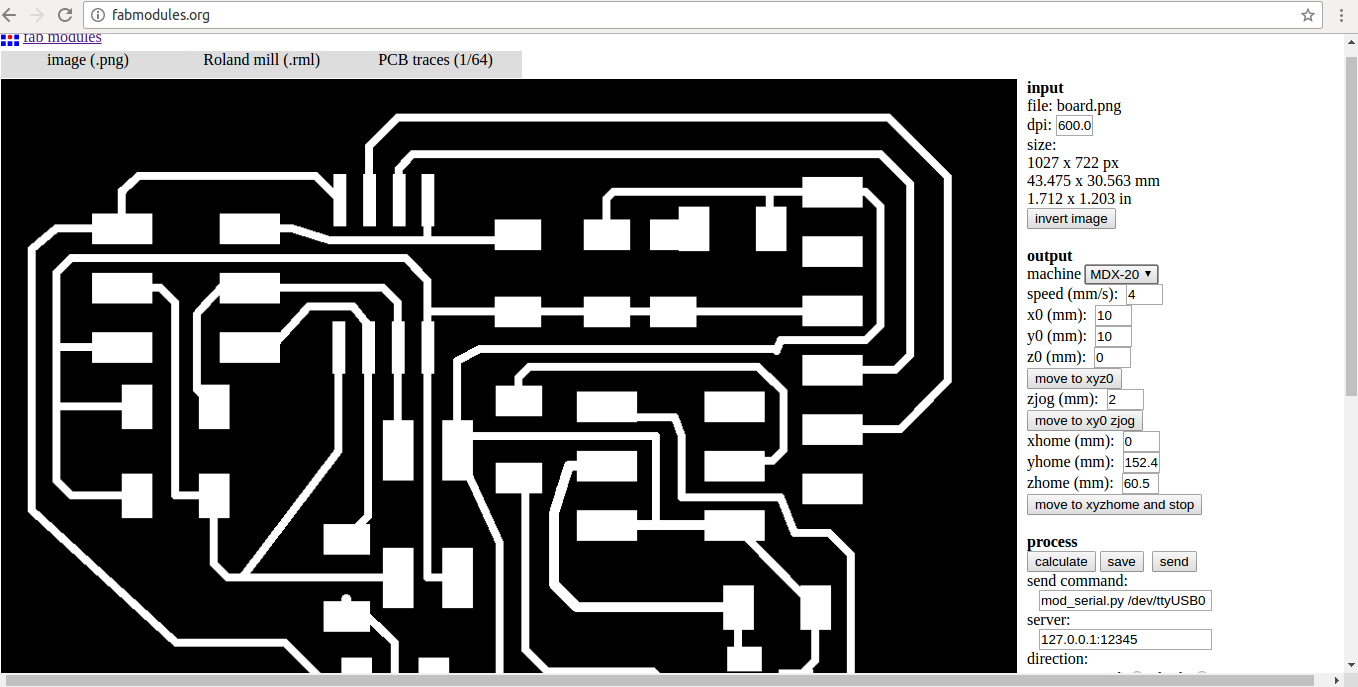 The images right shows the process to obtain a .rml file on fabmodules. It will send to Roland Machine. But before it, we check the traces to find union paths.