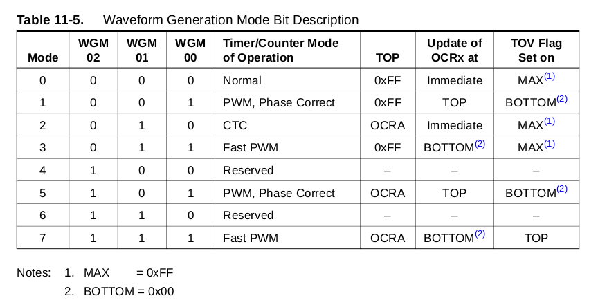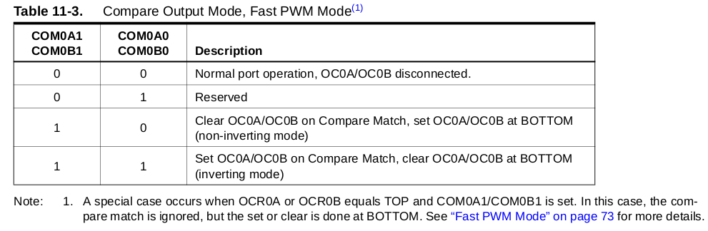 The registers to setup are TCCR0A and TCCR0B. The table 11-3 shows how fast PWM mode should setup