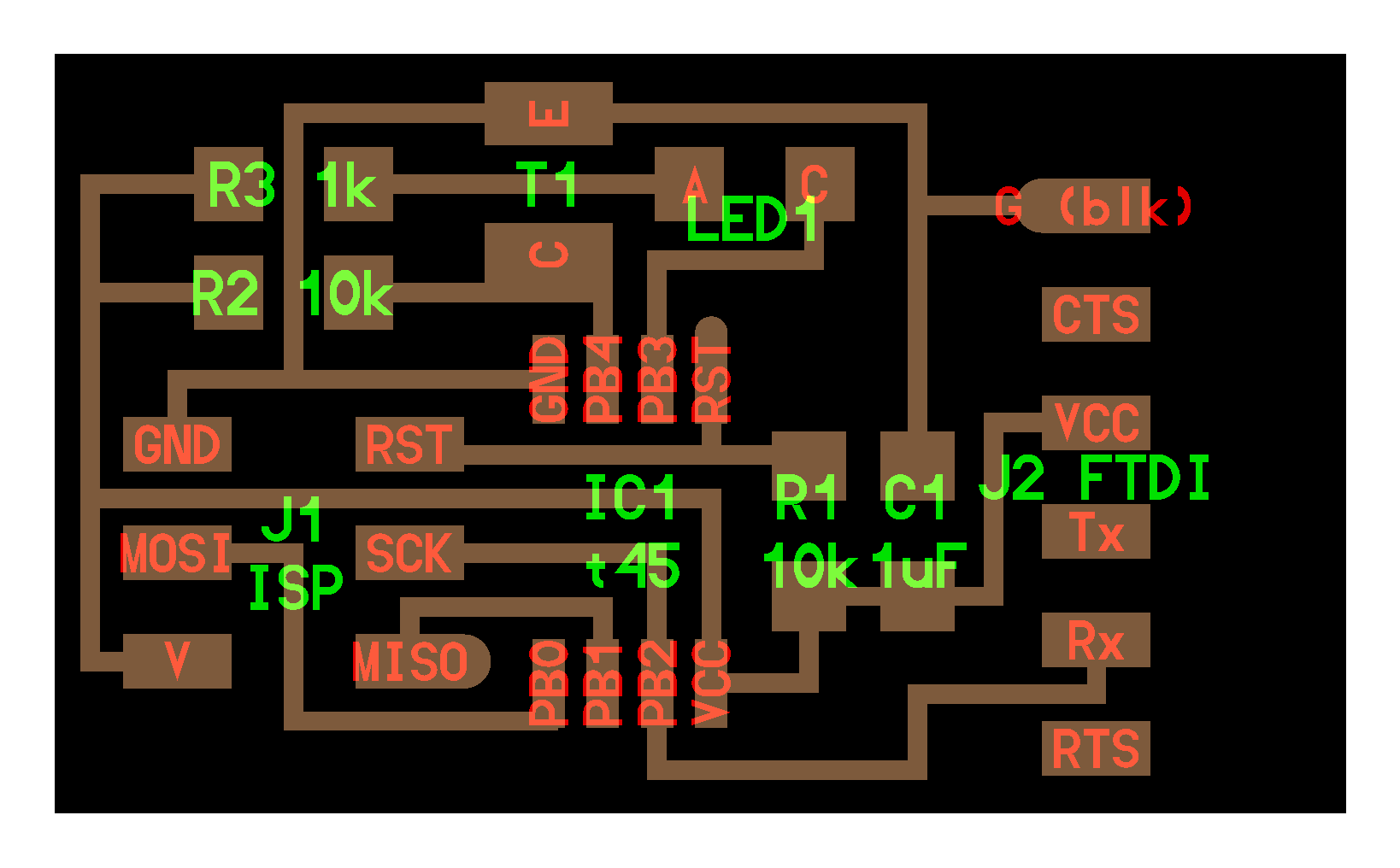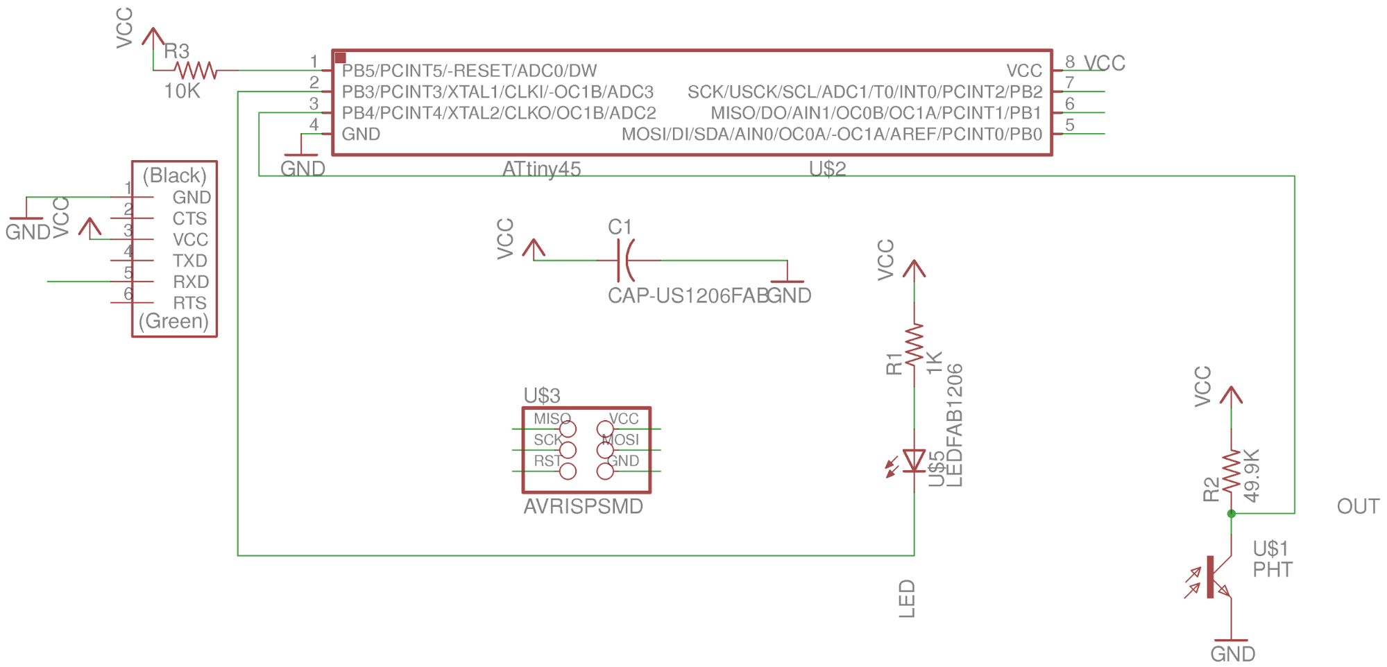 With these considerations Niel created this circuit considering the reflection of a led on a phototransistor mounted on a PCB that process their signals in ATtiny45. So we are going to redraw the circuit on Eagle
