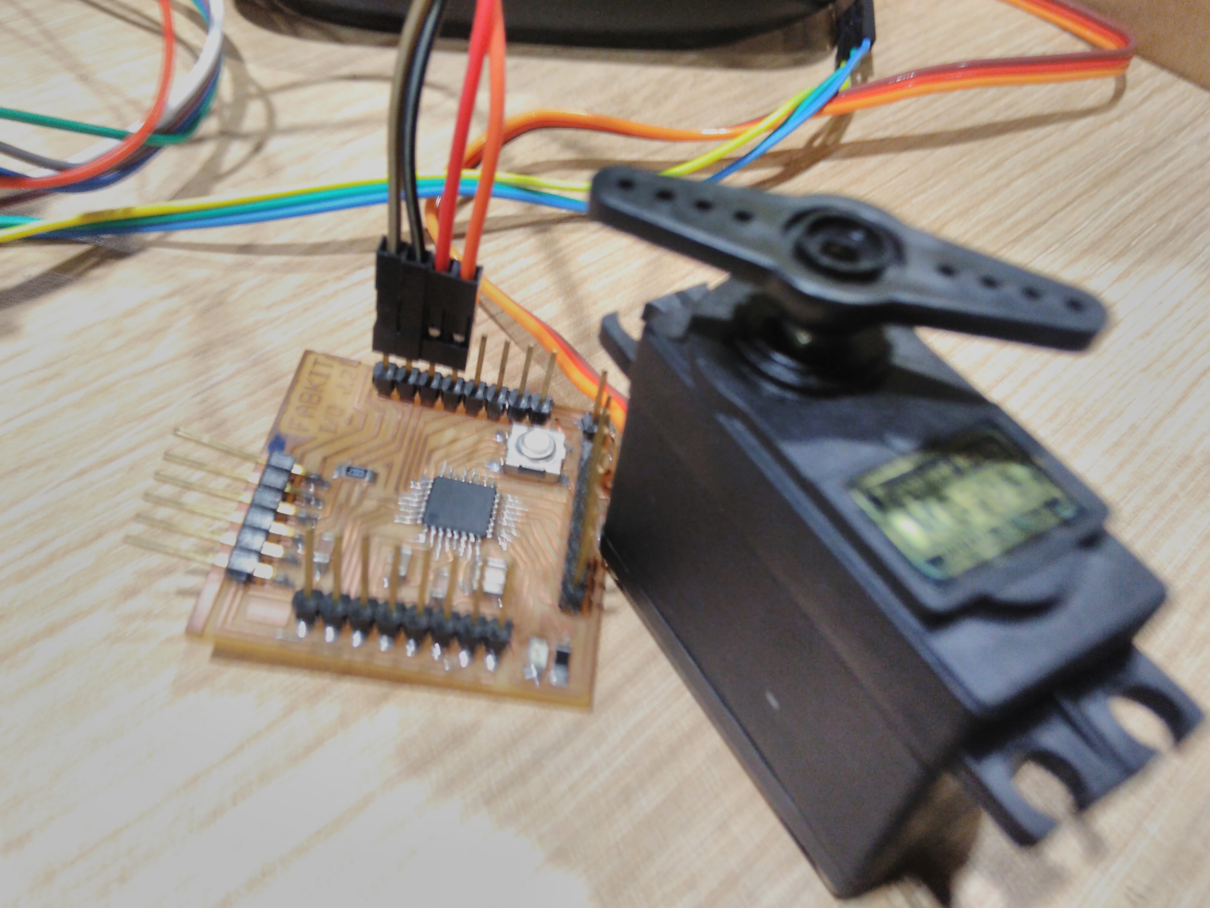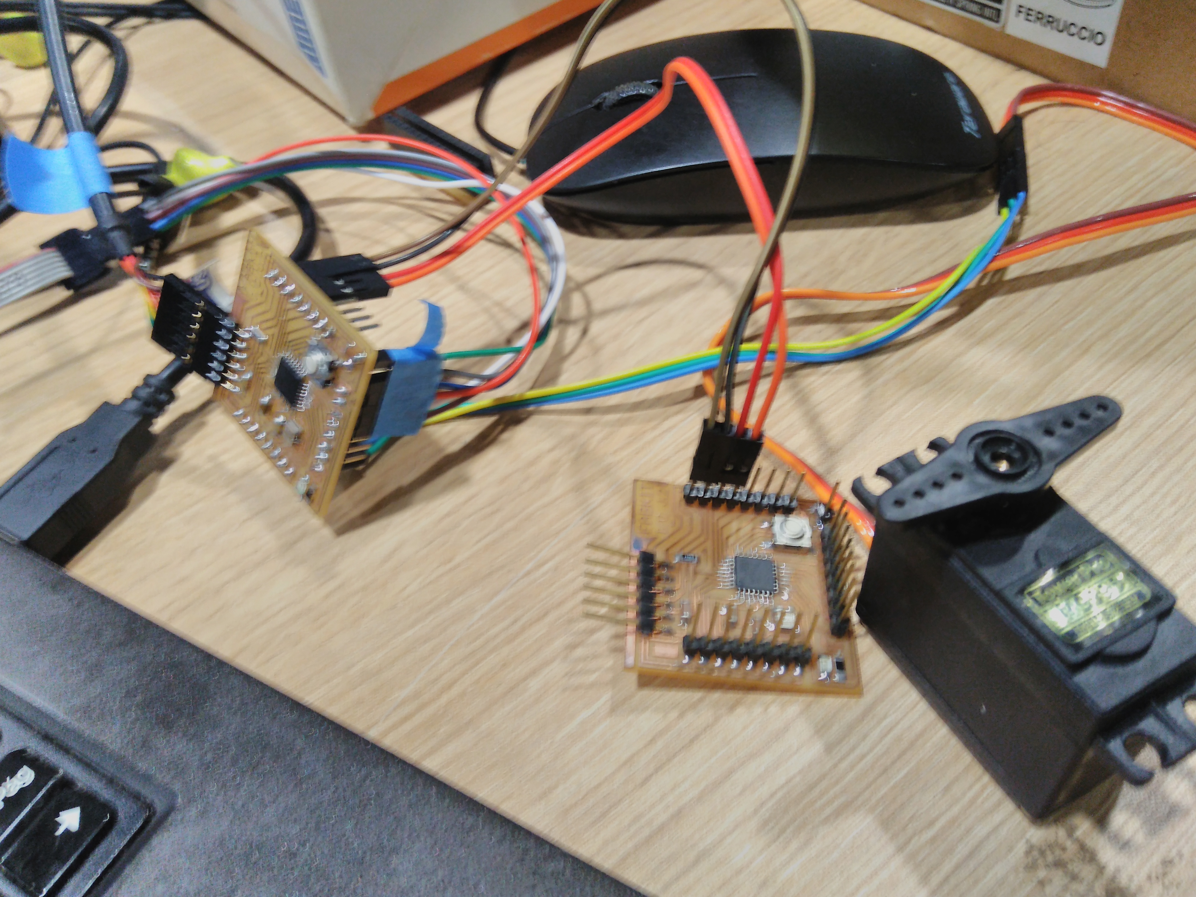 The main idea is abstracted in the right image. The slave will send a numbers between 0 and 127 when the master request communication, it will get the value to transform in angle of servomotor. The slave address is 8 and send one byte. This idea become real when I connect two fabduinos through SDA/SCL pins. In master board connects a servomotor. The next images show this hardware implementation. Additionally, we connect fabduino with FTDI wire and AVRISP. The power supply is the same for boths kits. You can donwload the source files here