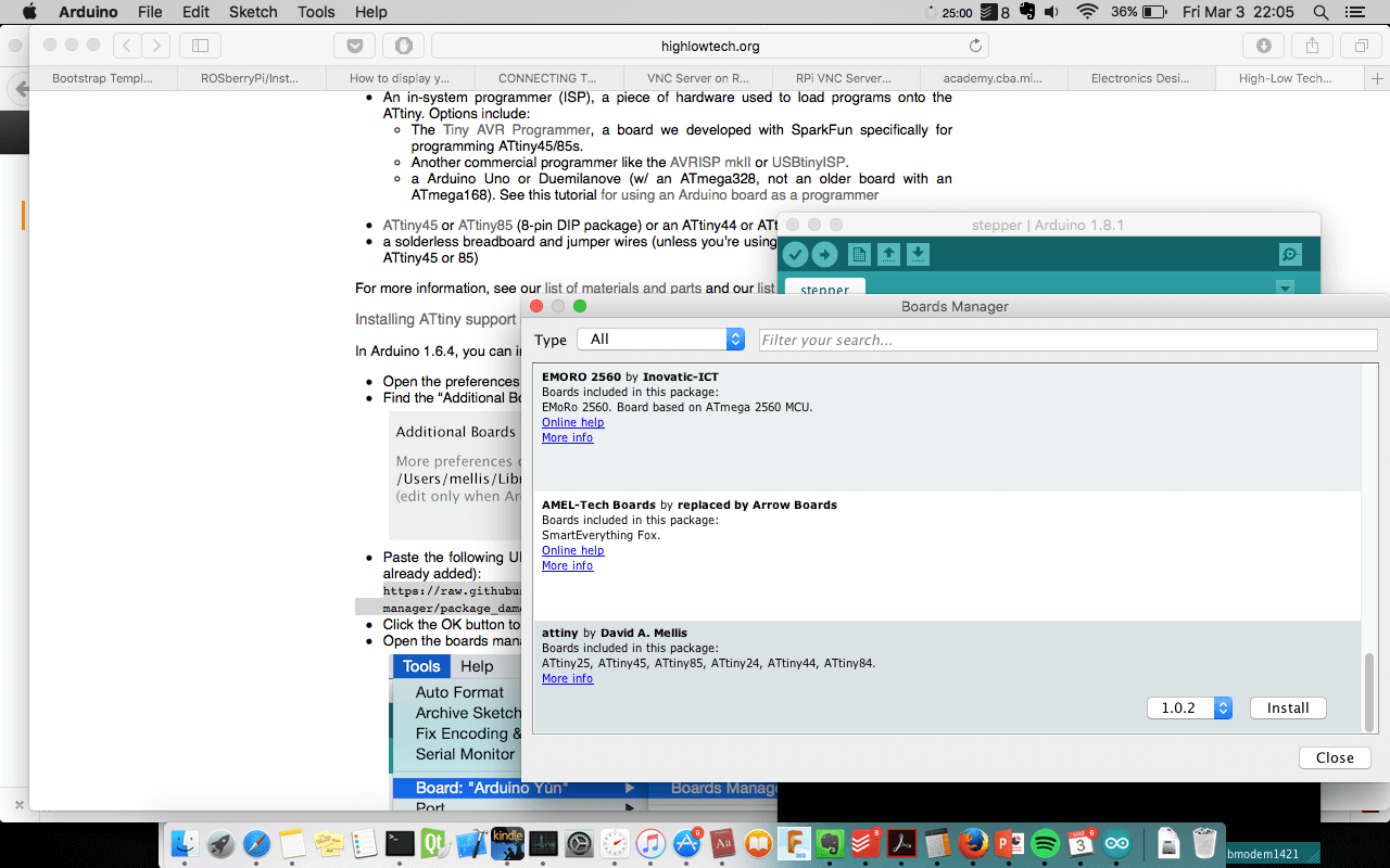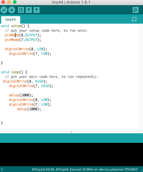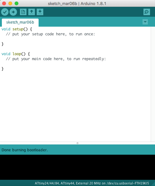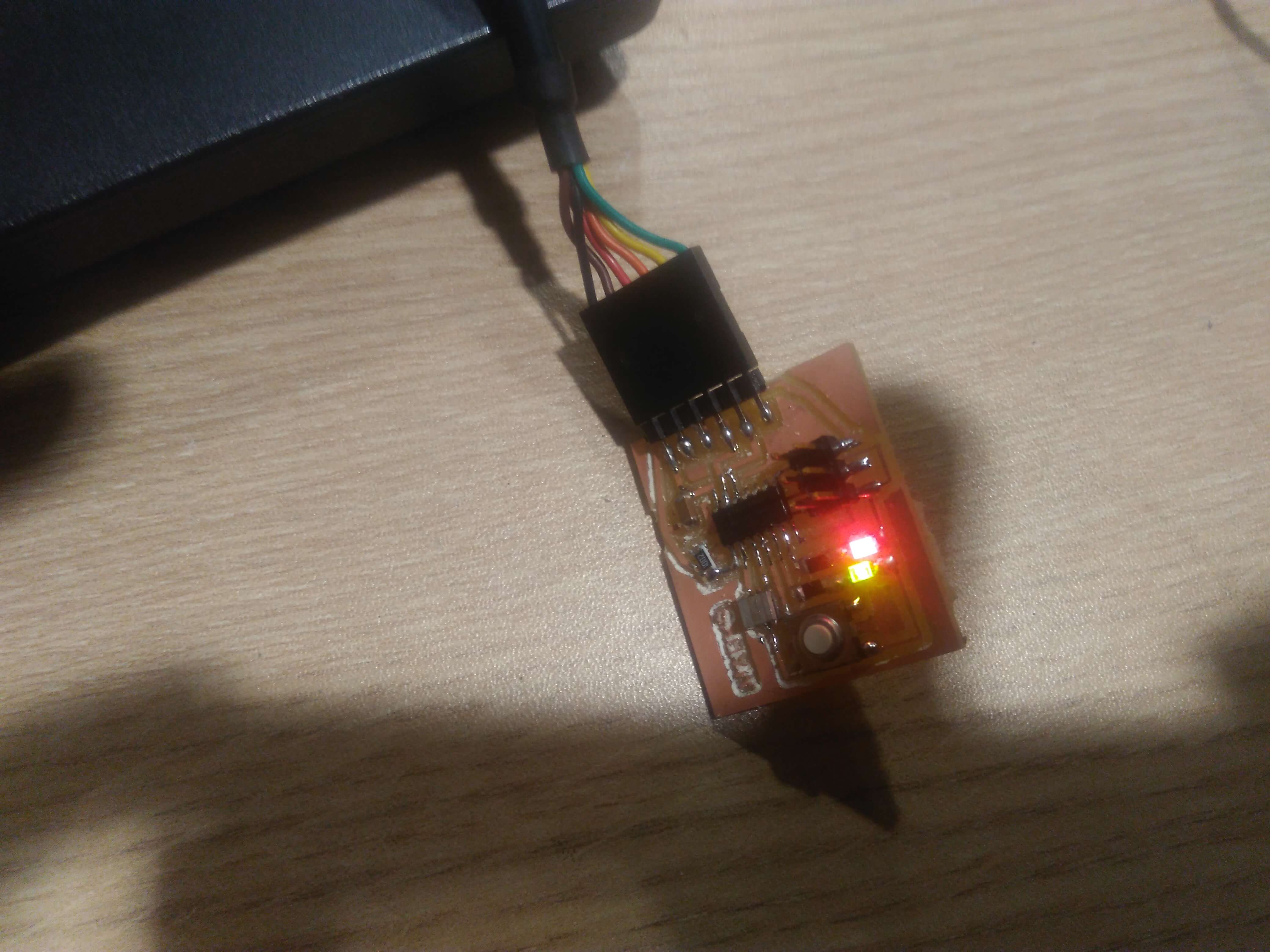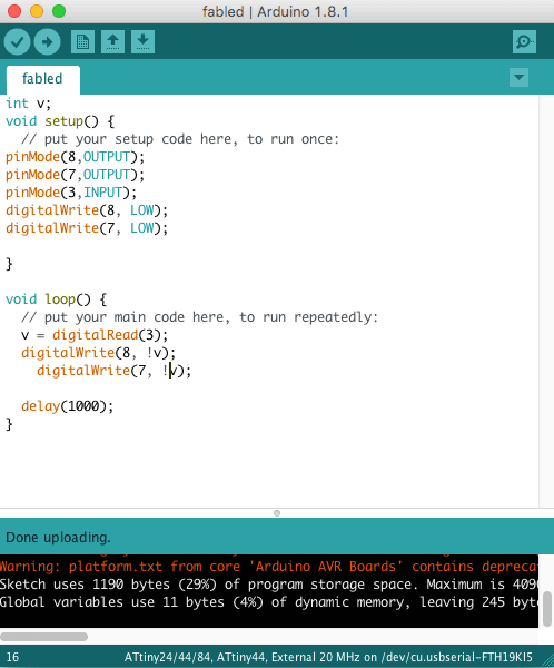 Now we burn the bootleader. The output message was correct, "we did it!!!, I said". While programming the board we found a little issue the pin 4 is reset and we can not change to use as normal pin OMG!!. But I have continued coding the board, so we can turn on the leds, but we can not read the pin 4 from the source code. When we press the button, the circuit will reset.