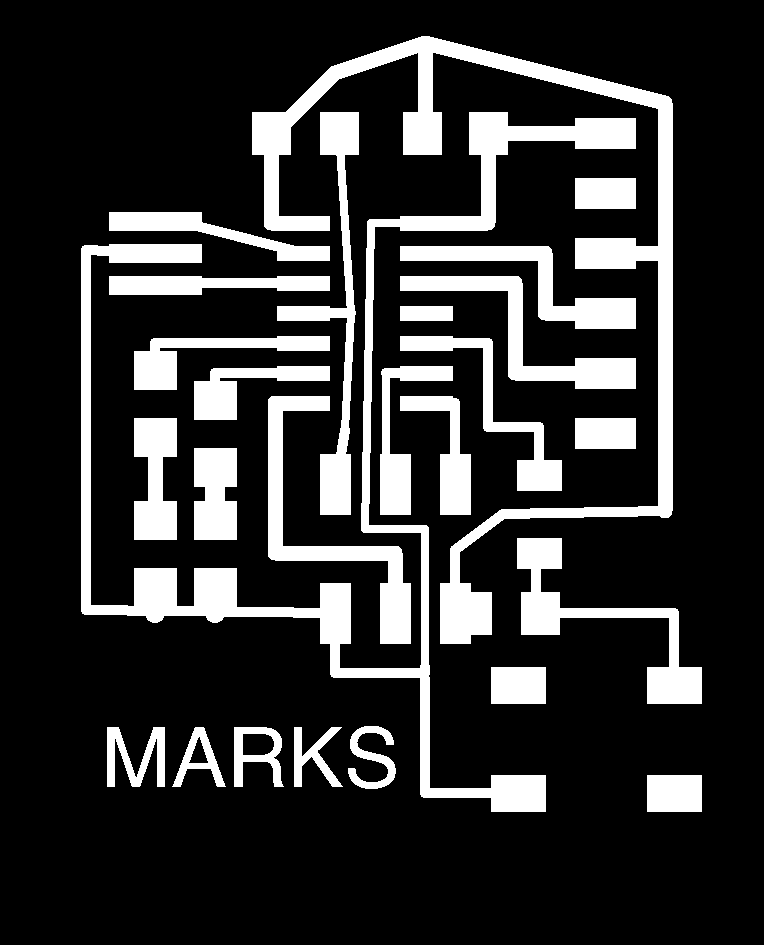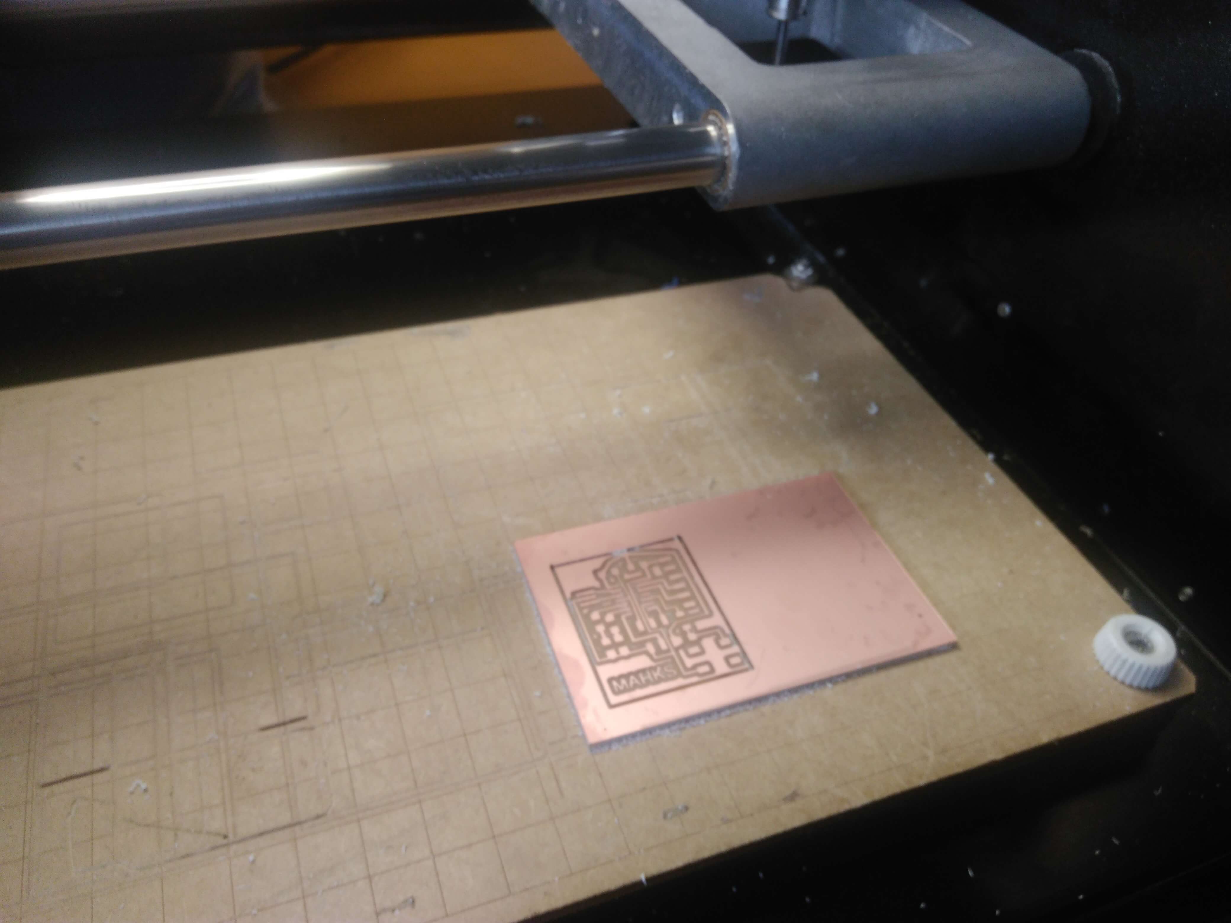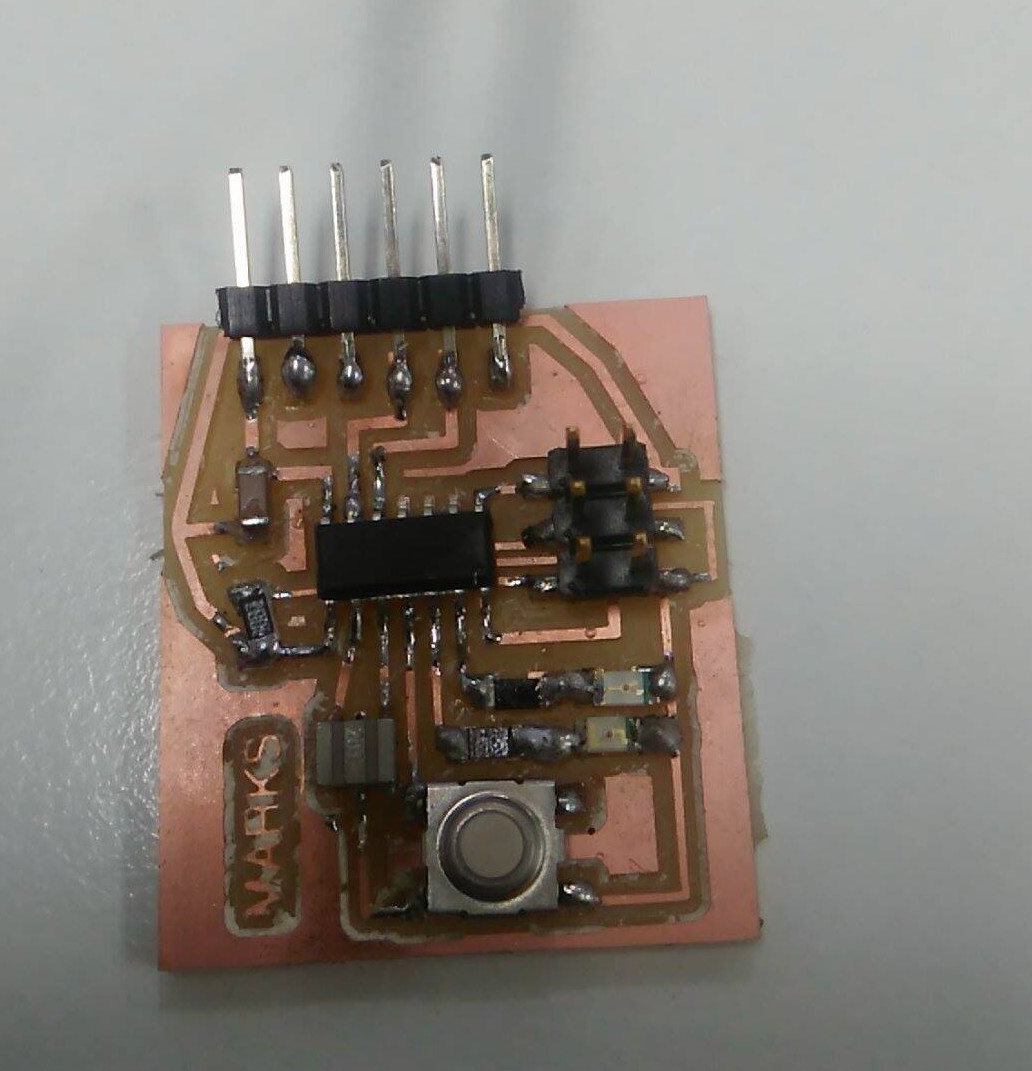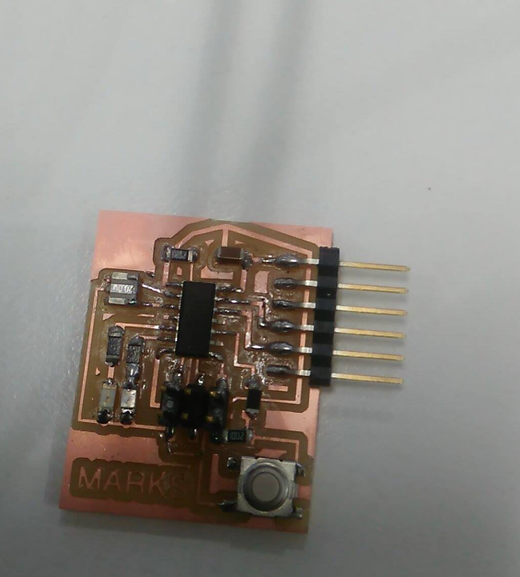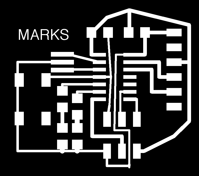 The parameters used in the grid was 0.005", the width of cooper track that I considered was different in the border I consider 0.024", line parallels with 0.016" and the line wich passing under the chip has 0.012". In the next assigments I am going to use a unique size. The design was completed to export in 600 dpi with monochrome color, but we invert the color to use in Roland MDX.20. Finally, the traces image cutted in Roland machine and soldering elements.