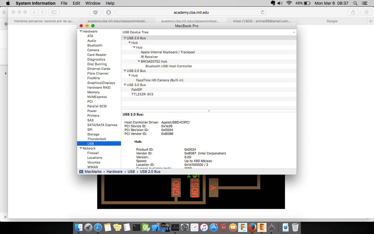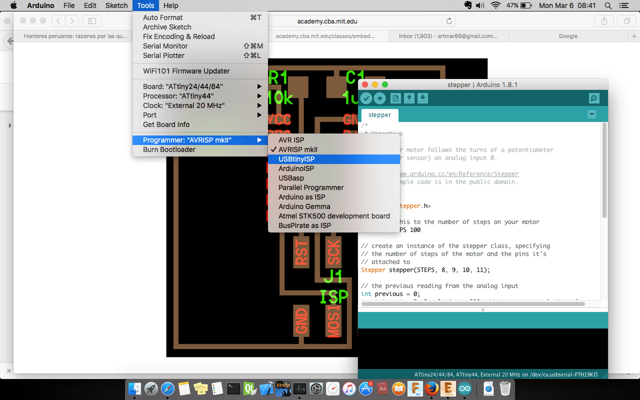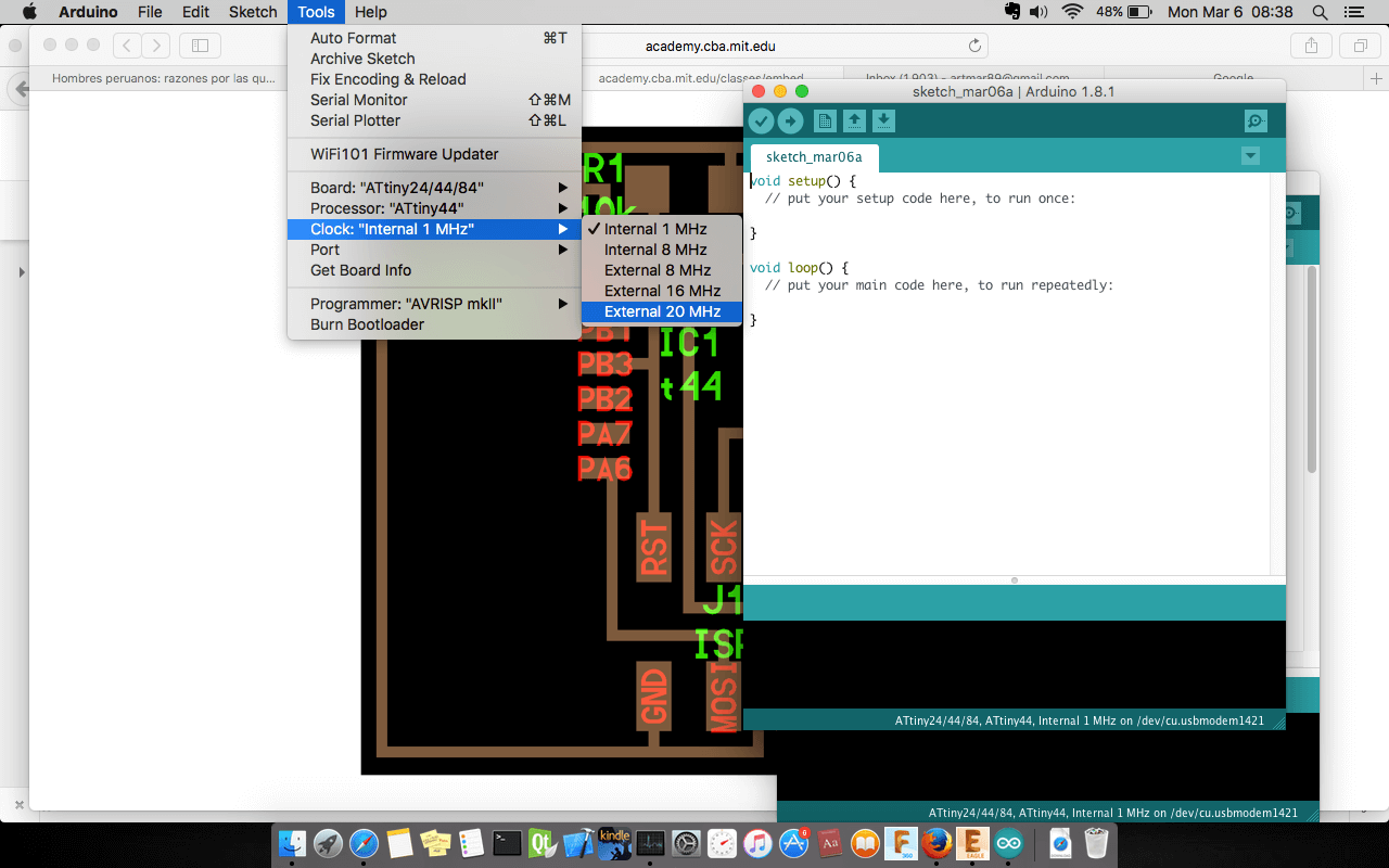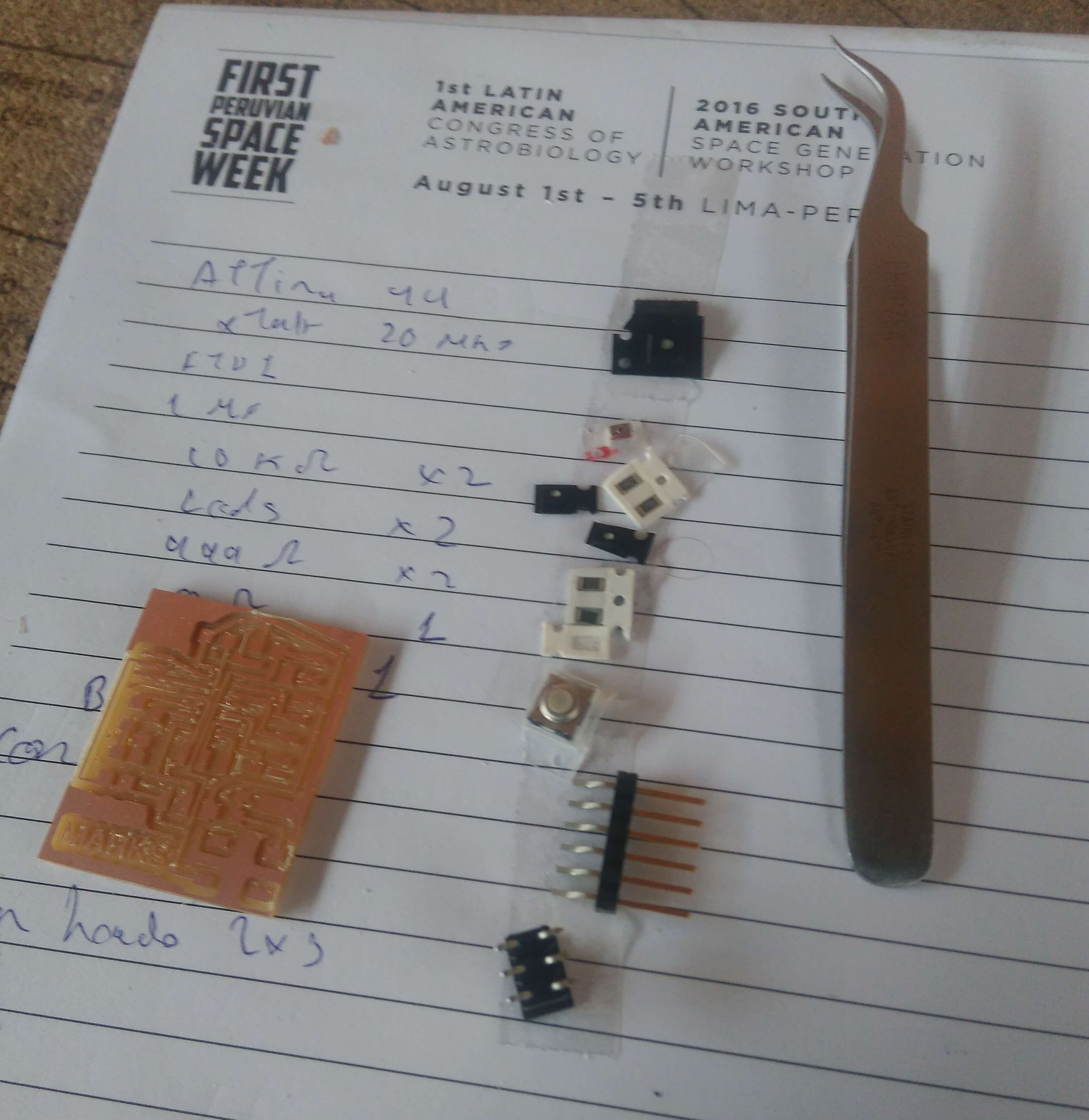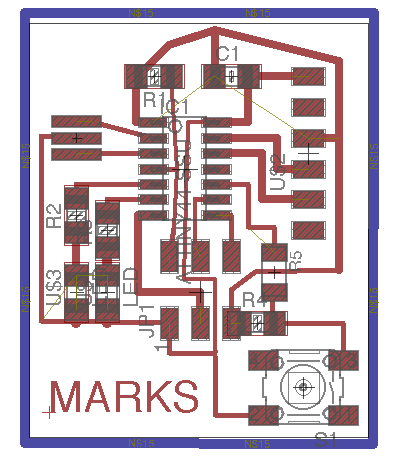 The parameters used in the grid was 0.005", the width of cooper track that I considered was different in the border I consider 0.024", line parallels with 0.016" and the line wich passing under the chip has 0.012". In the next assigments I am going to use a unique size. The design was completed to export in 600 dpi with monochrome color, but we invert the color to use in Roland MDX.20. Finally, the traces image cutted in Roland machine and soldering elements.