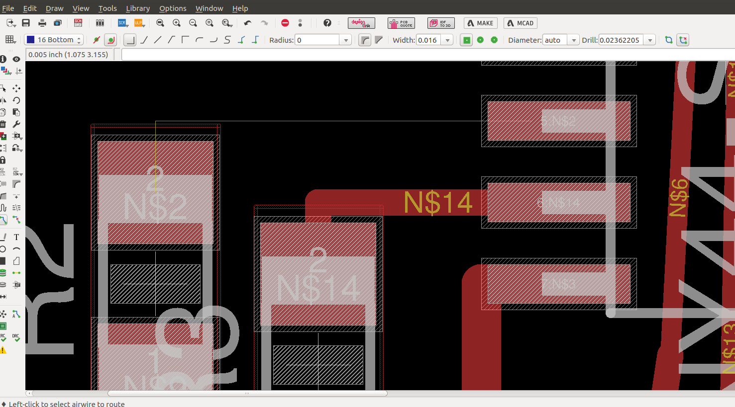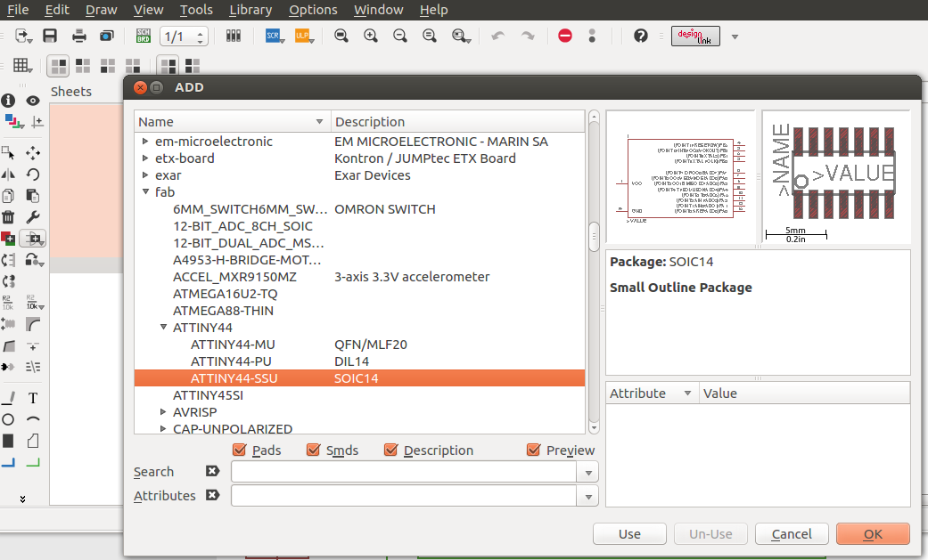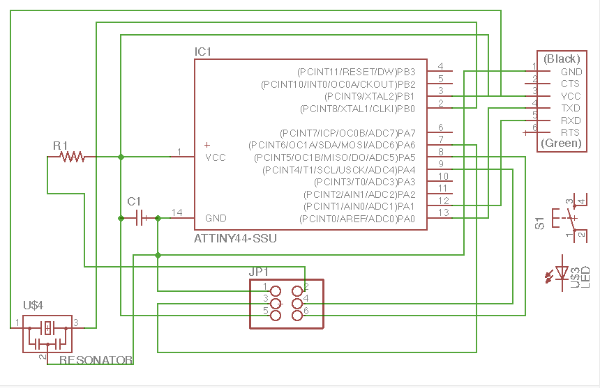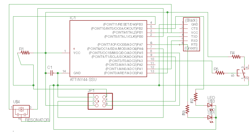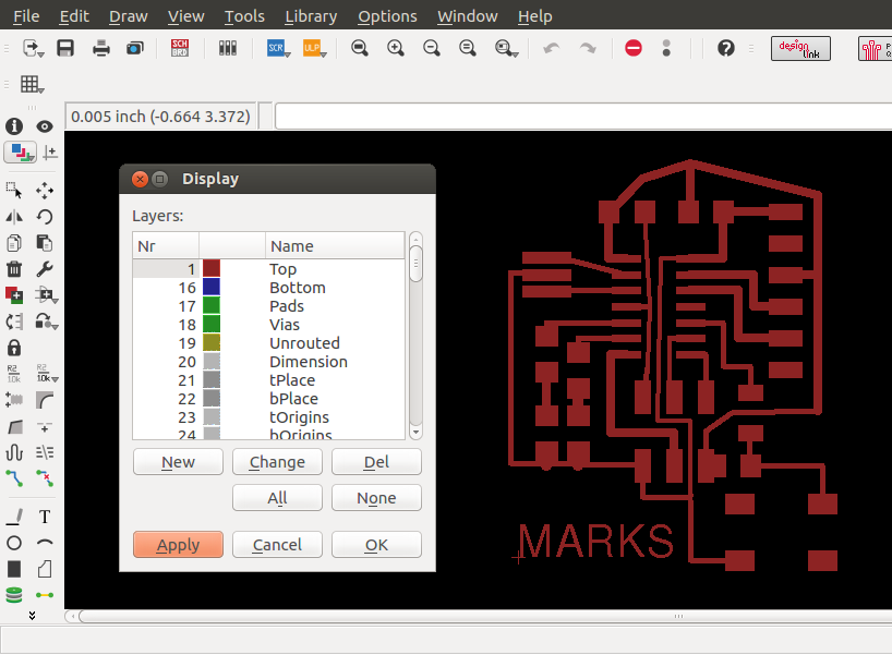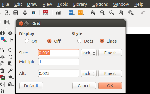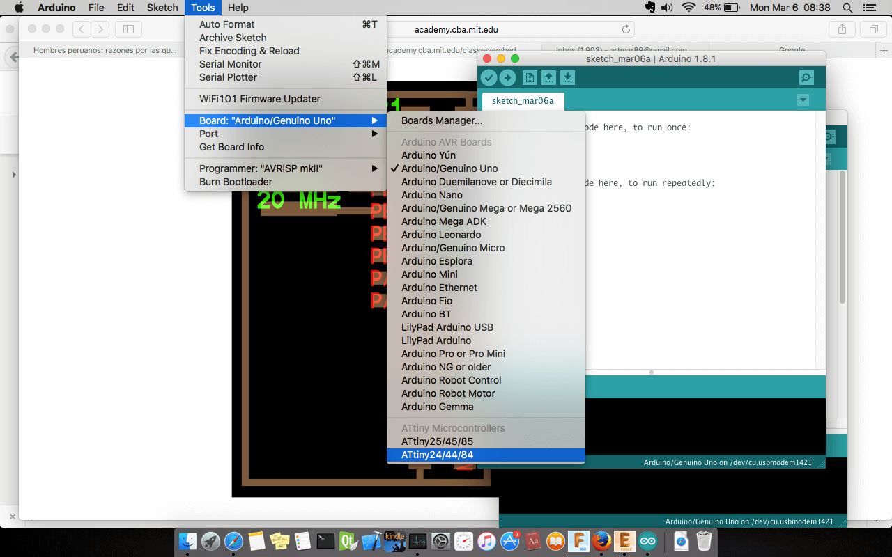 The parameters used in the grid was 0.005", the width of cooper track that I considered was different in the border I consider 0.024", line parallels with 0.016" and the line wich passing under the chip has 0.012". In the next assigments I am going to use a unique size. The design was completed to export in 600 dpi with monochrome color, but we invert the color to use in Roland MDX.20. Finally, the traces image cutted in Roland machine and soldering elements.