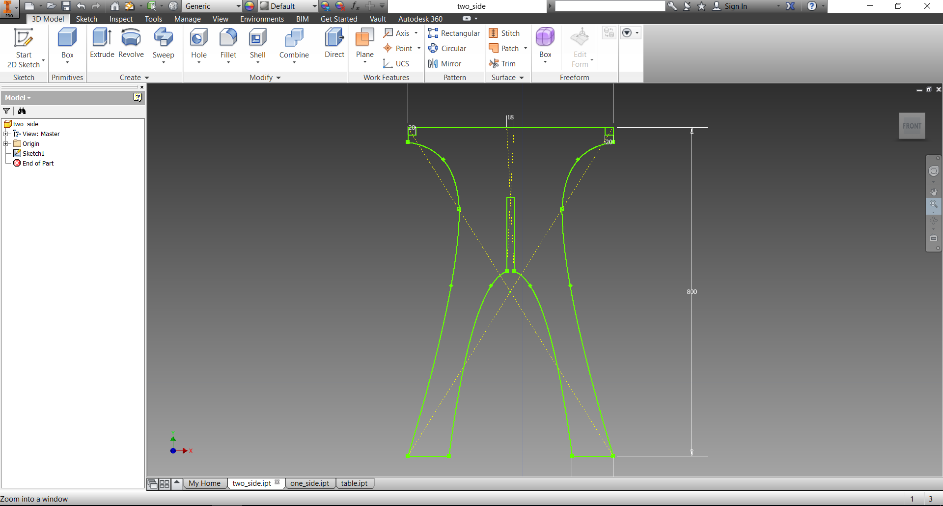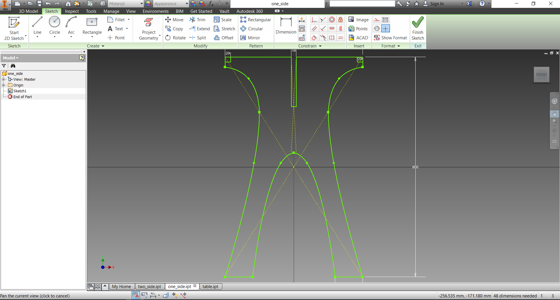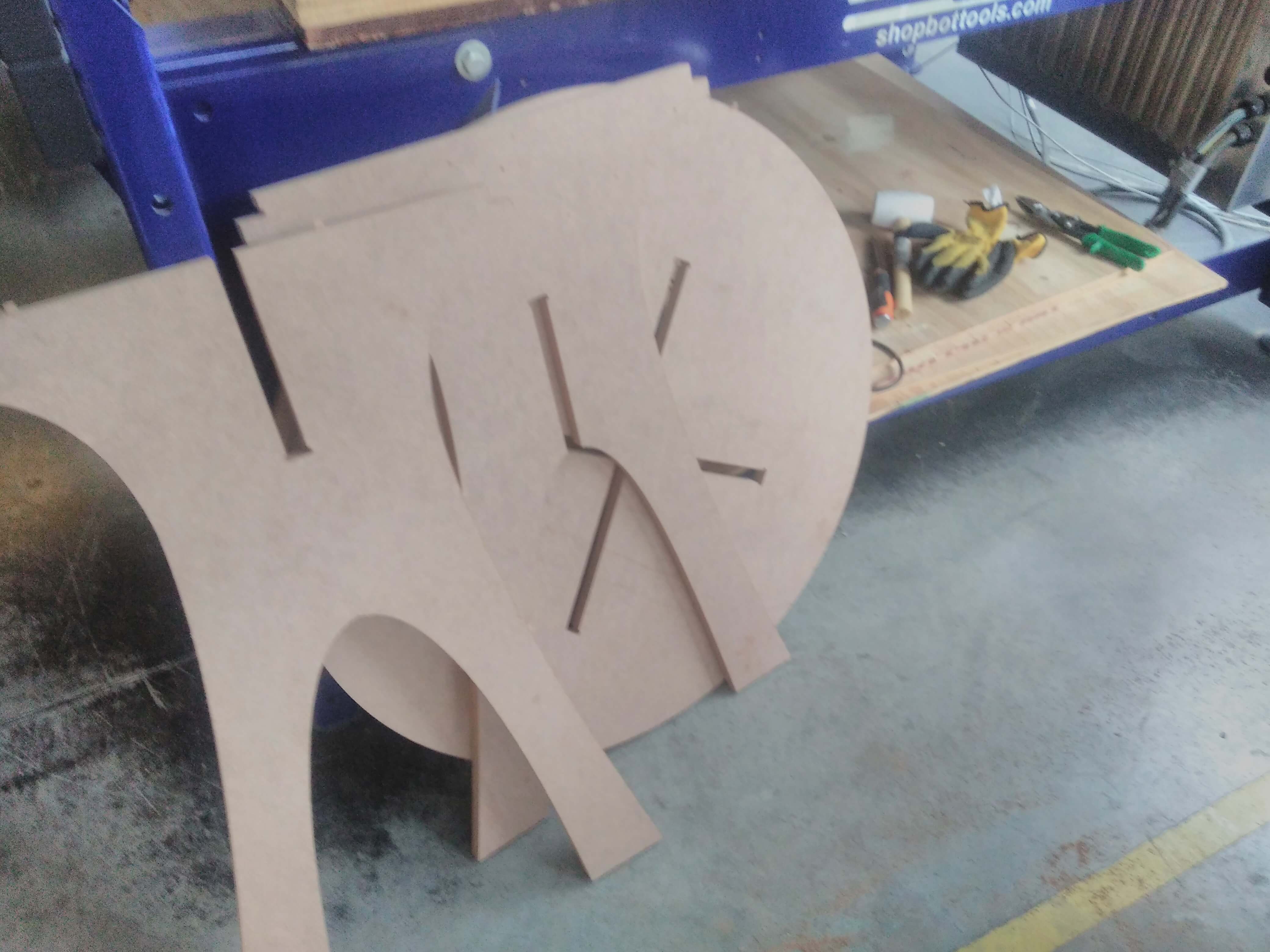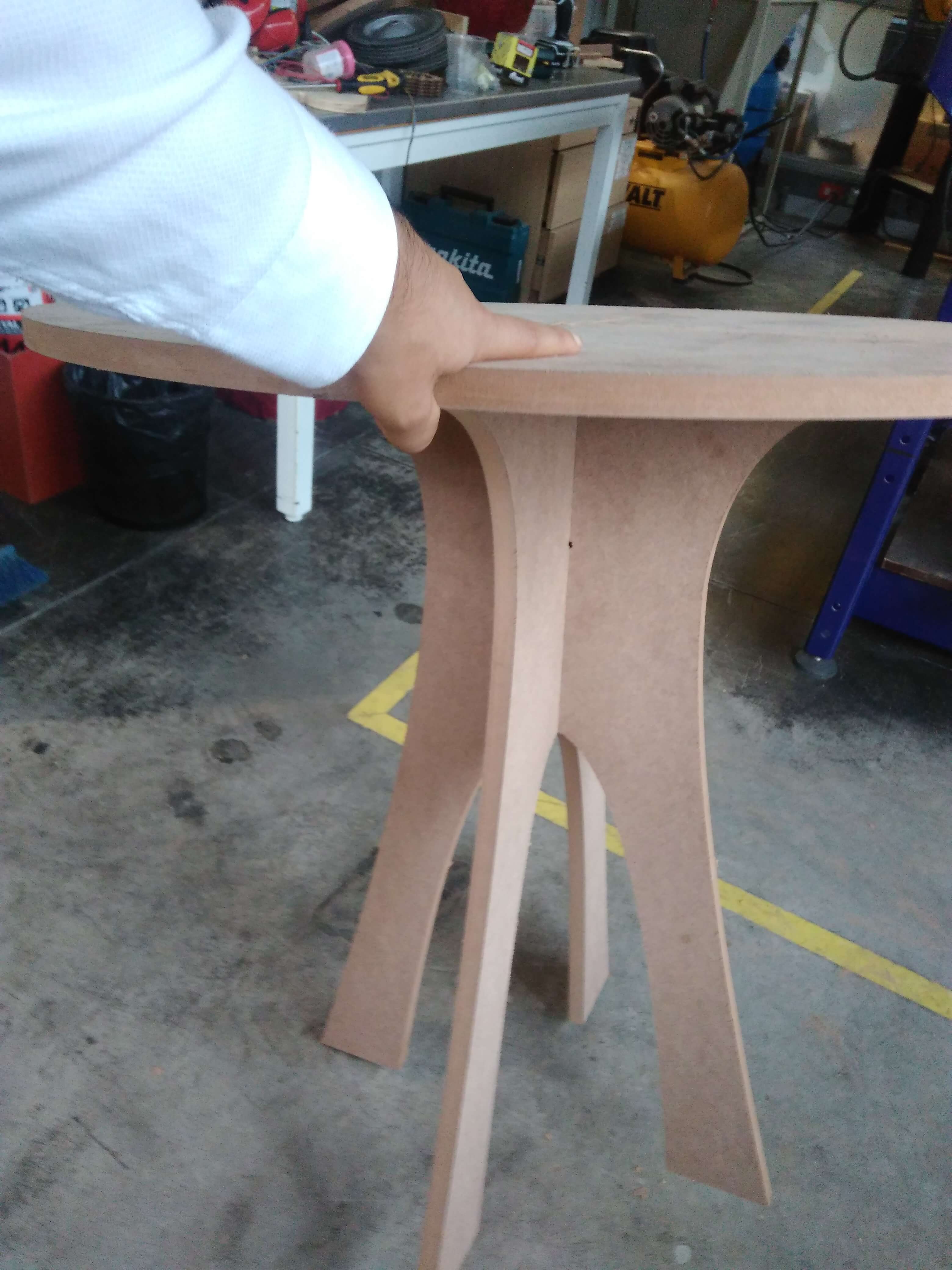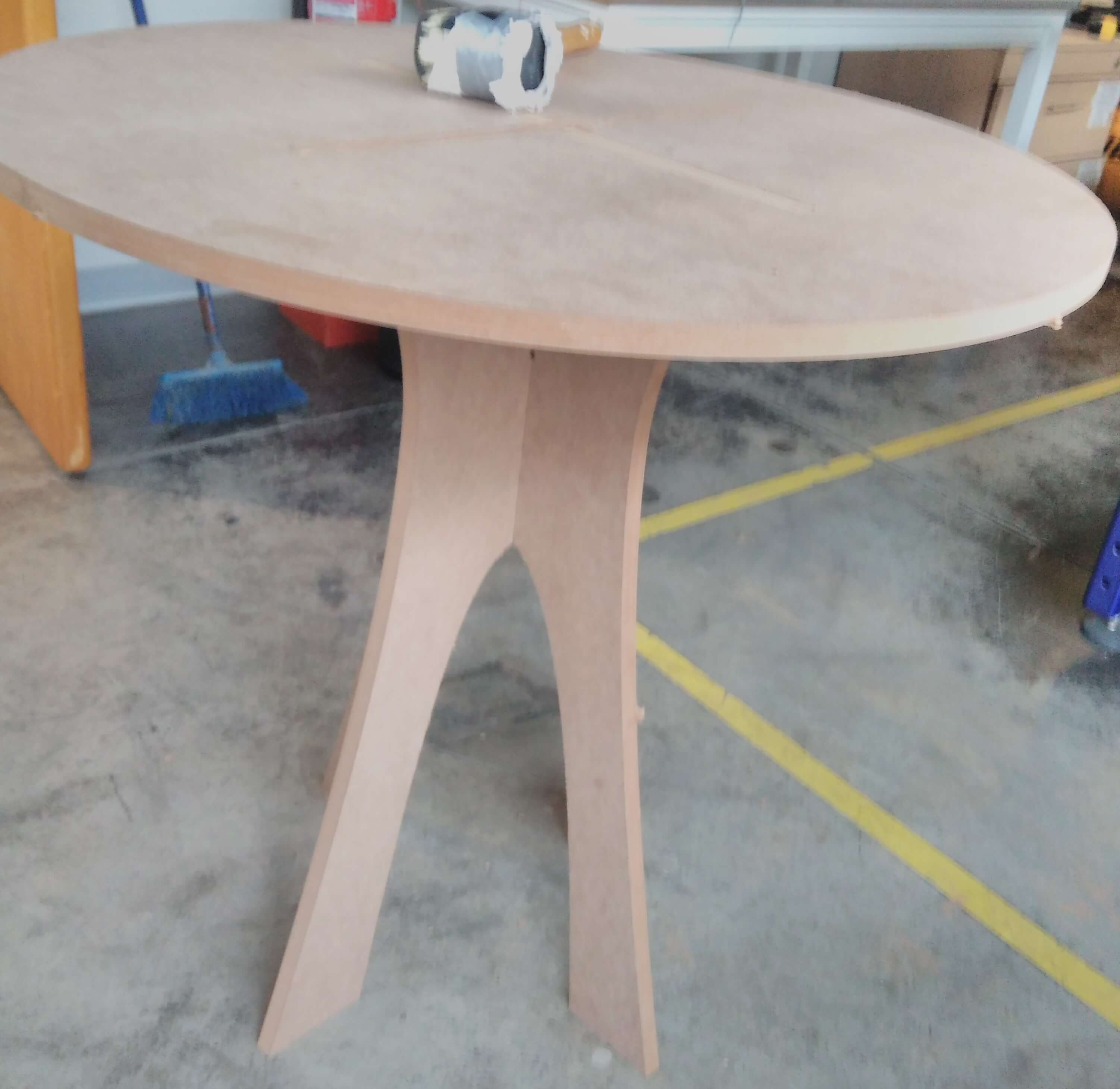 The idea was to create a circle table of three elements. The sketch in the left image belong here shows the idea. The design three elements joint male and female as supports, and the table. The support joins with the table. The project was designed to cut 18 mm MDF.