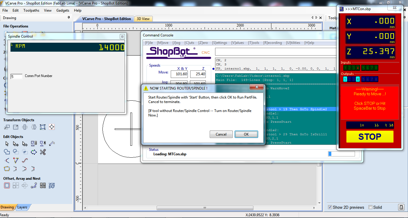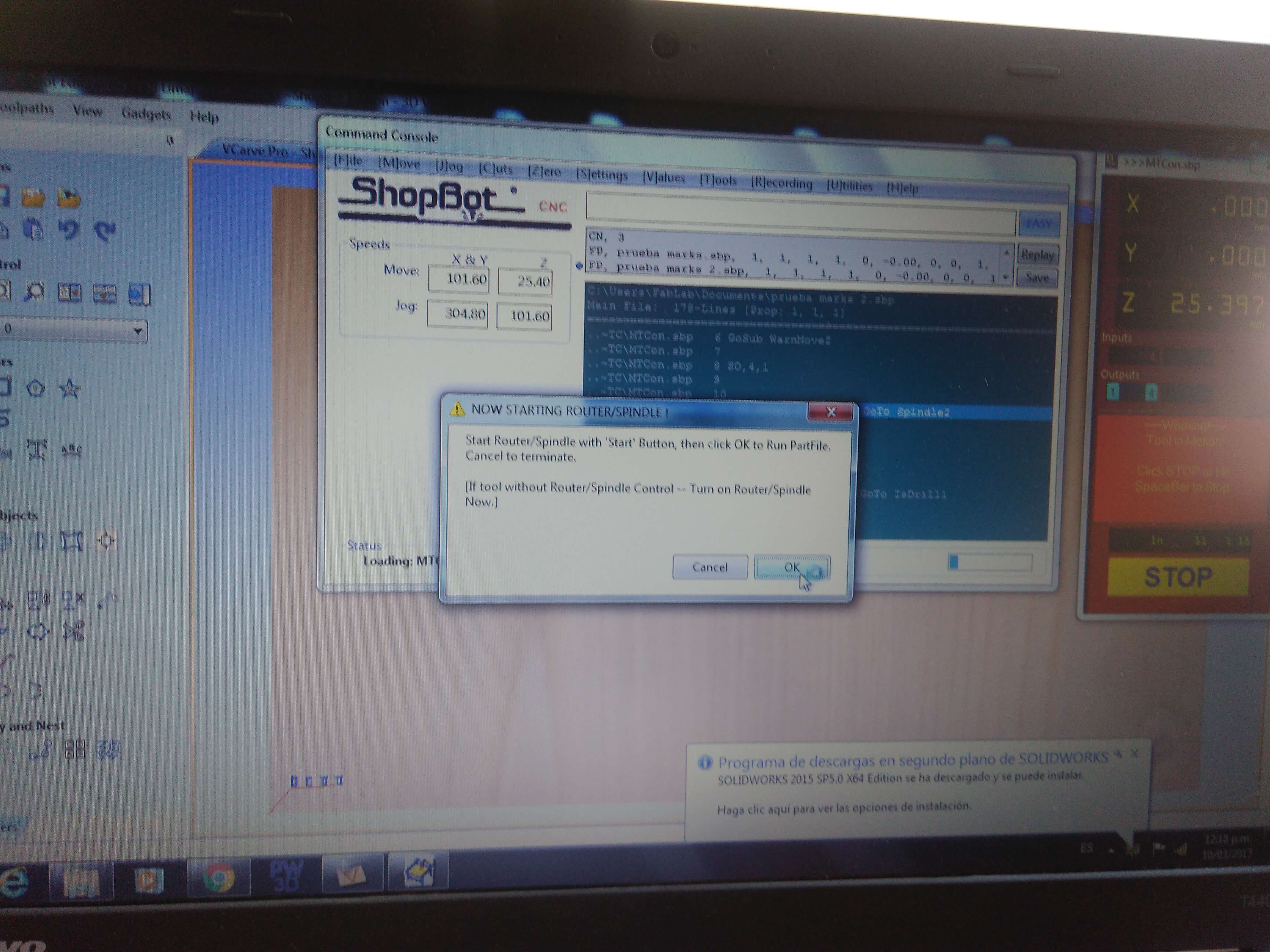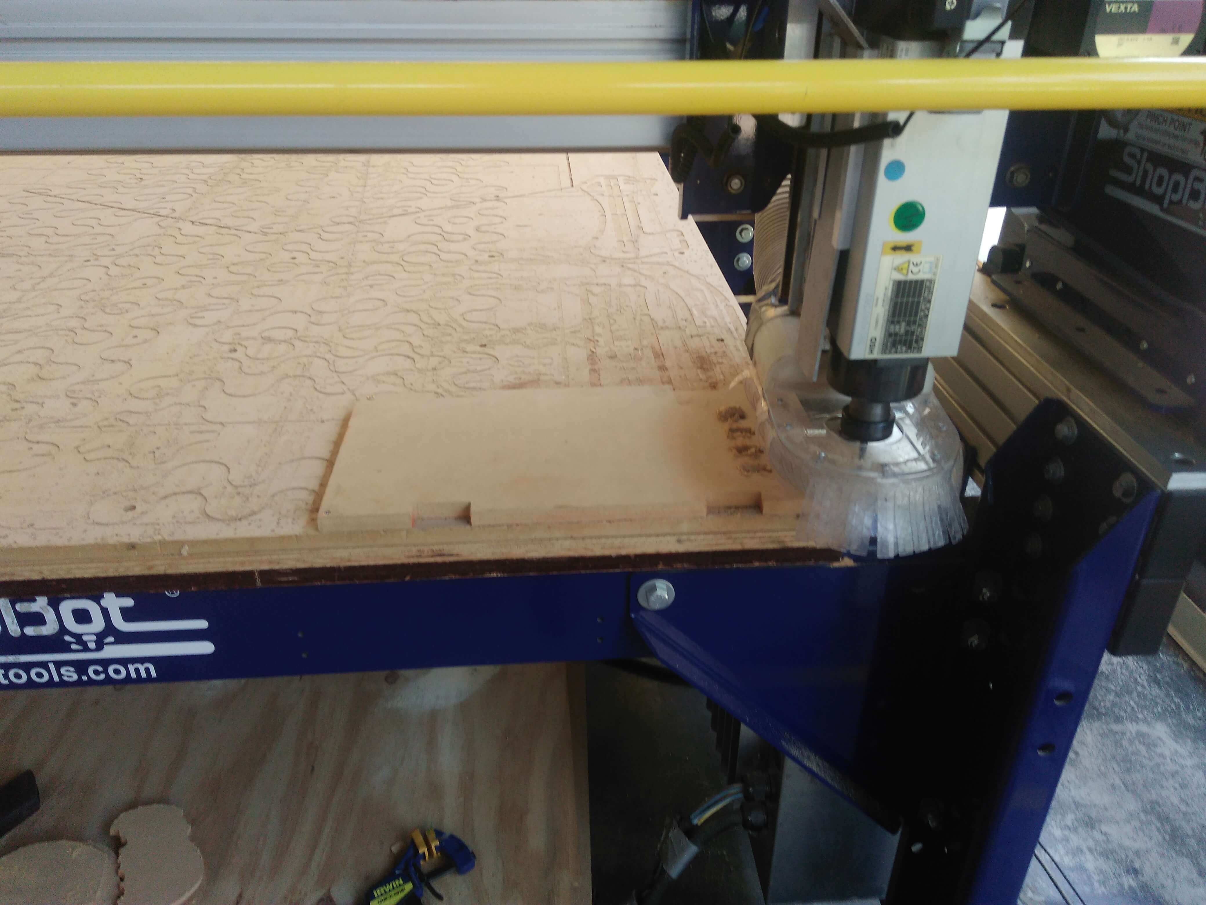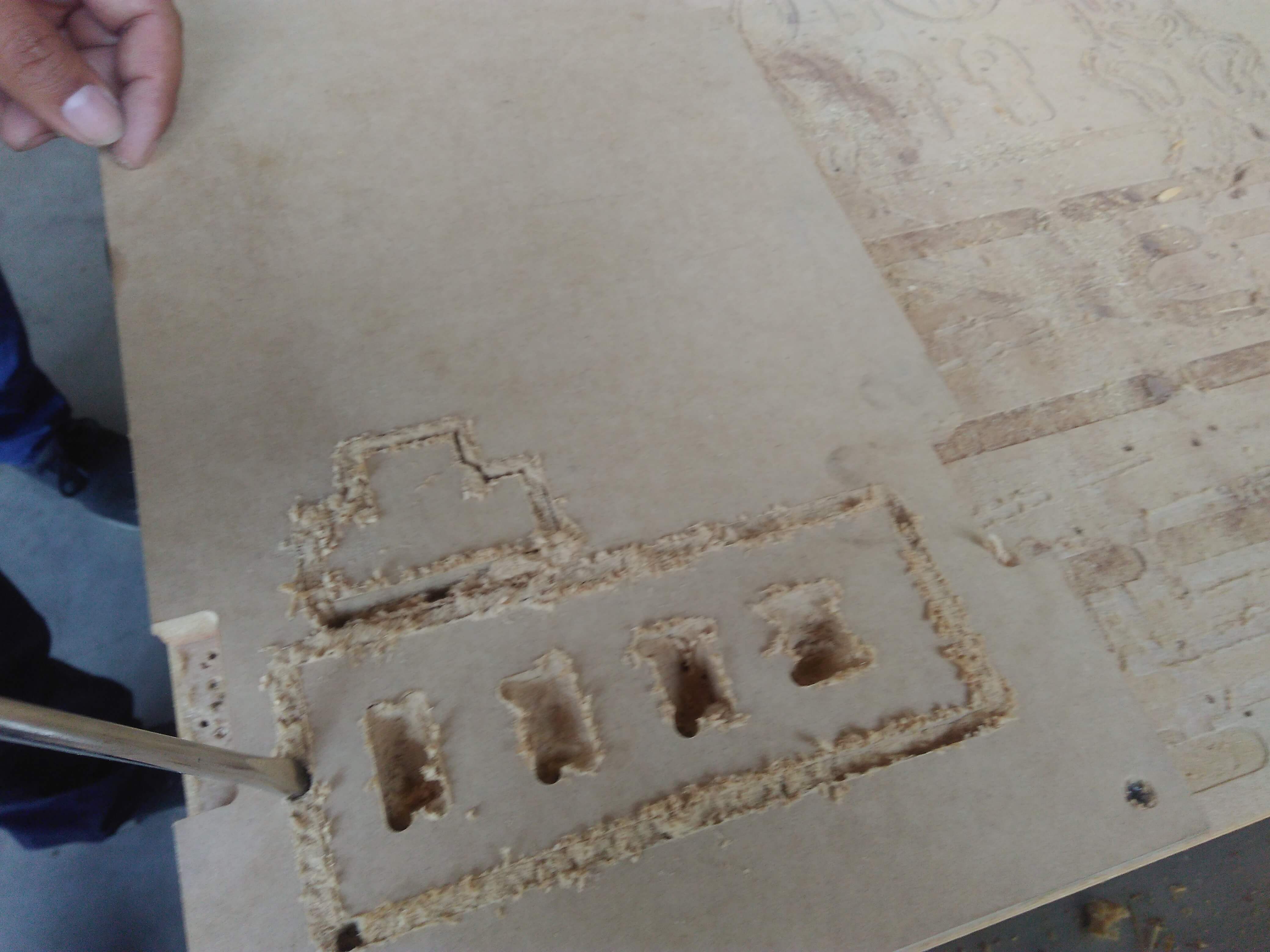 with the correct calibration we send our basic design. Firstly, we imported our .dxf file with Vcarve program which add tabs to assure that the piece out in the cutting process. Additionally, with the program adding semicircles with the program. After these details we must create the toolpath configuration with an specific drill, depth of cutting, and speed. Finally, we exported the file to process in the shopbot. With the shopbot software was launch and set the speed 14000 rpms and load the file, the program warned to press start button and wait a few seconds to start the cutting. So the machine was cutting!!! =)