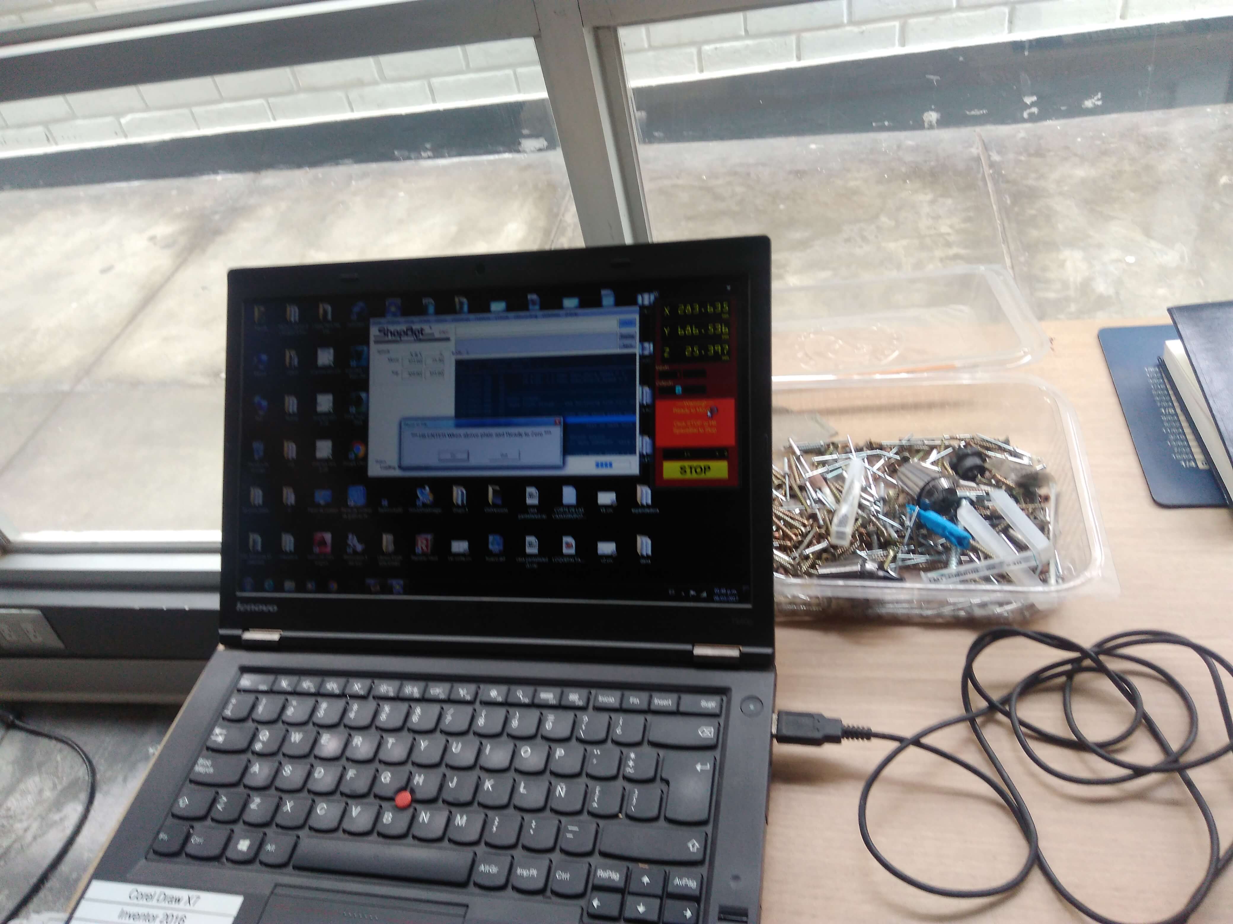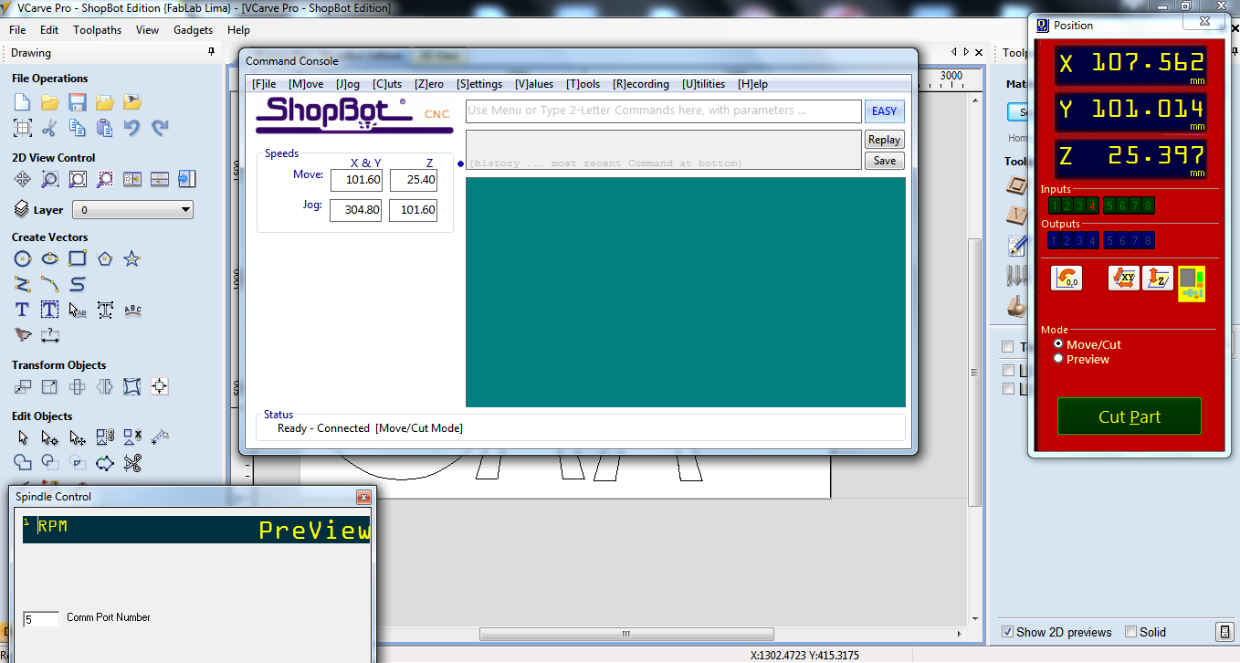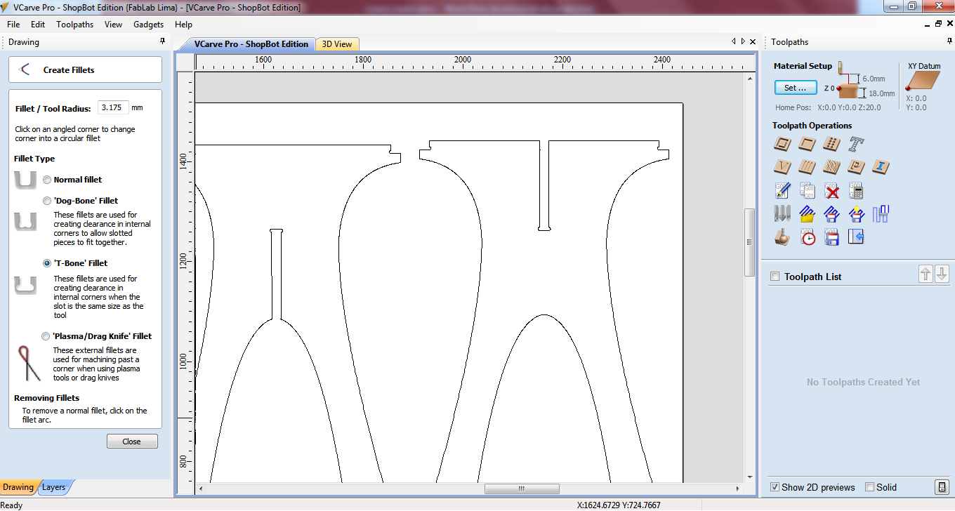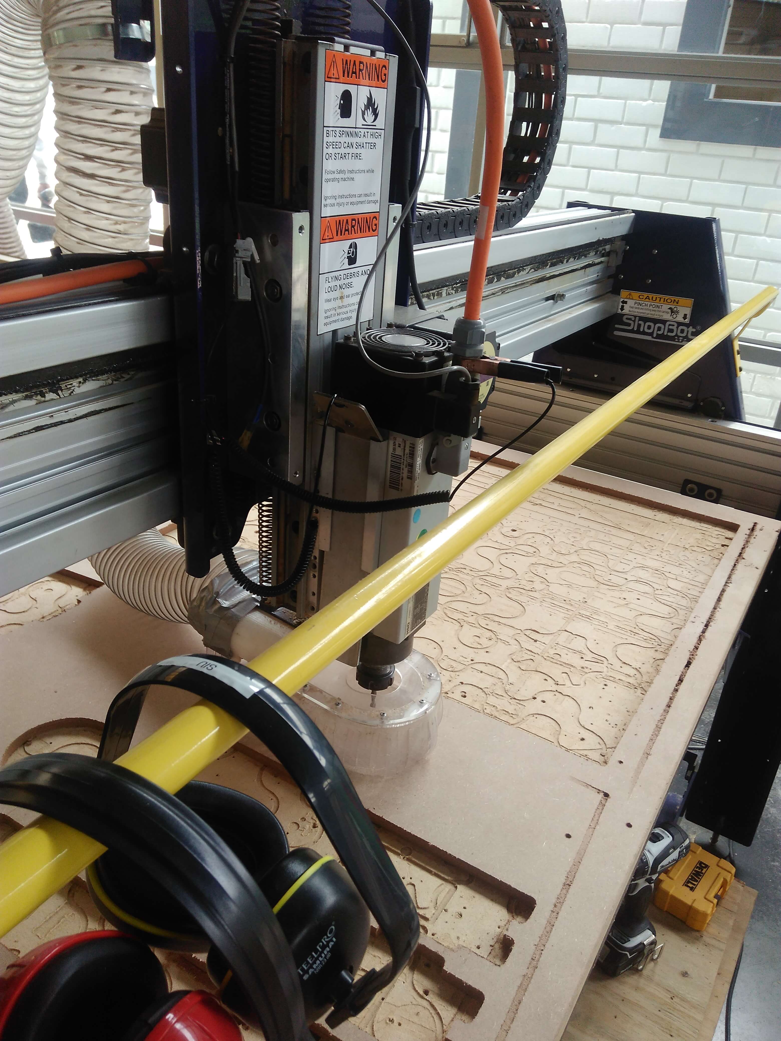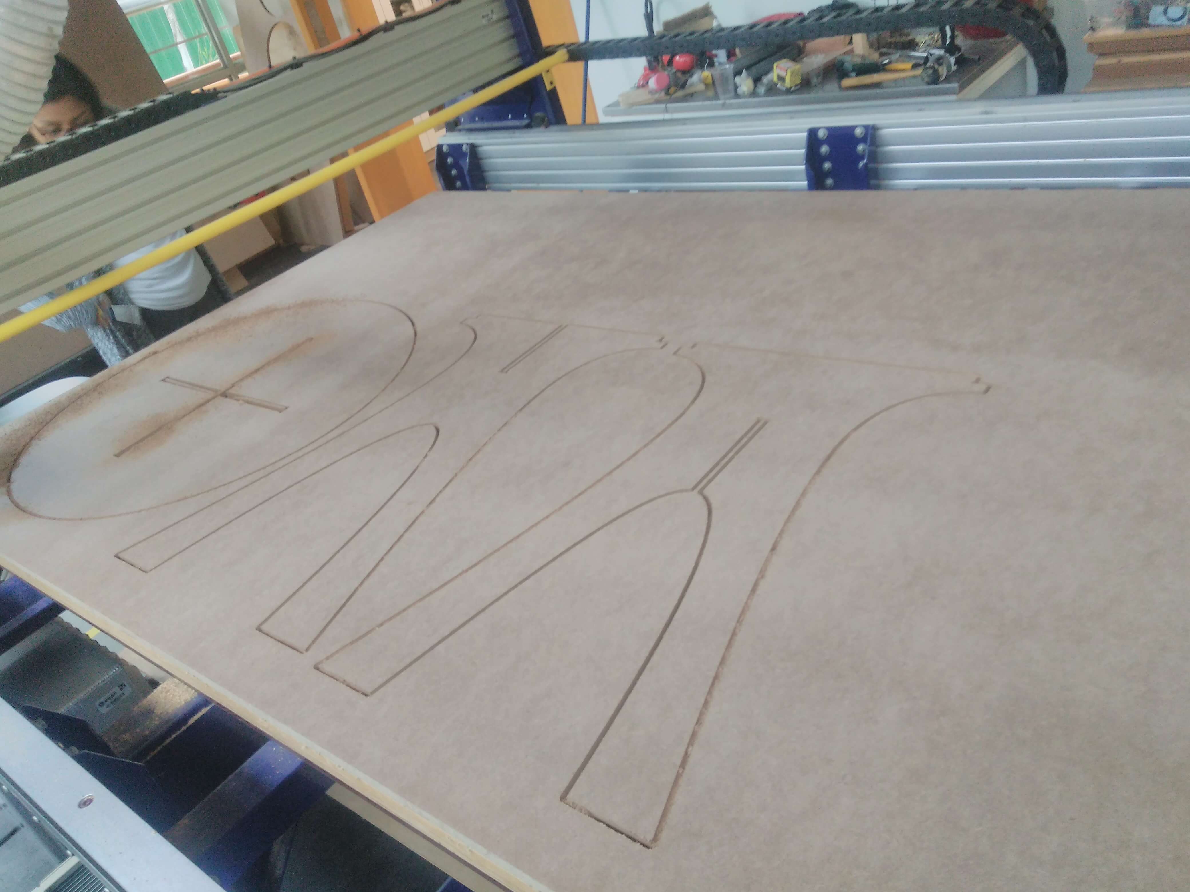 with the correct calibration we send our basic design. Firstly, we imported our .dxf file with Vcarve program which add tabs to assure that the piece out in the cutting process. Additionally, with the program adding semicircles with the program. After these details we must create the toolpath configuration with an specific drill, depth of cutting, and speed. Finally, we exported the file to process in the shopbot. With the shopbot software was launch and set the speed 14000 rpms and load the file, the program warned to press start button and wait a few seconds to start the cutting. So the machine was cutting!!! =)