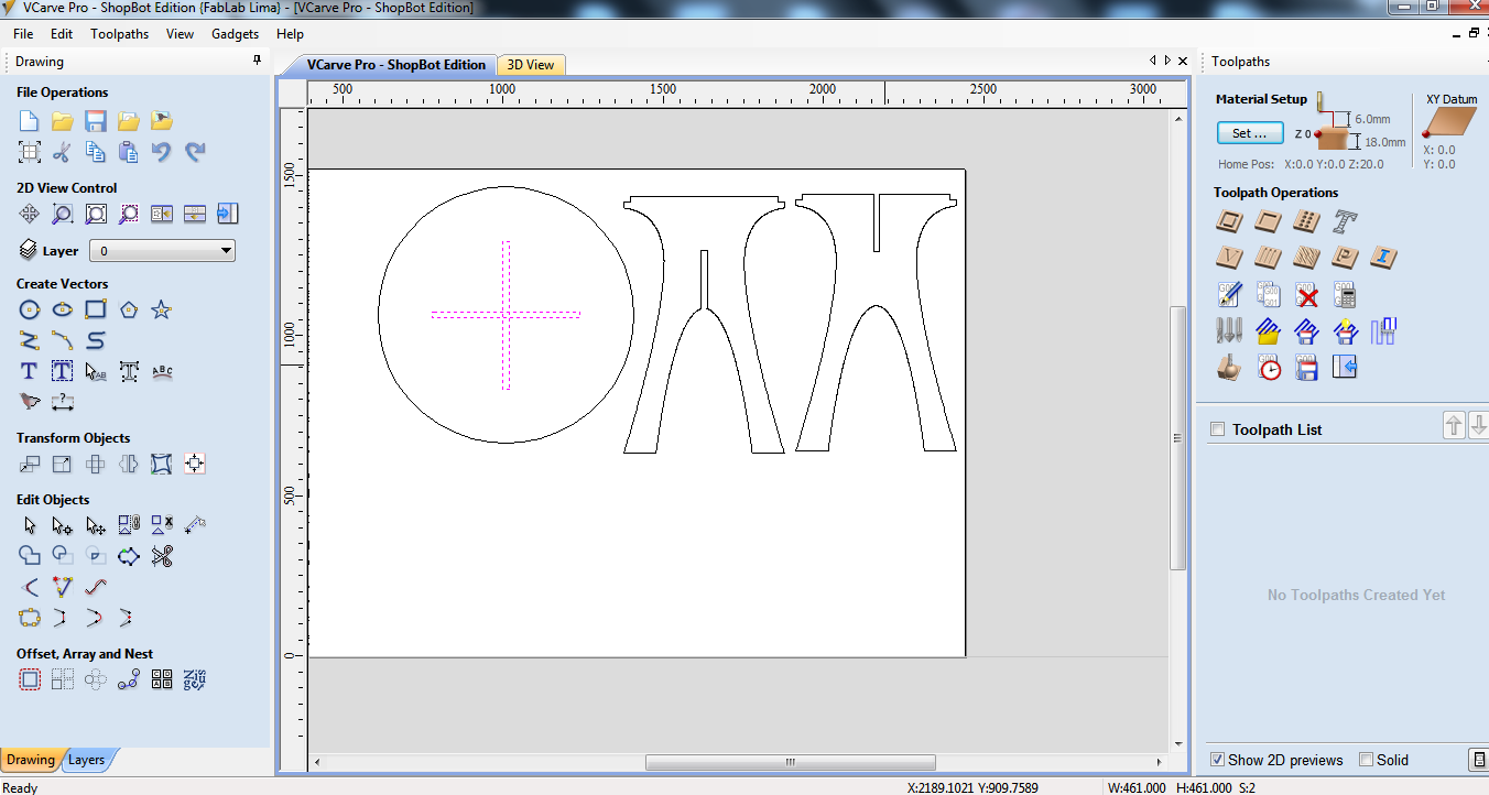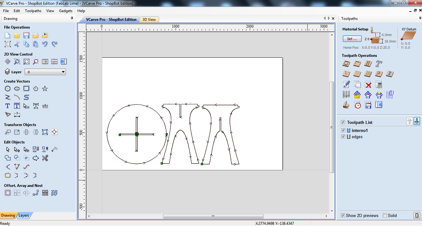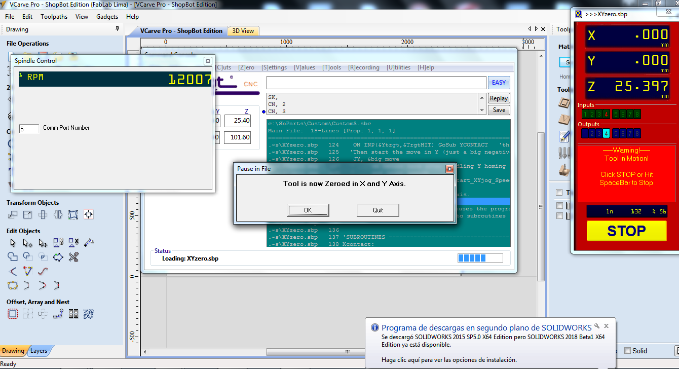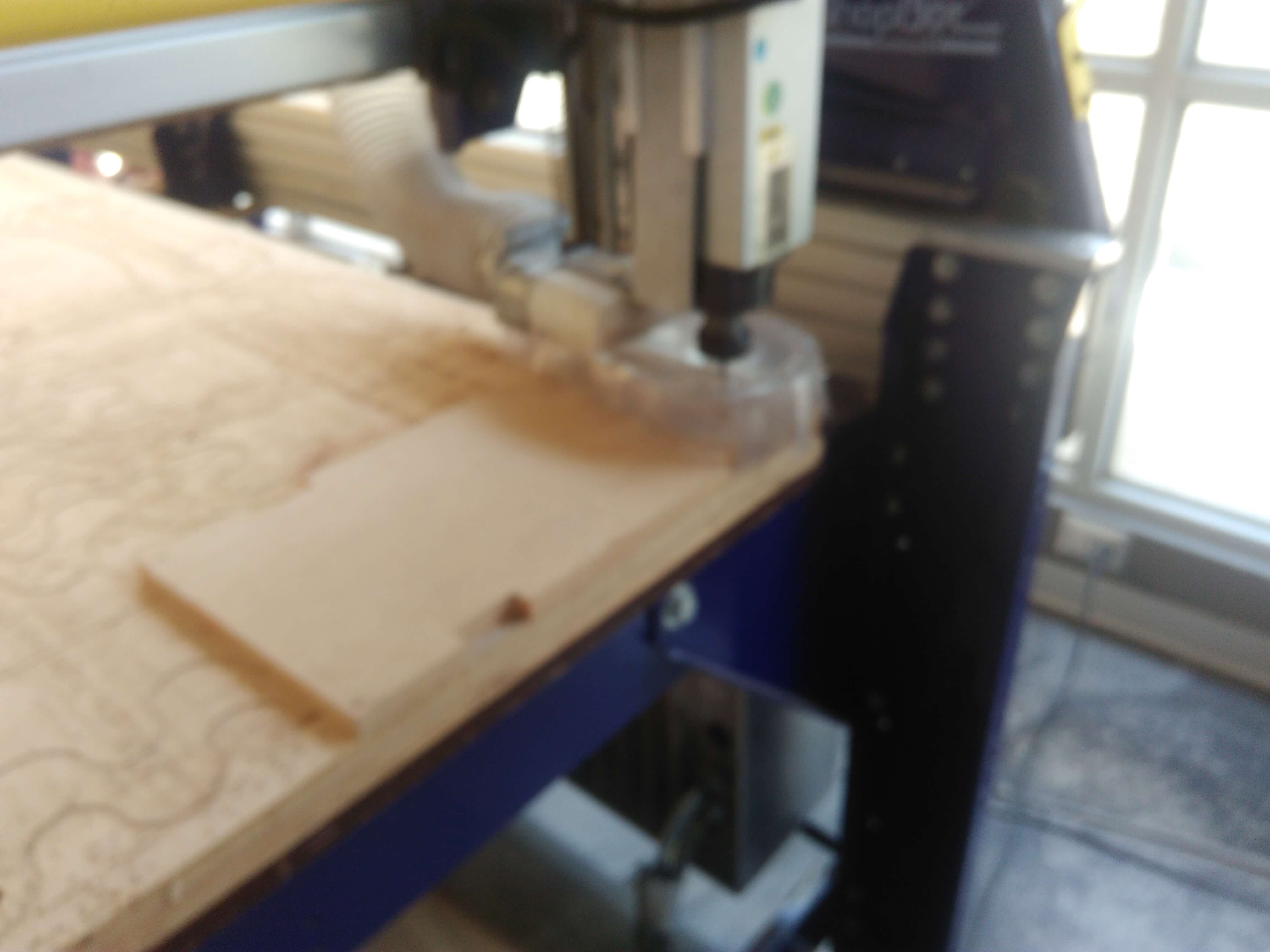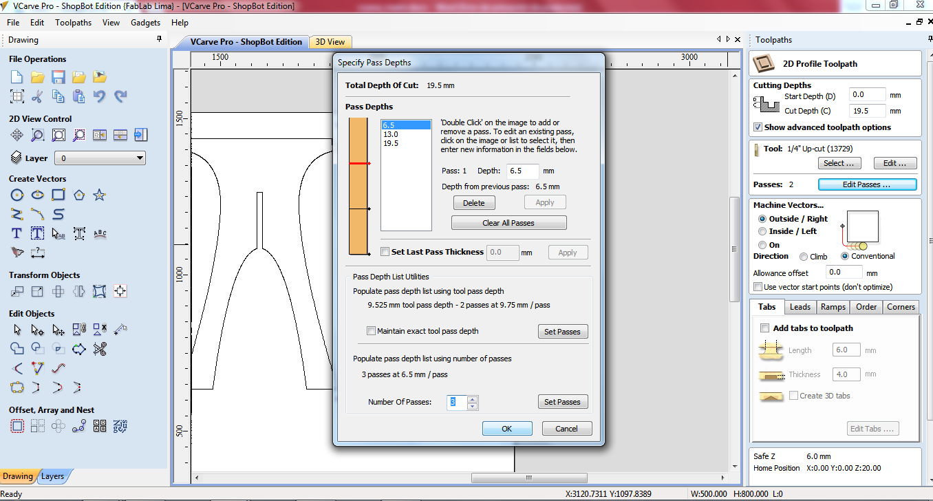 with the correct calibration we send our basic design. Firstly, we imported our .dxf file with Vcarve program which add tabs to assure that the piece out in the cutting process. Additionally, with the program adding semicircles with the program. After these details we must create the toolpath configuration with an specific drill, depth of cutting, and speed. Finally, we exported the file to process in the shopbot. With the shopbot software was launch and set the speed 14000 rpms and load the file, the program warned to press start button and wait a few seconds to start the cutting. So the machine was cutting!!! =)