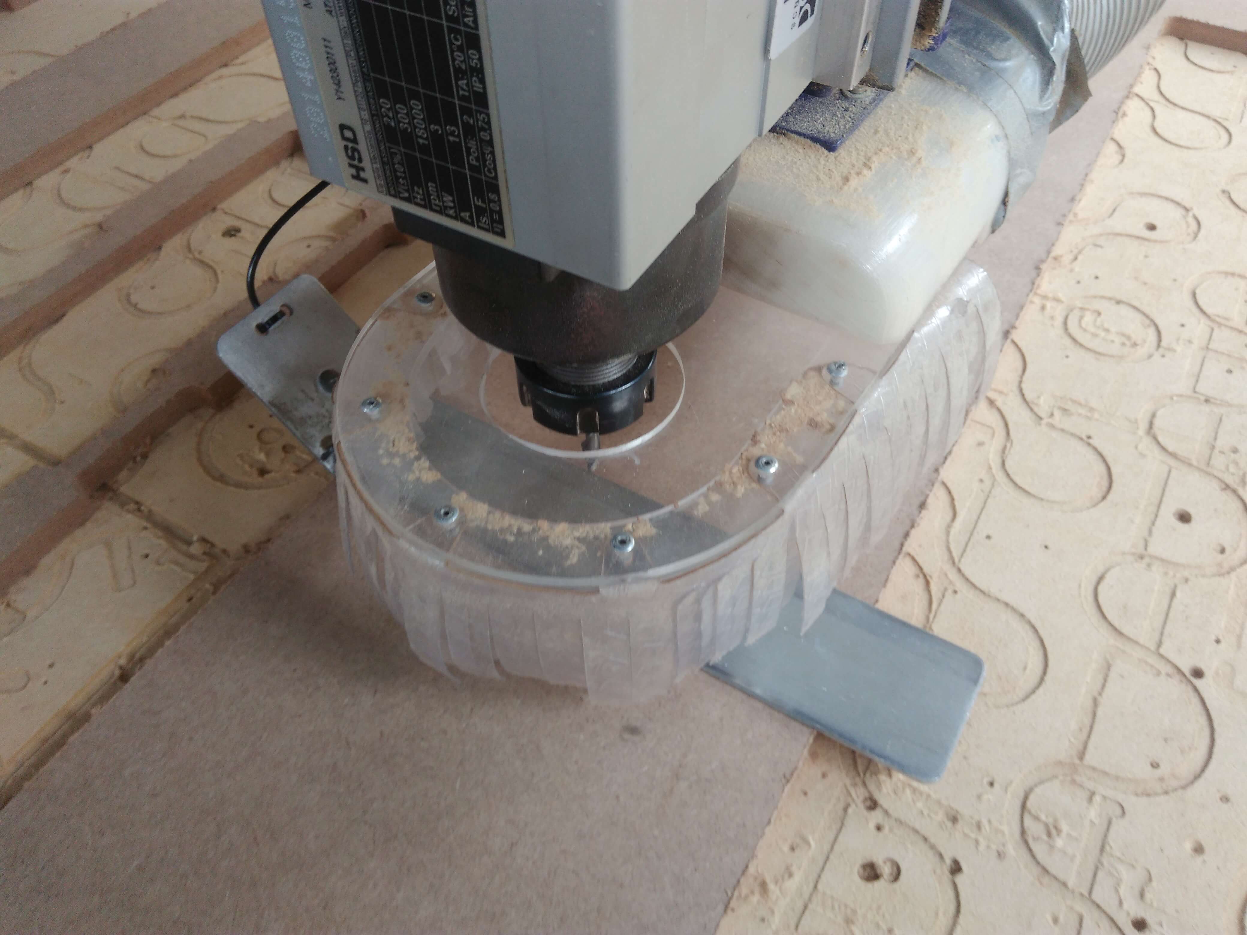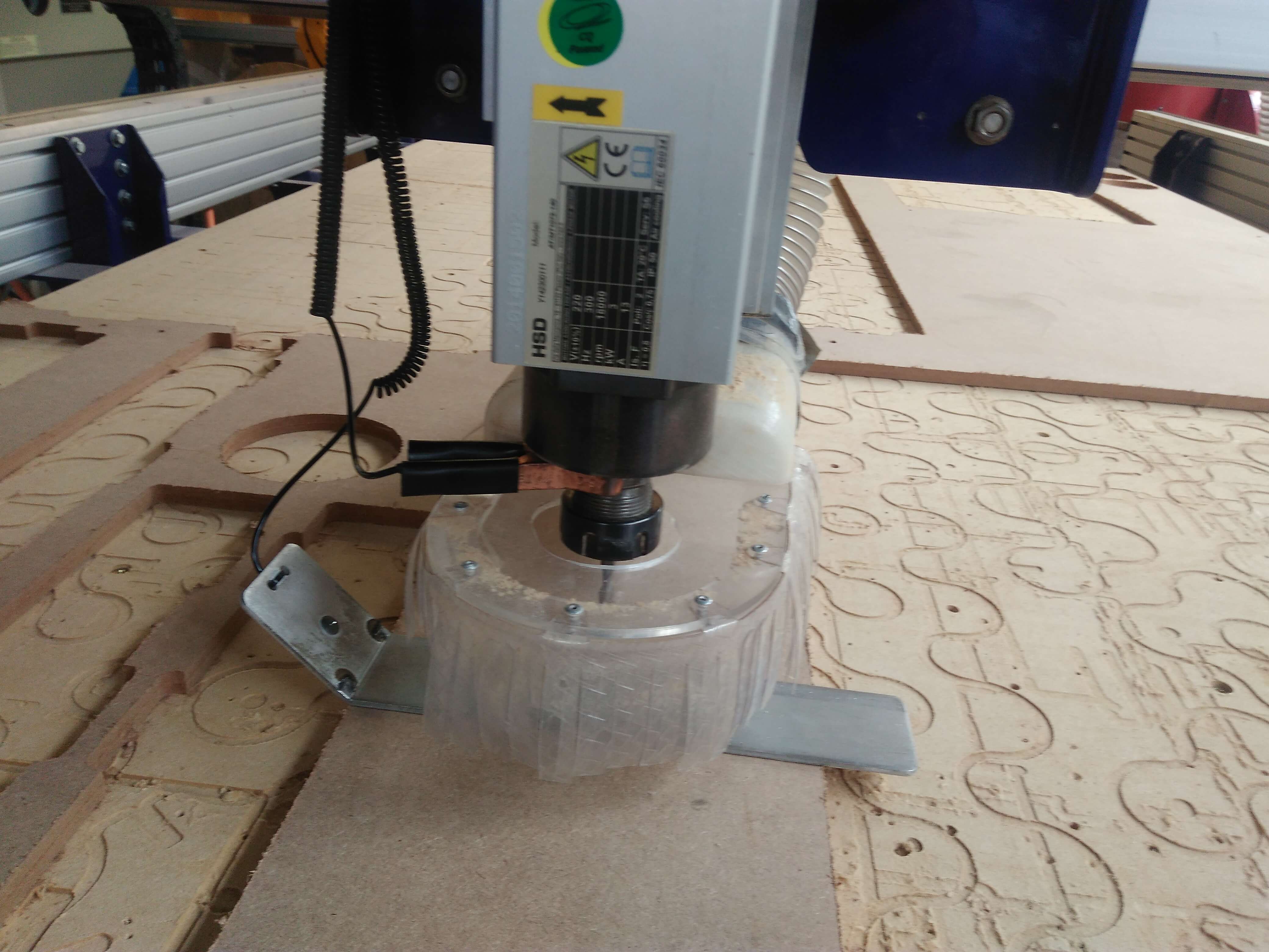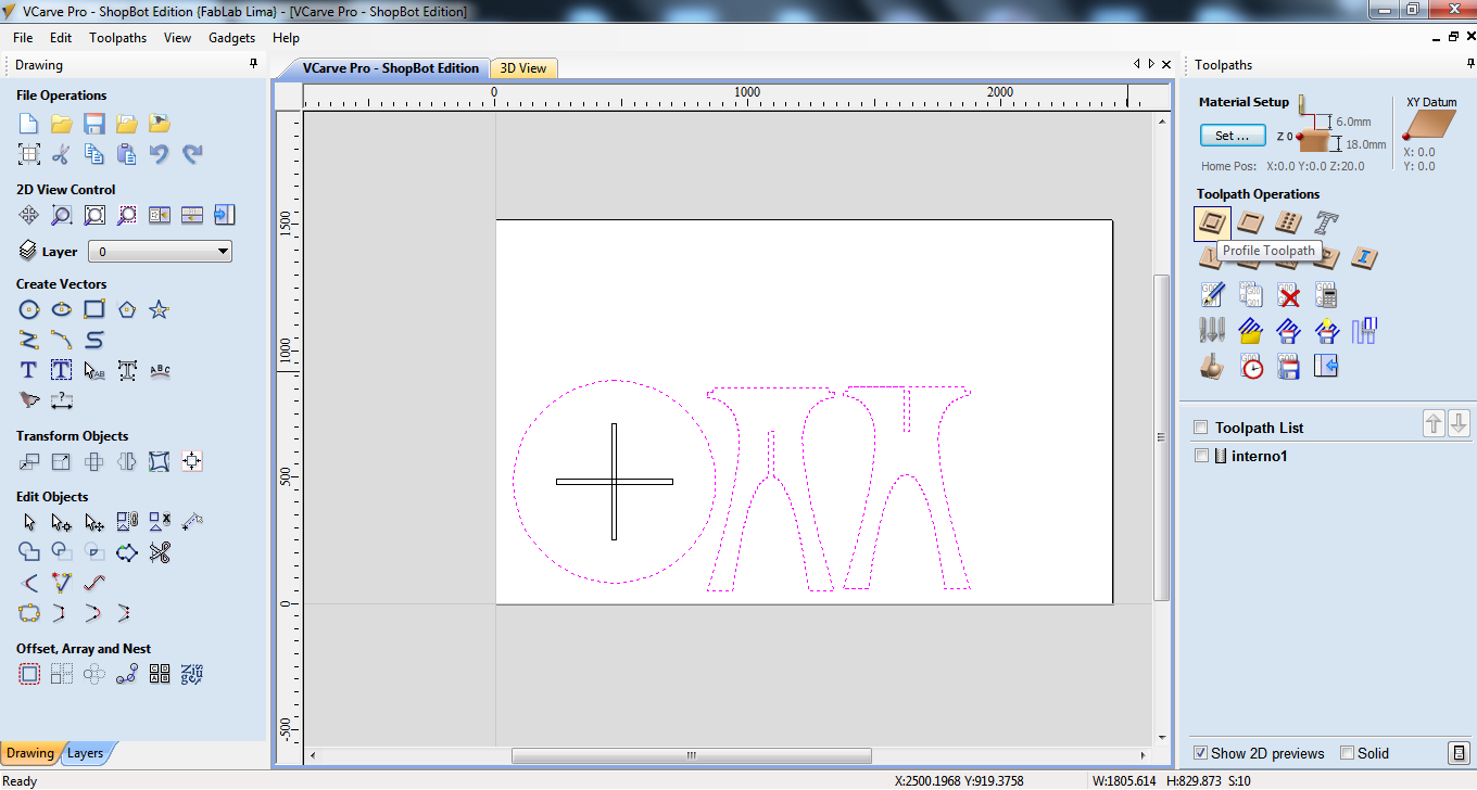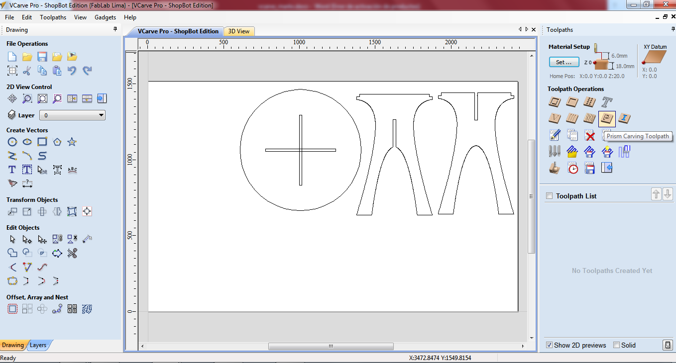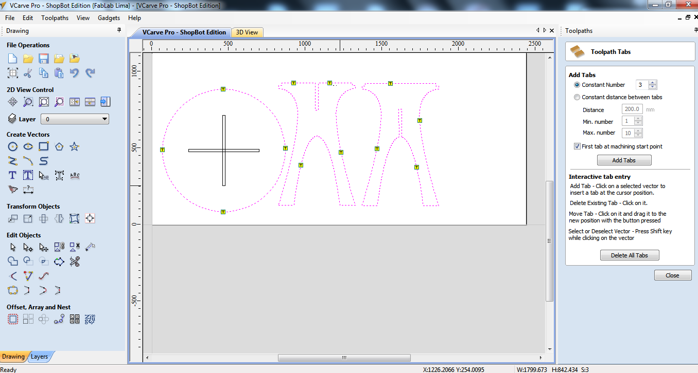 with the correct calibration we send our basic design. Firstly, we imported our .dxf file with Vcarve program which add tabs to assure that the piece out in the cutting process. Additionally, with the program adding semicircles with the program. After these details we must create the toolpath configuration with an specific drill, depth of cutting, and speed. Finally, we exported the file to process in the shopbot. With the shopbot software was launch and set the speed 14000 rpms and load the file, the program warned to press start button and wait a few seconds to start the cutting. So the machine was cutting!!! =)