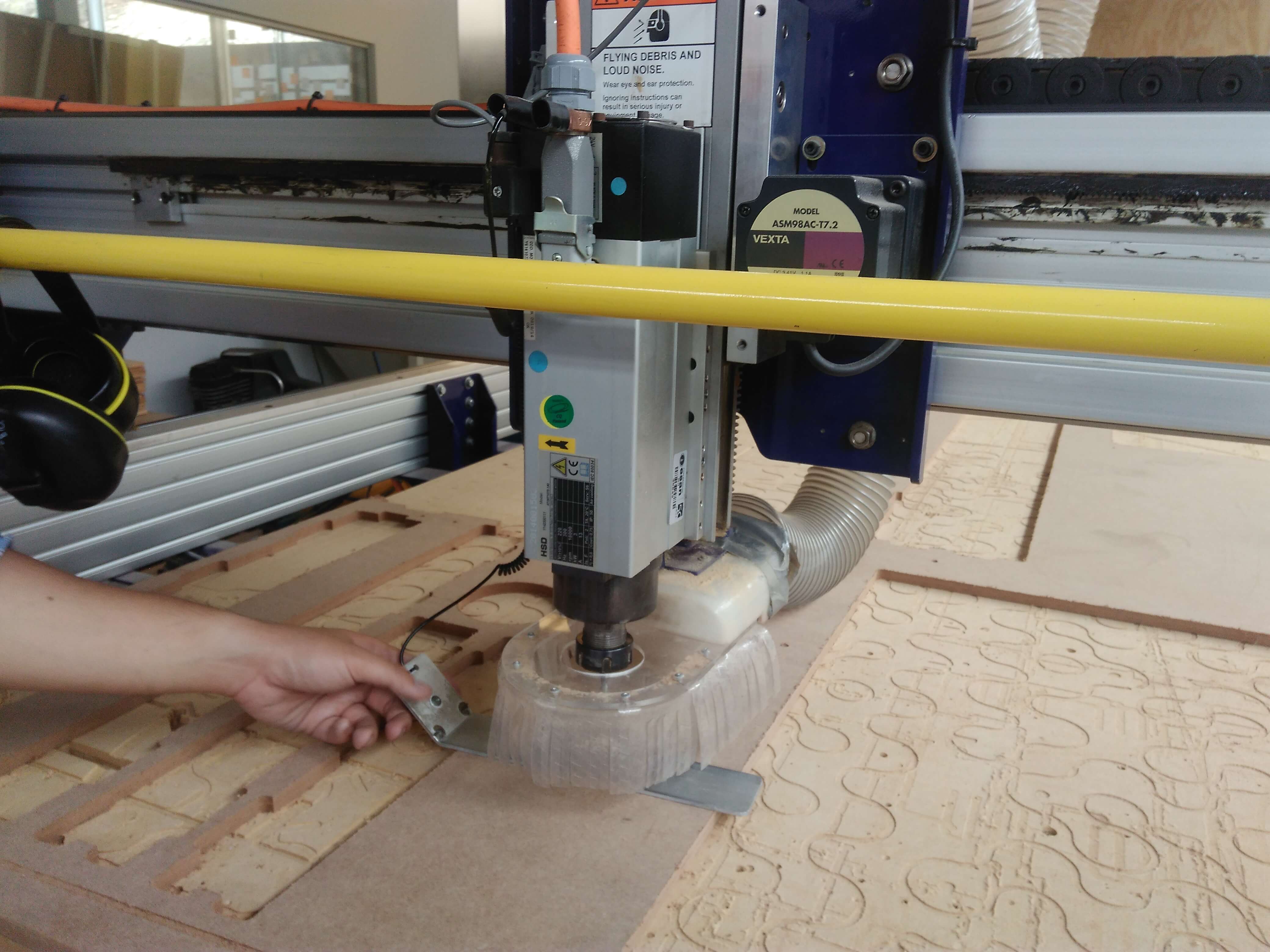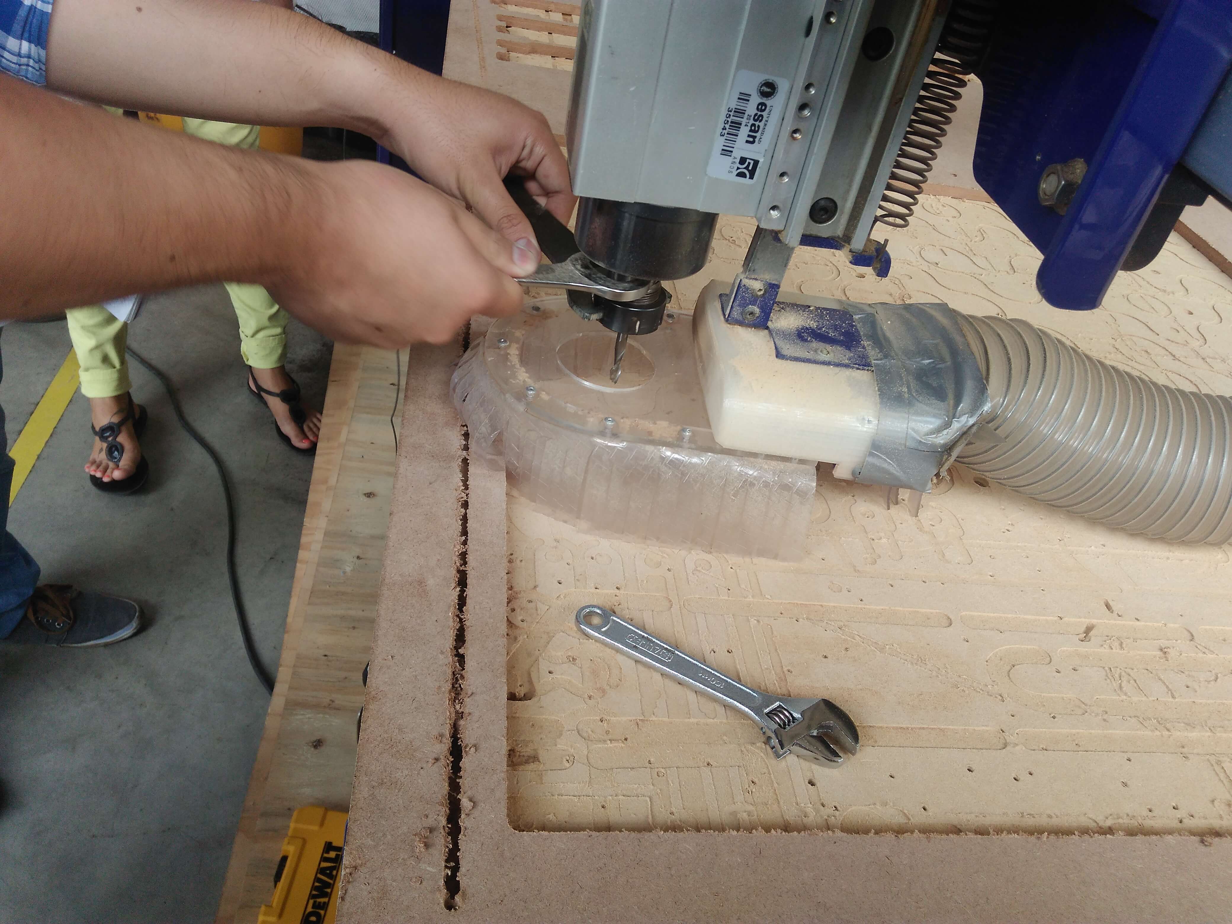 My team and I have trainned by local instructor to use a Shopbot. The first thing that he said was turn on the swithc and unlock the machine with the key. So we should verify the led speed panel. The machine chuck should for adjusting the drill cut up. With the MDF on the table which holds with crews in its corners. The next step was calibrated the axis Z and XY, the first we move the head in the middle and we did calibrate with the plate and alligator.
