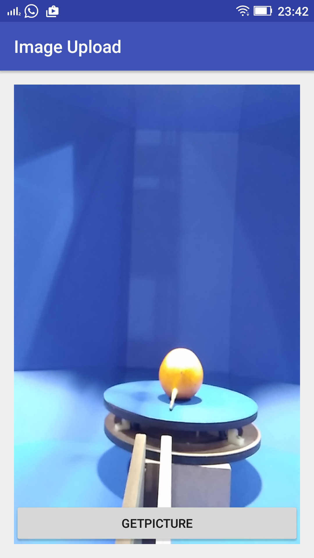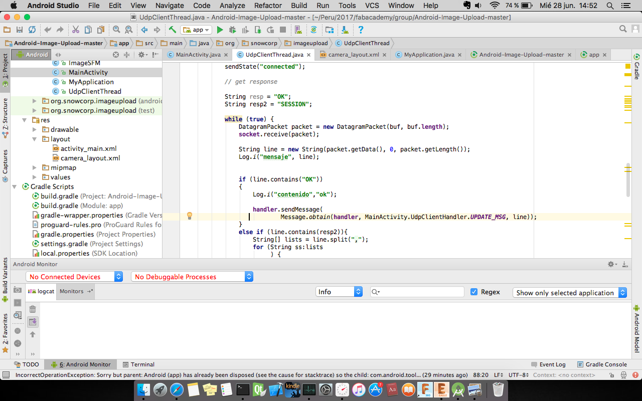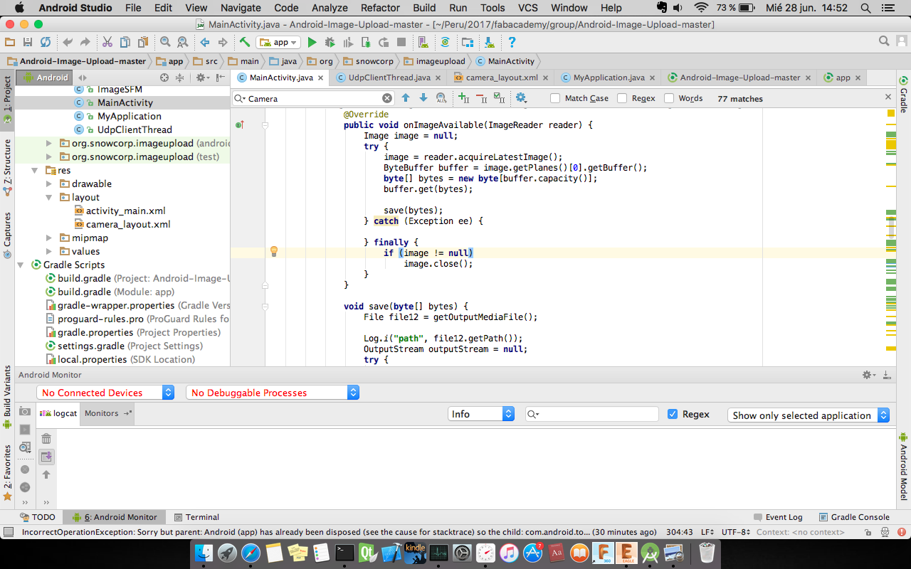 The android app have implemented with library Volley plus following the tutorial to upload the files image to the server. The layout app changed to a new GUI which lunchs the camera, to complete this idea we read post. The camera has own classes to interaction with the app. Now, the challenge was to create a VolleyPlus library to sincronize image captured from the app with GUI program in desktop. Additionaly, this app was listening UDP socket. The app wait the message to start taking picture and upload each one. The source can download in this link