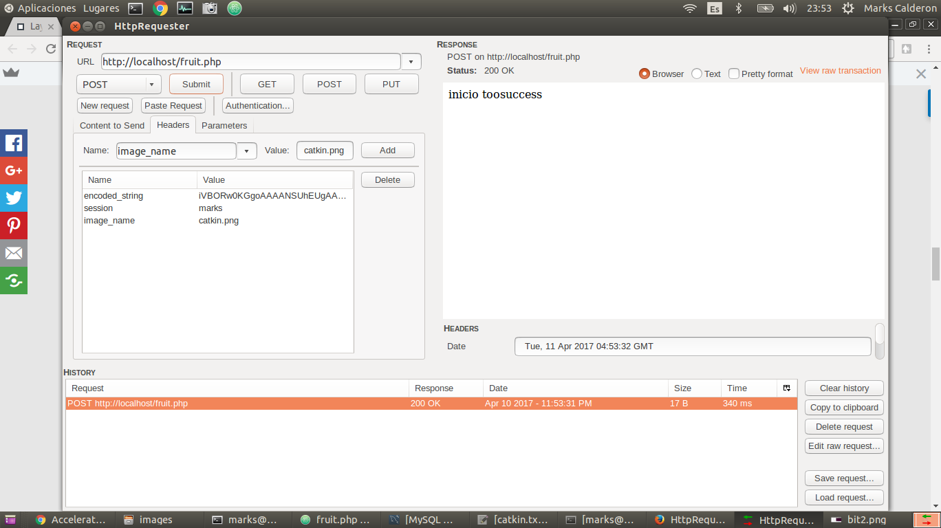 The program did not upload image with more than 2 Mb, so we modified two files: the first one was /etc/apache2/apache2.conf in the line LimitRequesLine 1000000, LimitRequestFieldSize 1000000. Additionaly, we modified /etc/php5/apache2/php.ini the line upload_max_filesize=10M. After restart apache server "sudo service apache2 restart", a firefox plugin "Httprequester" was installed to process the webservice. It can send request, in our case we sent fields with real data as image_name and encoded_string, the last one was compress an image with base64 method. Tutorial of php file uploading.