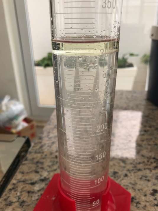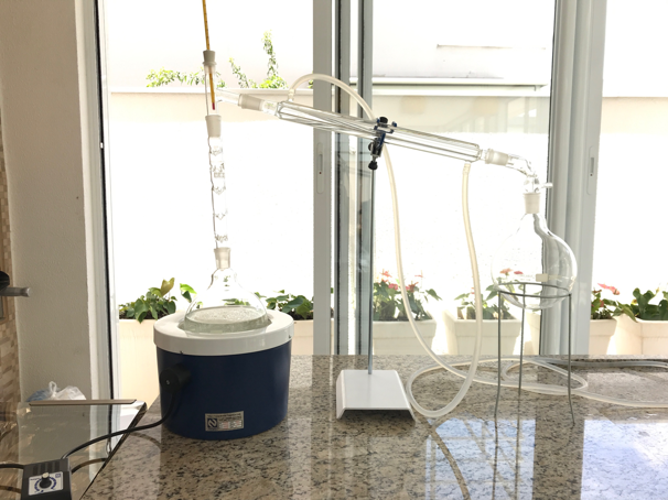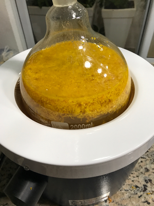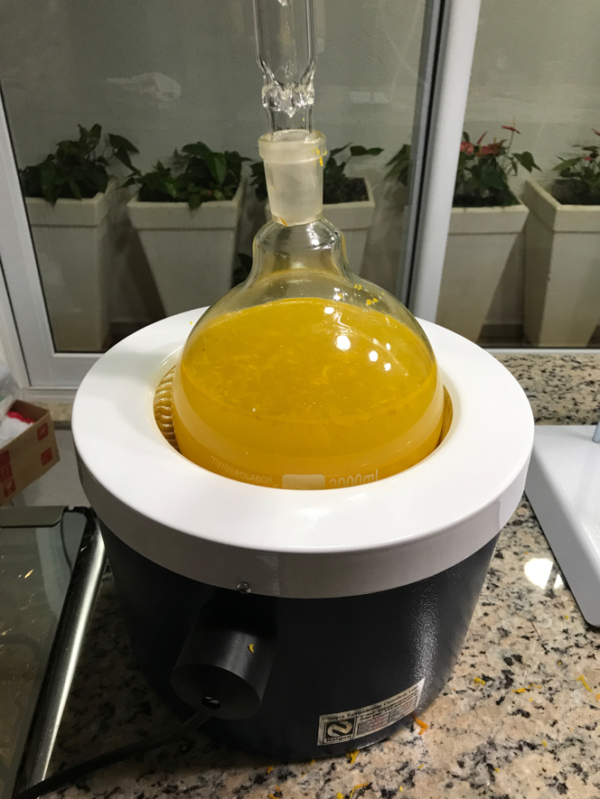 After I measured the weight of the 13 oranges and the water, I put both in the 2000 ml round bottom flask.
