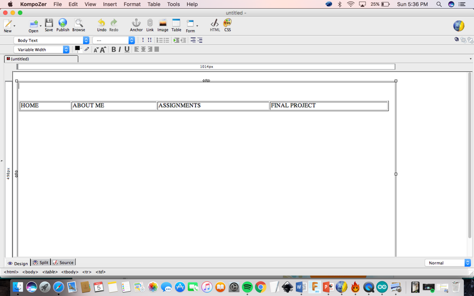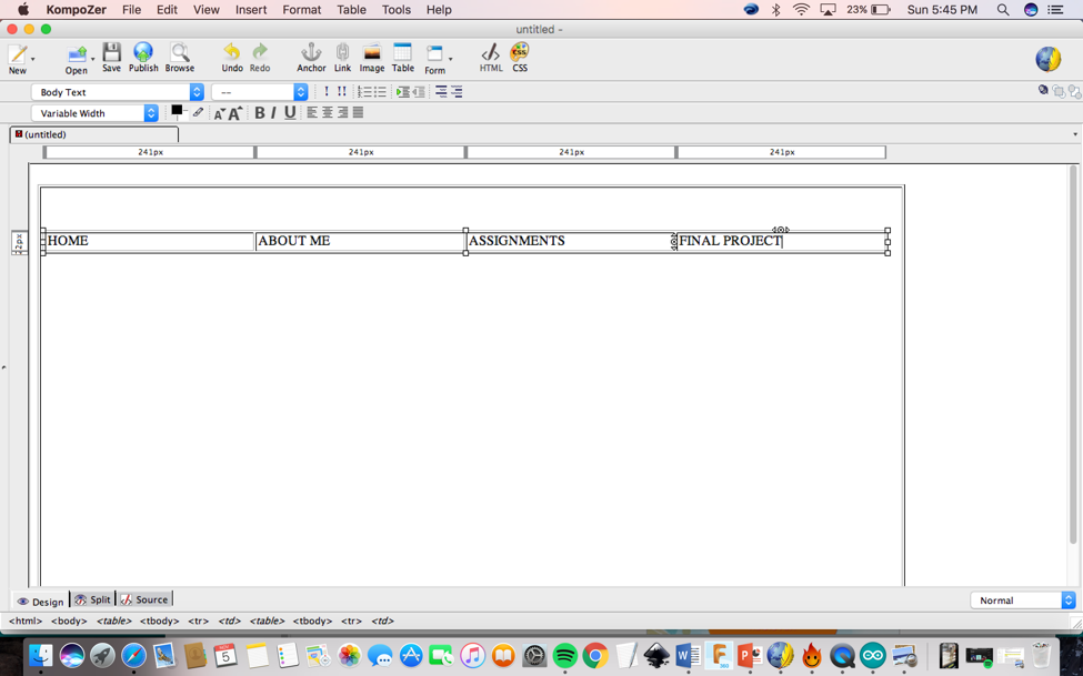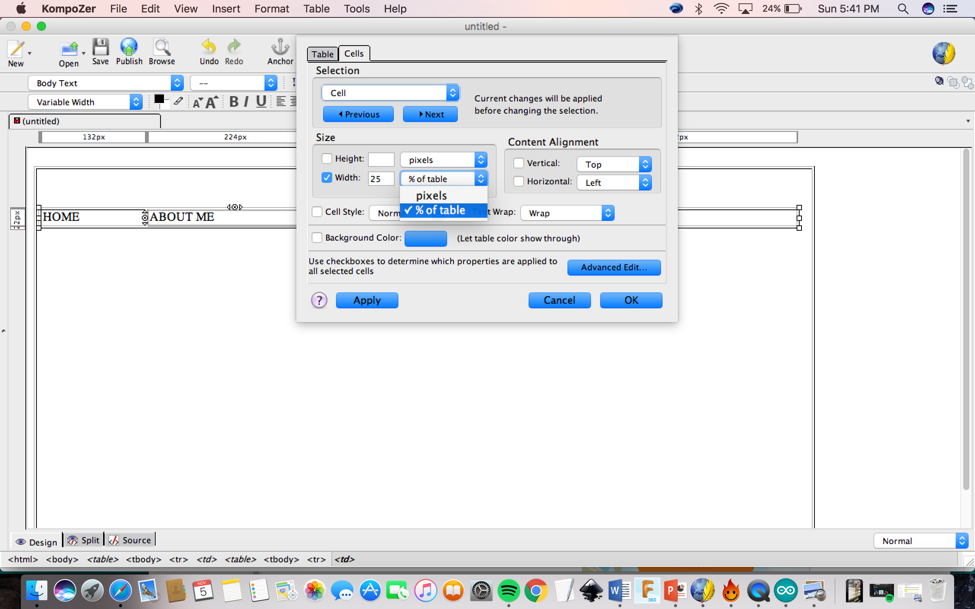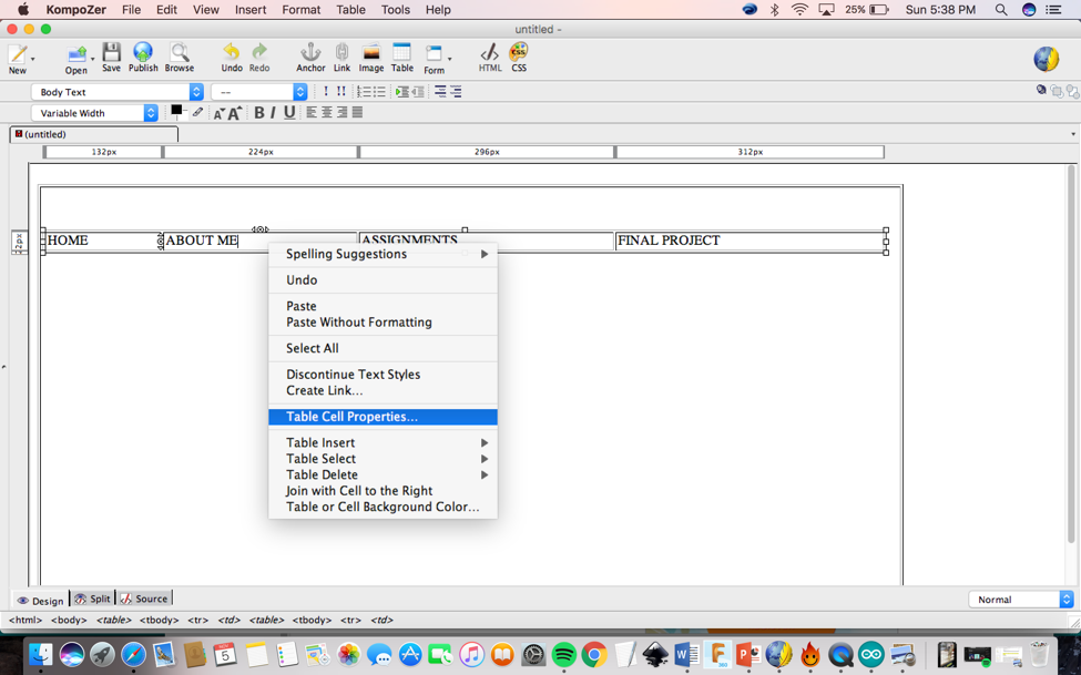 Proprieties> Cells (change the width to 25 %of the table). You need to do these steps one by one for each cell. First I clicked on ABOUT ME, then HOME.