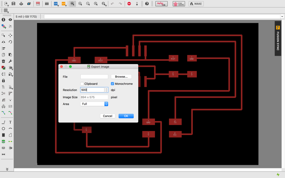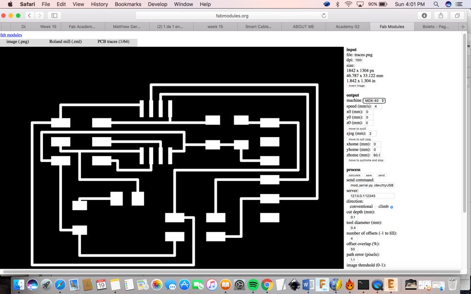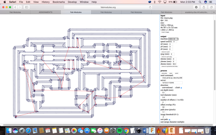 I then used the fabmodules.org to convert the traces/outlines to Rolland mill (.rml). Always remember if you are using a mac to change the dpi to 1000.