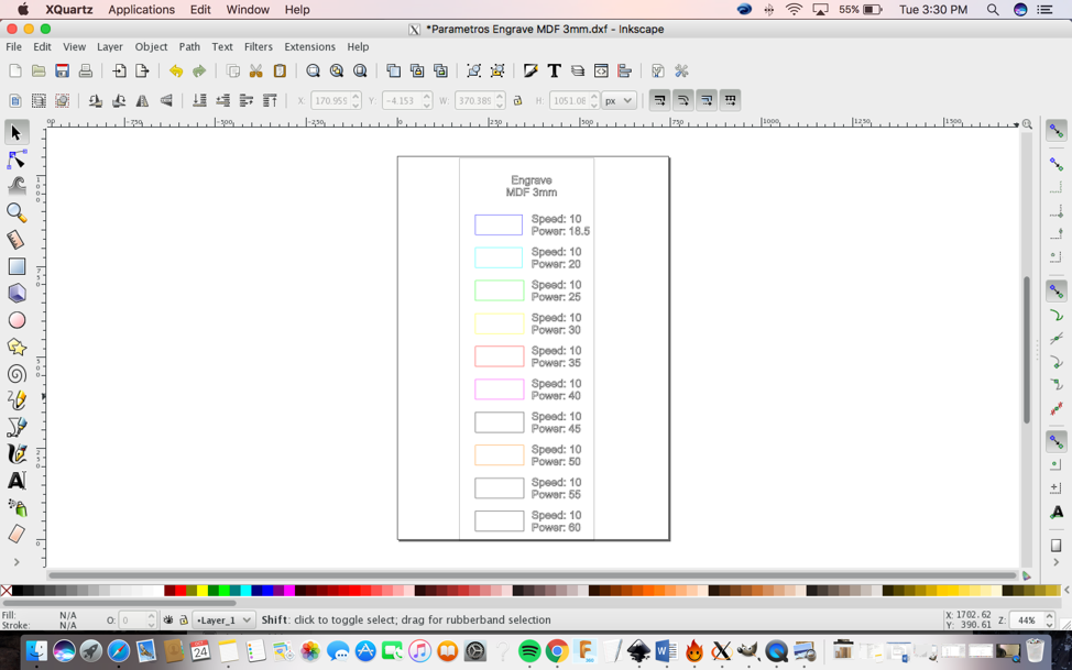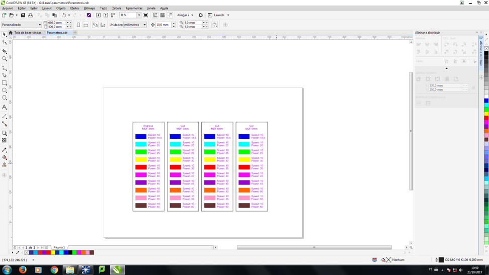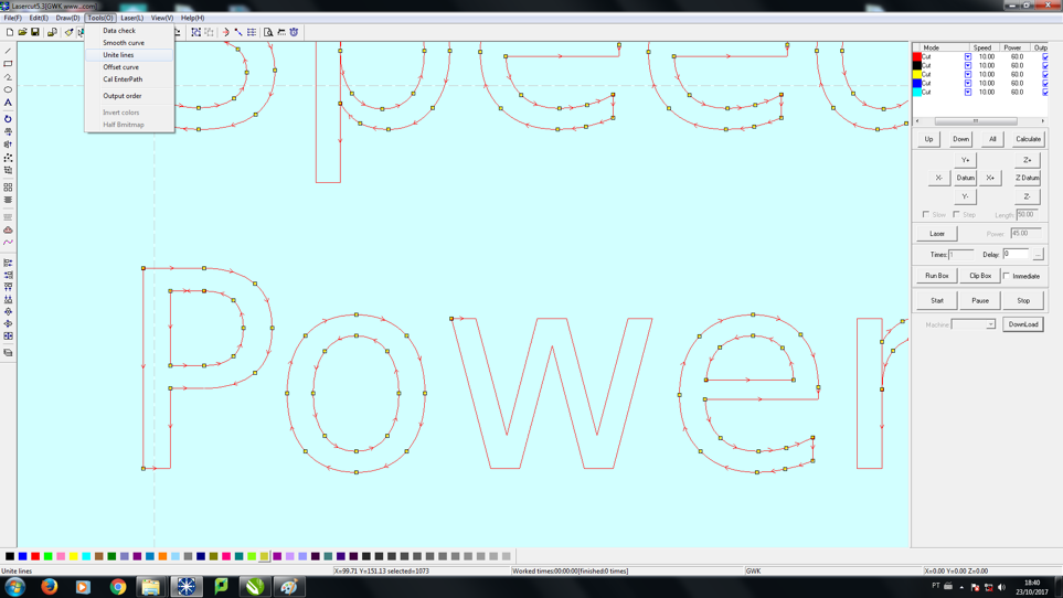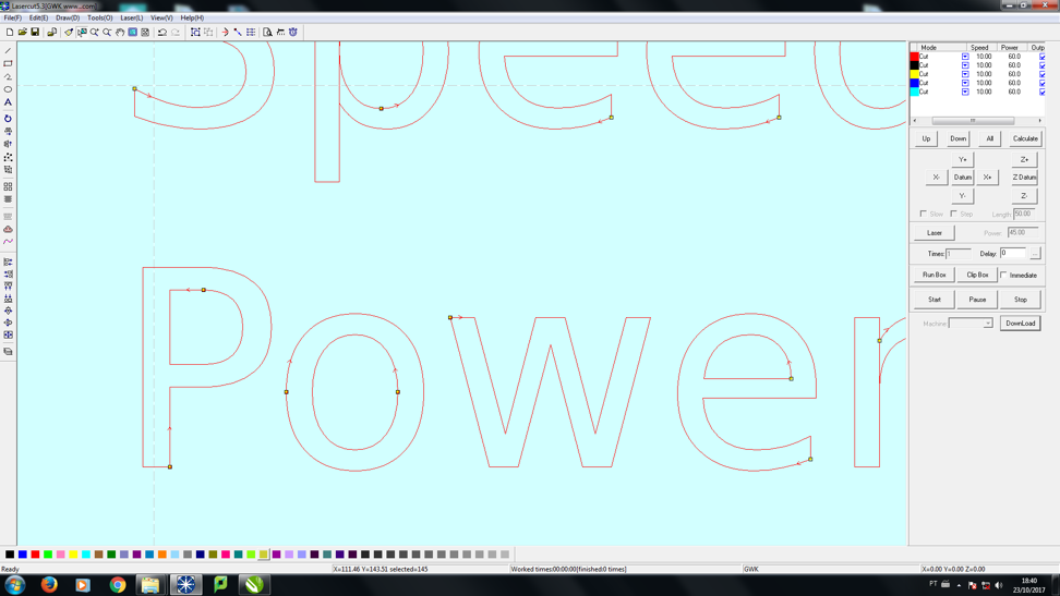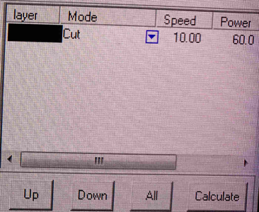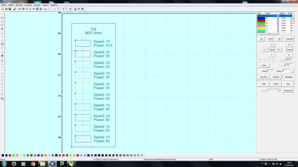 7)  Here below you can see the picture of my design in the Lasercut software. You need to configure the speed and the power. Once