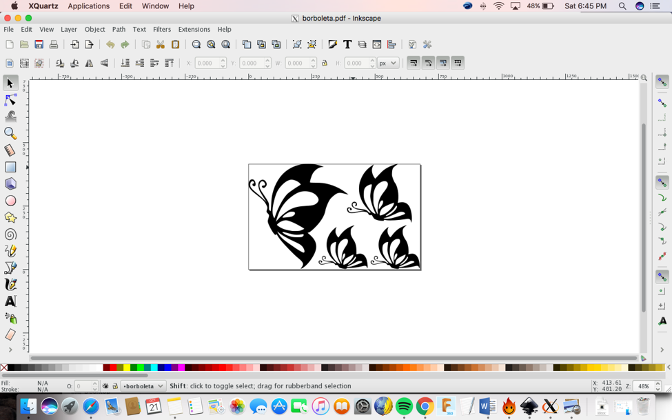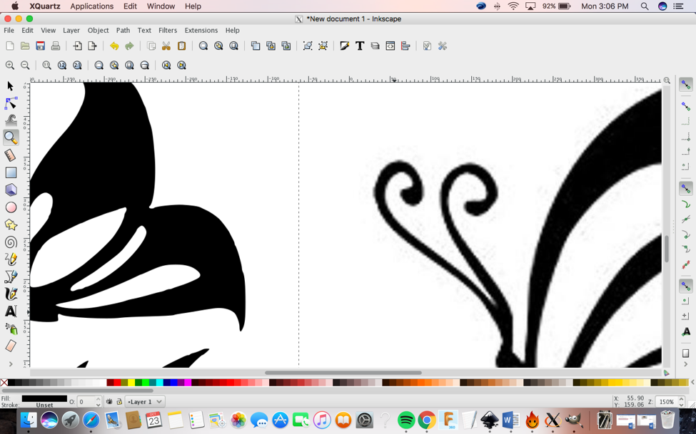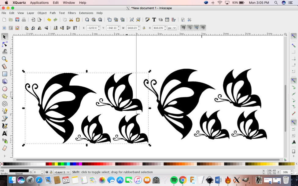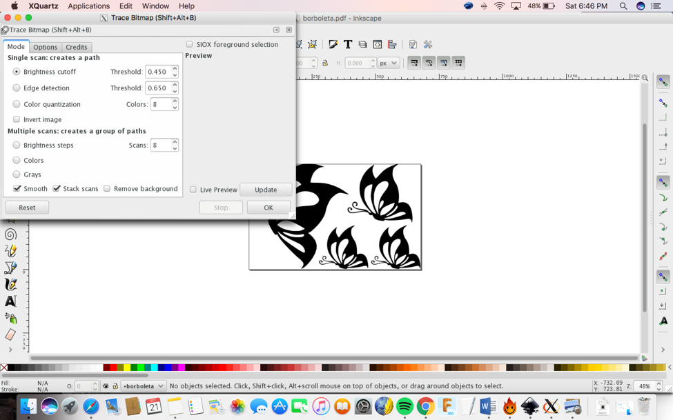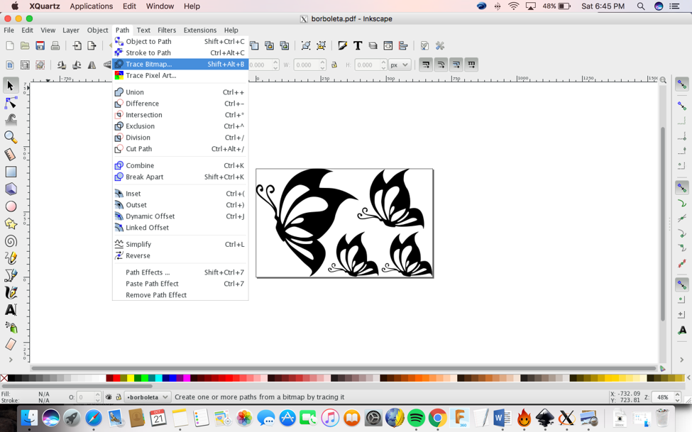 I decided to make four butterflies to stick on my bedroom wall.I used Inkscape to do it. First I needed to rasterize the JPG image on Inkscape by doing: