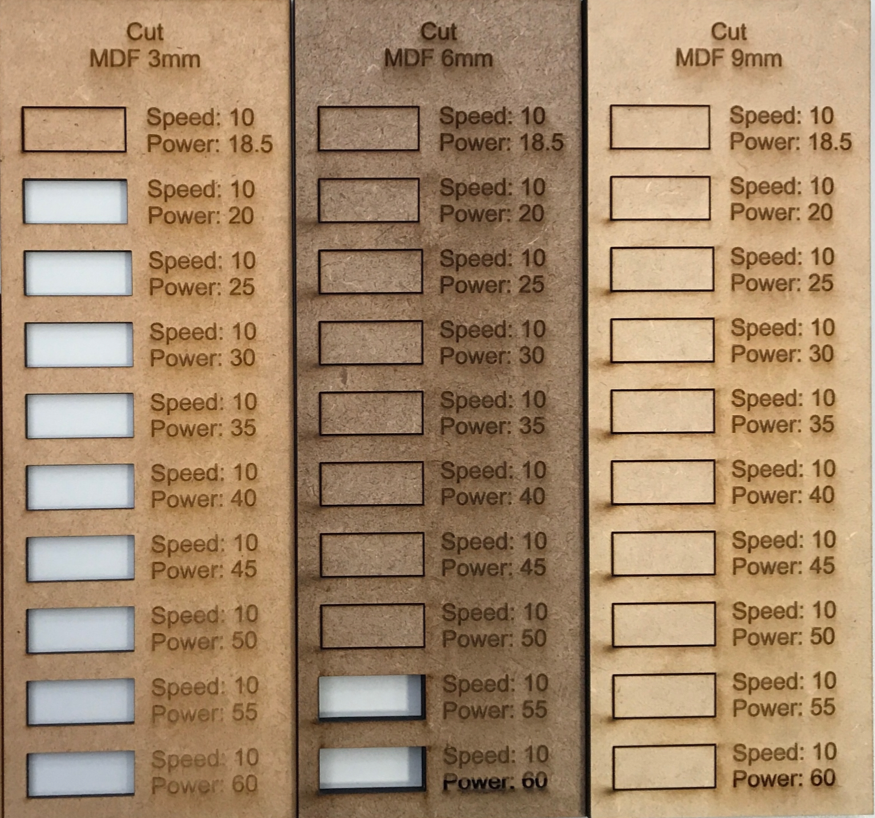 I Learned that the power parameter determines how deep the laser will go through the material. As you can see in our fab lab we have 3 different thickness of MDF material ranging 3mm-9mm. I chose to use the same laser cutter speed for all three thicknesses and start the power of the laser cutter from 18.5-60.
