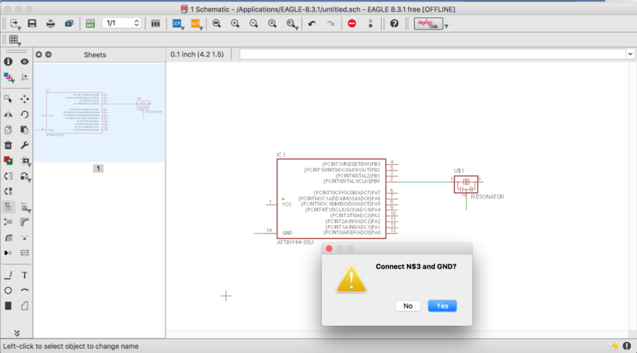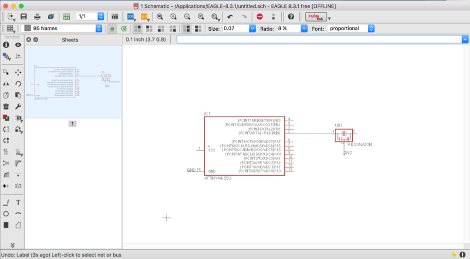with the VCC (pin 1) in the Attiny. I created a line between them. Now