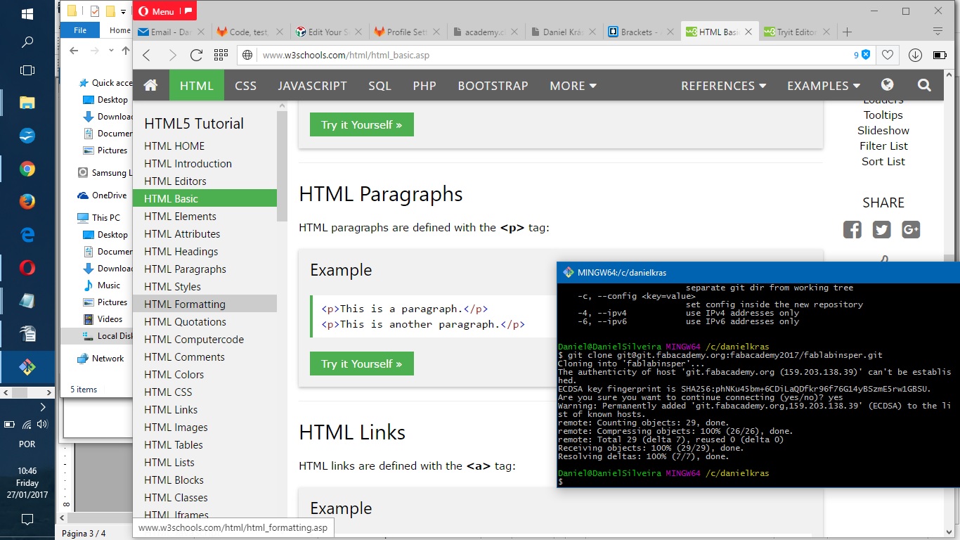 During FabAcademy2017 I had a few problems with my GitBash access. GitBash is a console tool to sincronyze and update the website. The download is possible from this link. I also changed twice my computer. This was very stressful, because I had to install the whole set of softwares many times (and its libraries). I don't recomend it during FabAcademy cycle. But, as I had to do it, I also needed to clone my Git access. This procedure is described in the tutorial I mentioned before. The Git clones worked fine.