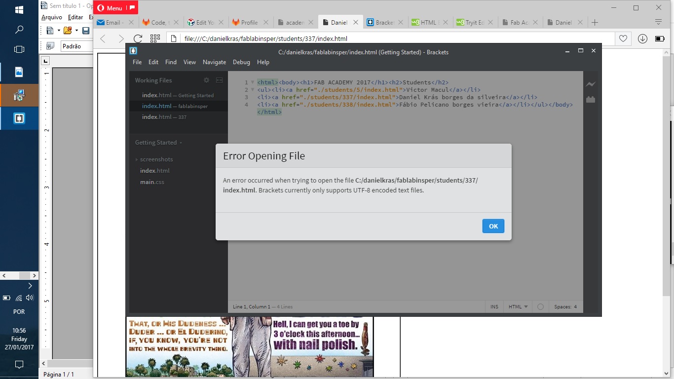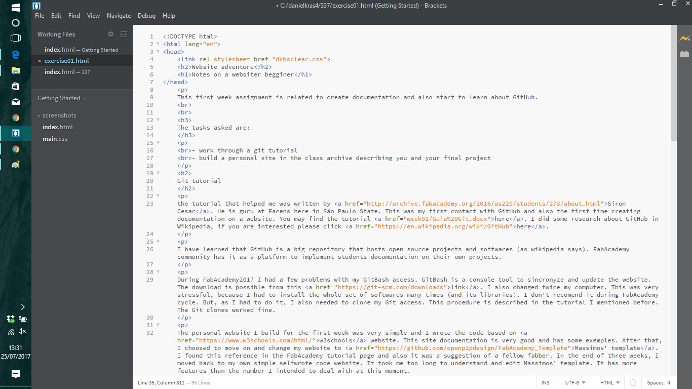 This is the first error message. The .html file I create from Notepad didn't work well. I tried to access it from Fabacademy.org website but the image supposed to be displayed didn't. Searching for a tool to edit .html files, I came to Brackets. This software reported to me the error with my .html file.