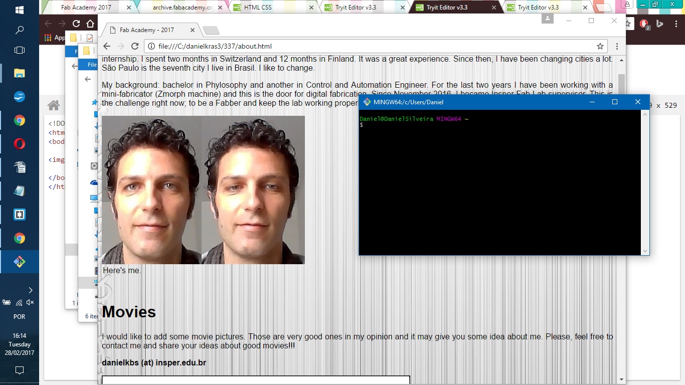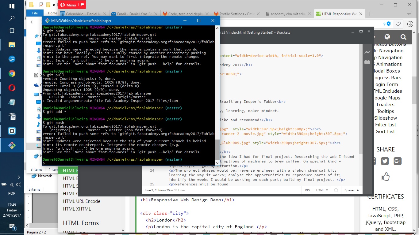 GitBash was the software I choose to make the uploads. Sometimes it didn't work. I got some help from my tutor and from another Fabber to upload my website few times. We faced a situation with a Fabber that made some mistake uploading his website and we needed to restart our branch. After that the whole system had a keyaccess problem and another time we restarted. Later May2017, Insper had a hacker attack and, after that, safety measures made quite hard for me - from an Insper computer - to access GitHub. Those situations were all managed.
