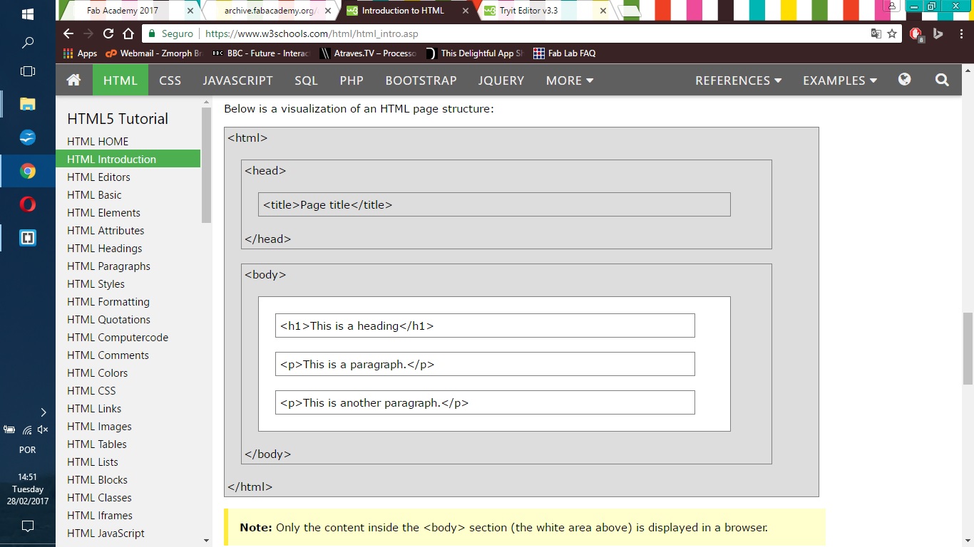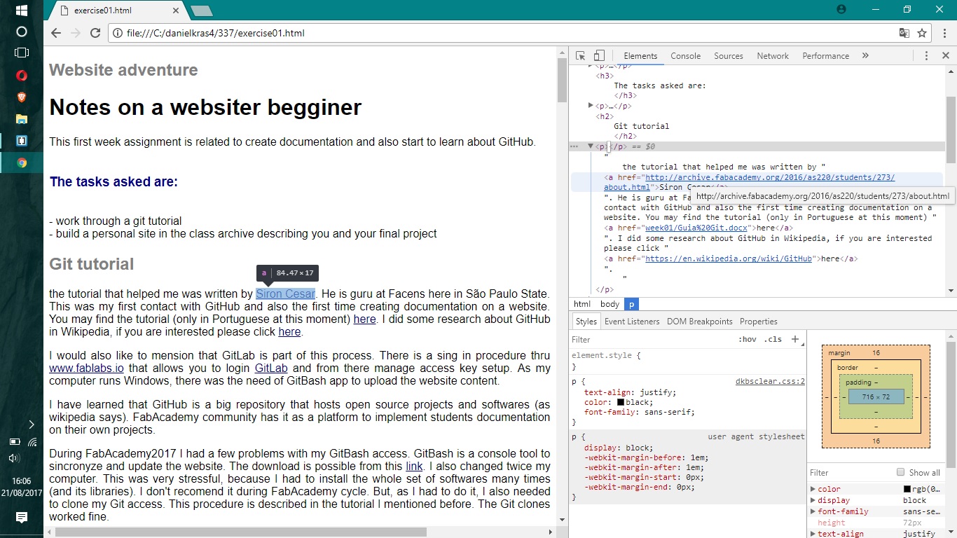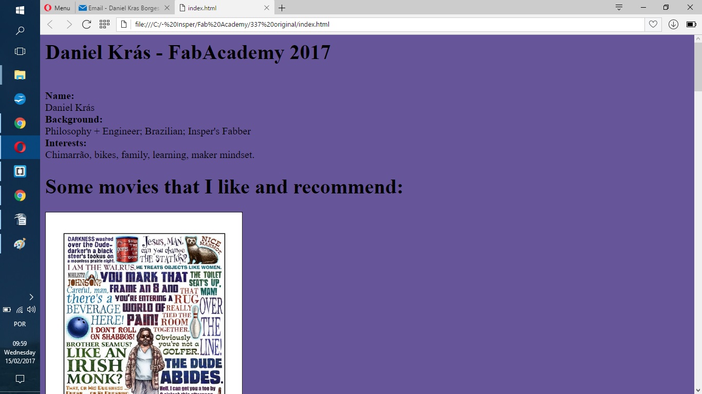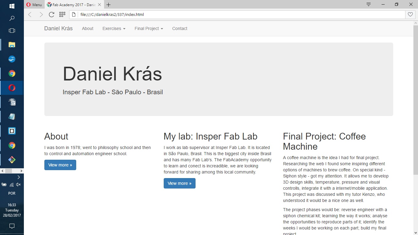 The personal website I build for the first week was very simple and I wrote the code based on w3schools website. This site documentation is very good and has some exemples. After that, I choosed to move on and change my website to Massimos' template. I found this reference in the FabAcademy tutorial page and also it was a suggestion of a fellow fabber. In the end of three weeks, I moved back to my own simple selfwrote code website. It took me too long to understand and edit Massimos' template. It has more features than the number I intended to deal with at this moment.