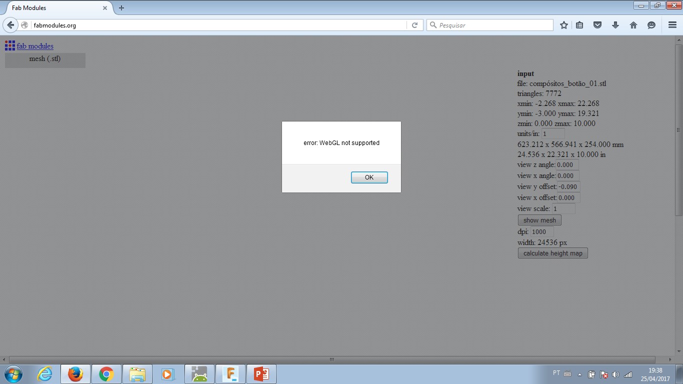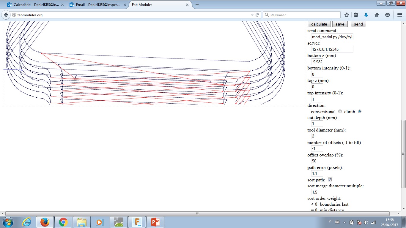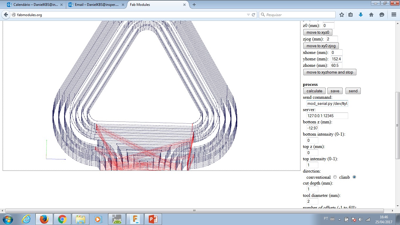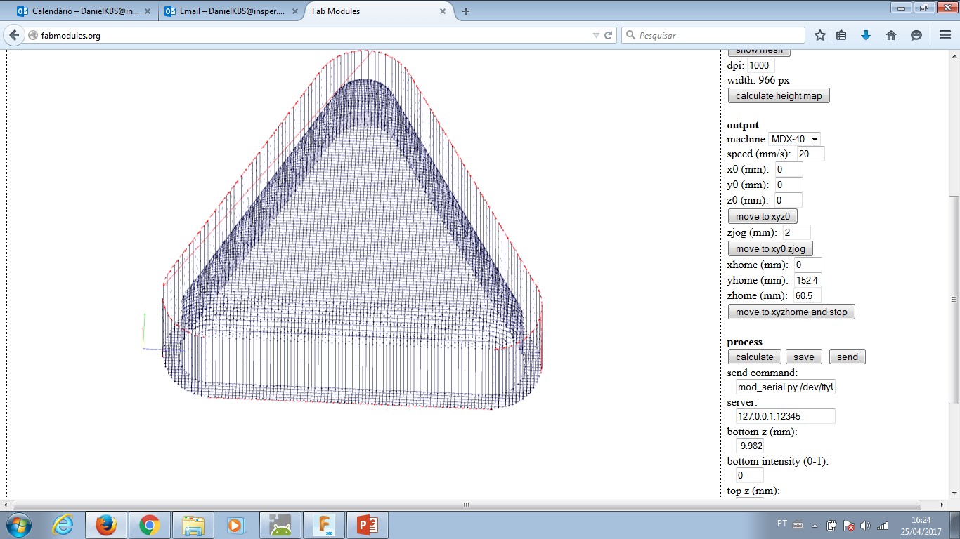 I did the design with Fusion360 and then made a gcode with FabModules. After the first milling completed, I wanted to redesign the shape and mill it again. That was not possible. FabModules stoped working for 3D processing in my computer. I tried diferent browsers (Opera, Chrome, Mozzila and IExplorer) without any success. My tutor Kenzo is discussing this error with other tutors from the FabLab network.