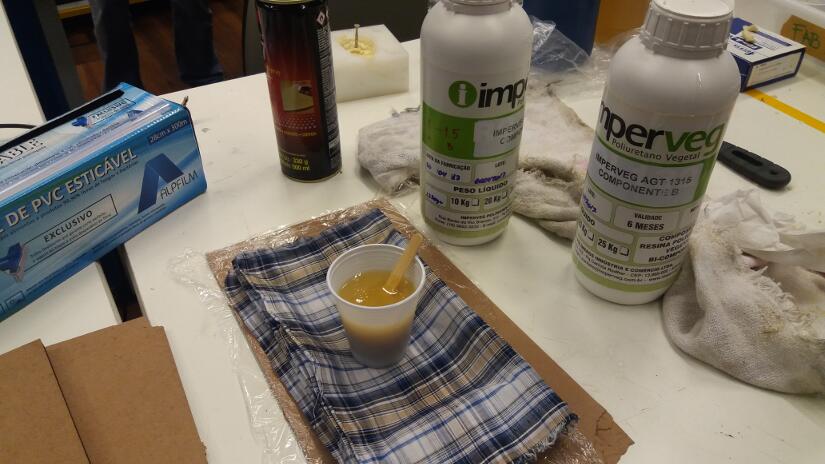 Imperveg resine AGT 1315 was the material. It comes in two bottles (A and B). The mixture has a proportion of: 1 A + 1,5 B = good mixture. More information about it (in Portuguese) will be found here or here. It includes MSDS and TDS information.
