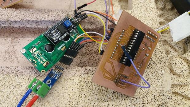 This assignment was complete together with the final project. For the coffee maker I had to integrate input from a temperature sensor (in this case it has a microcontroler attached), a keyboard (only buttons), an output to a display LCD16x2 with an adaptor to serial comunication and a relay 10A/220V actuator. I made a microcontroler board to integrate the system.