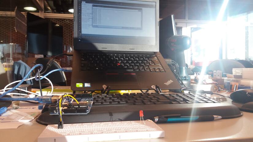 The thermosensor is an LM35 and the exemple setup and code to work with it came from this Instructable tutorial. The first step was to try this setup with an Arduino board and a breadboard. I measured the temperature of the room (FabLab) and how easy it would raise when holded (finger pressed). Room temperature read avarage = 24,5°C and it was easy to raise it up to 28°C just holding a few moments.