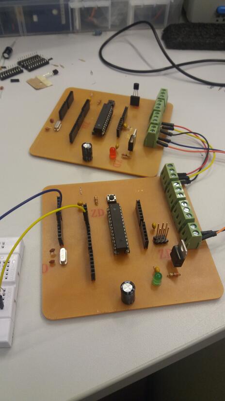 I chose to prototype the code with standard Arduino boards and protoboards. After that was ready, than a set of microcontrolers boards would be emmbeded with this code. As the assignment requests, the boards must be self made ones. As commented in previous assingments, the soldering material available burns SMD components pads. At the moment, and rush, PTH standard components were the best available choice. The boards are not so nice looking, they are bigger, but the principal is the same.