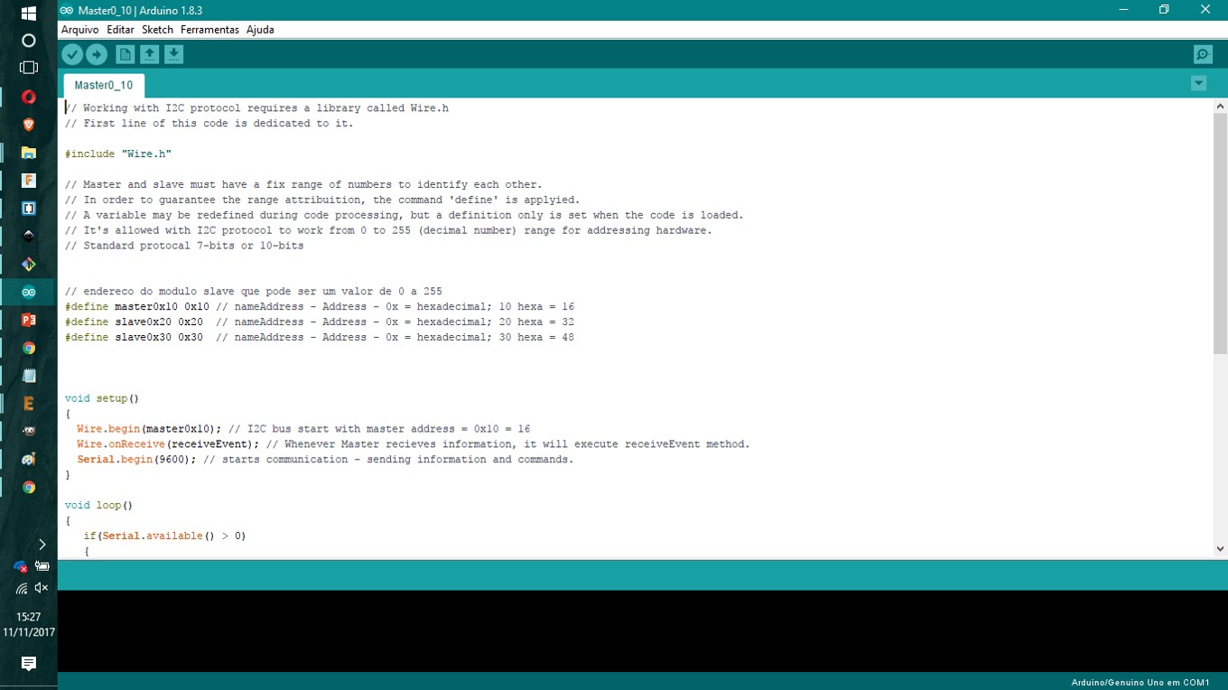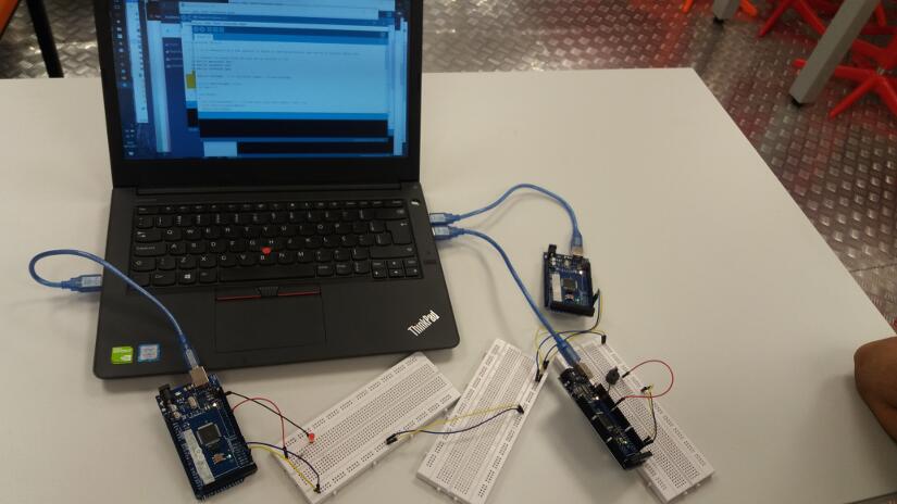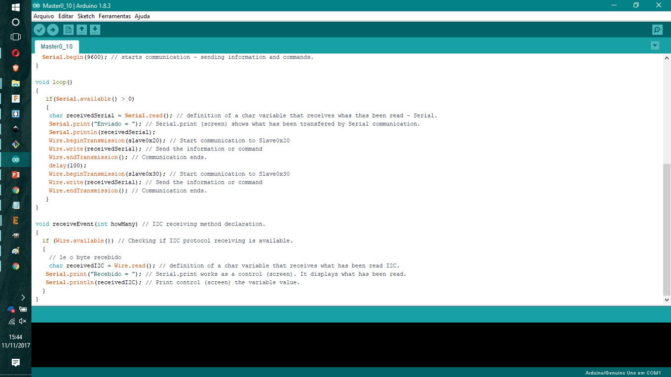 Fortunately, the main issues worked fine. My firt model of network was a prototype with three Arduino boards. As i couldn't build three boards on my on, I adapted the code to two boards only. The first round was a led sing information in a loop with a delay. So, Marster board would send a command to Slave board that would blink a led. This wasn't very interactive and the idea of implementing a thermosensor came up as a fast way to make two boards interacting with an input and a output integrated. The later version of codes, Master reads the temperature and over 28°C reading it sends Slave a command to turn on the led (and when temperature is above 28°C the command is to turn off the led).