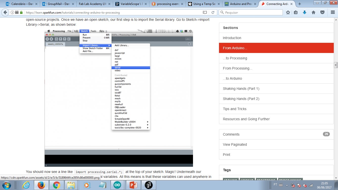 In order to implement this exercise, I searched and customized an online available solution (link below). After I finish the Sparkfun tutorial, I iniciated working on this second code. There is the need to adjust serial comunication in Arduino and Processing codes. Seria read is important because that is the port I used to receive information from themosensor. The frequency this data flows has to match in Arduino and Processing codes. The computer COM port has to be set in order to get in Processing display the correct read. Otherwise, the result will be null or error message. I had all this problems and, one by one was adjusting and seting the code to make it work.