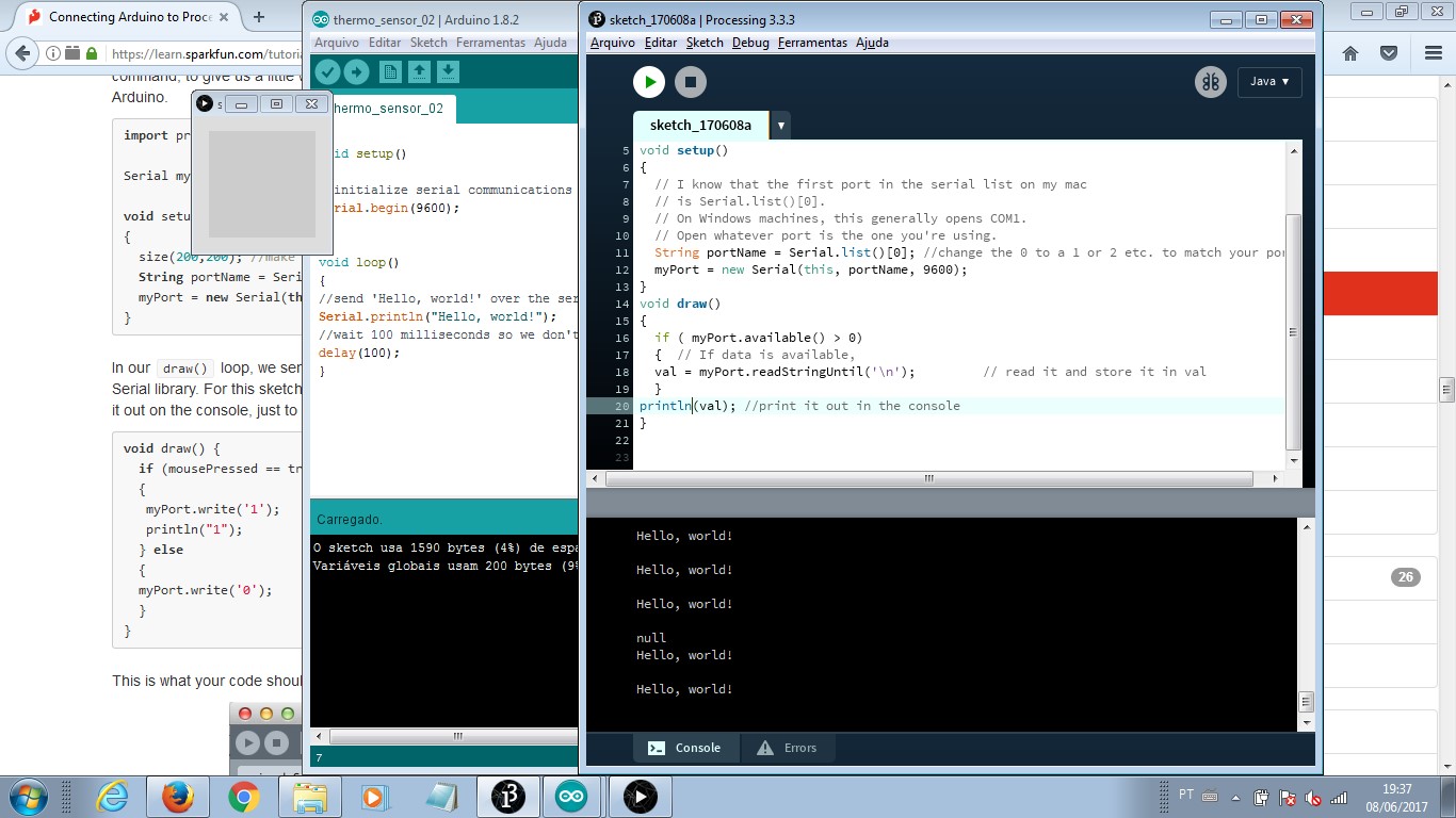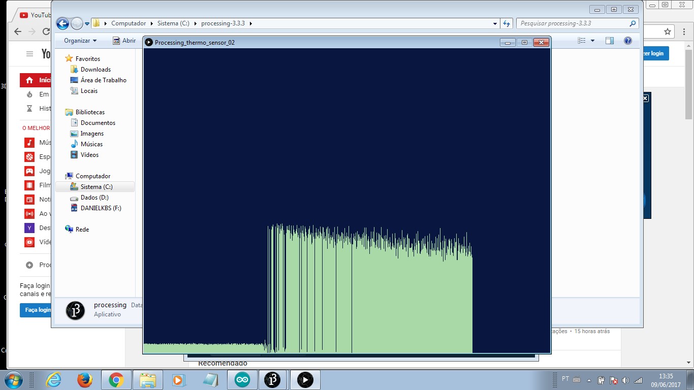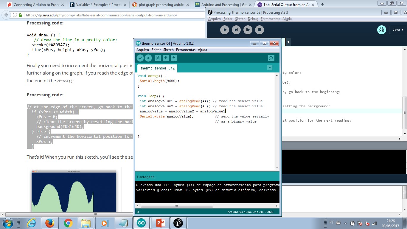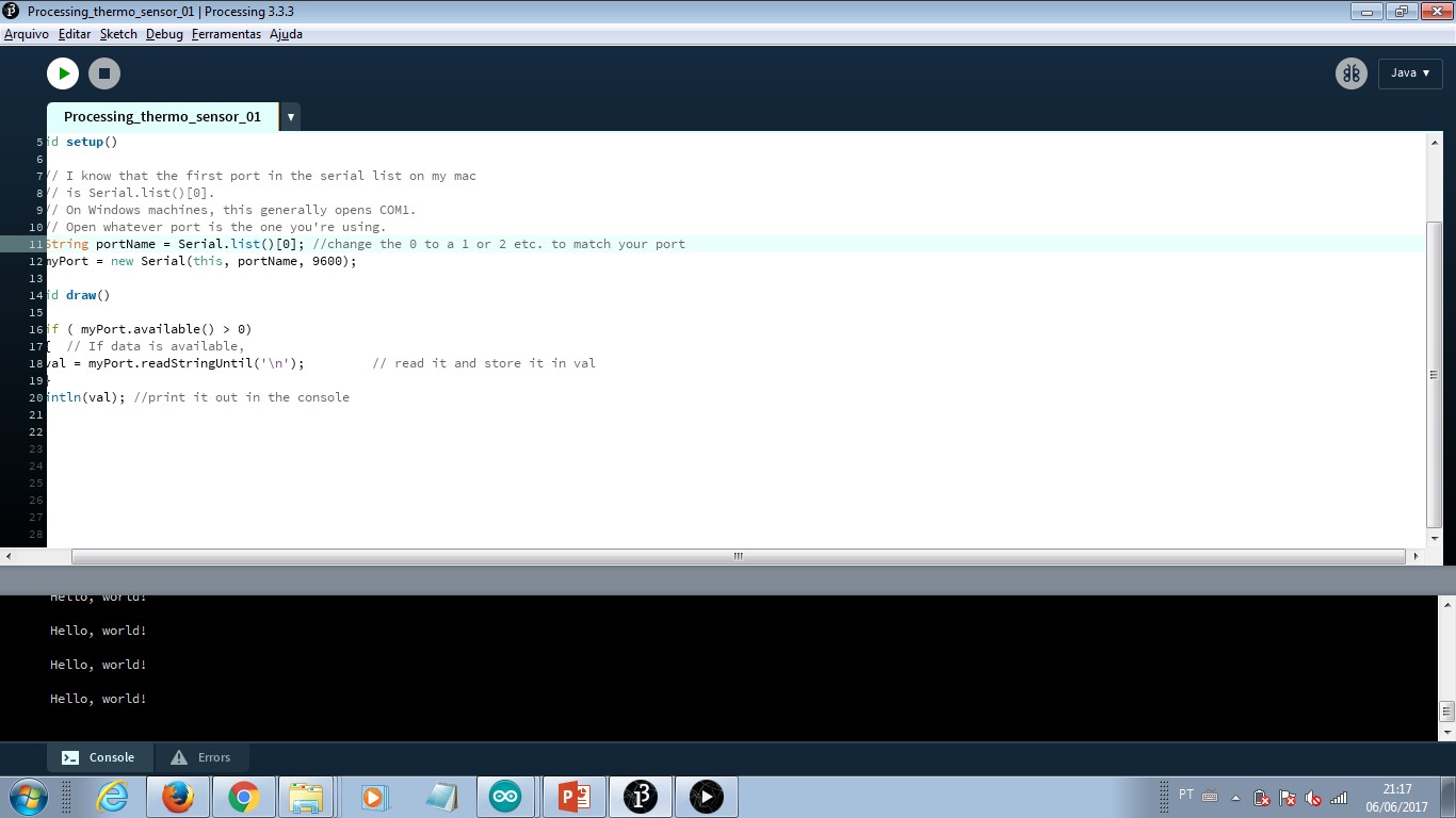 For this assignment, I chose to work again with the thermosensor (check exercise13 for extra information). The idea was to read data and plot a graphic with processing application. As I had my code 'serial printing' information in the screen, it took me a while to learn I couldn't busy at the same time Arduino and Processing softwares with the same USB por connection (com3 in my case).