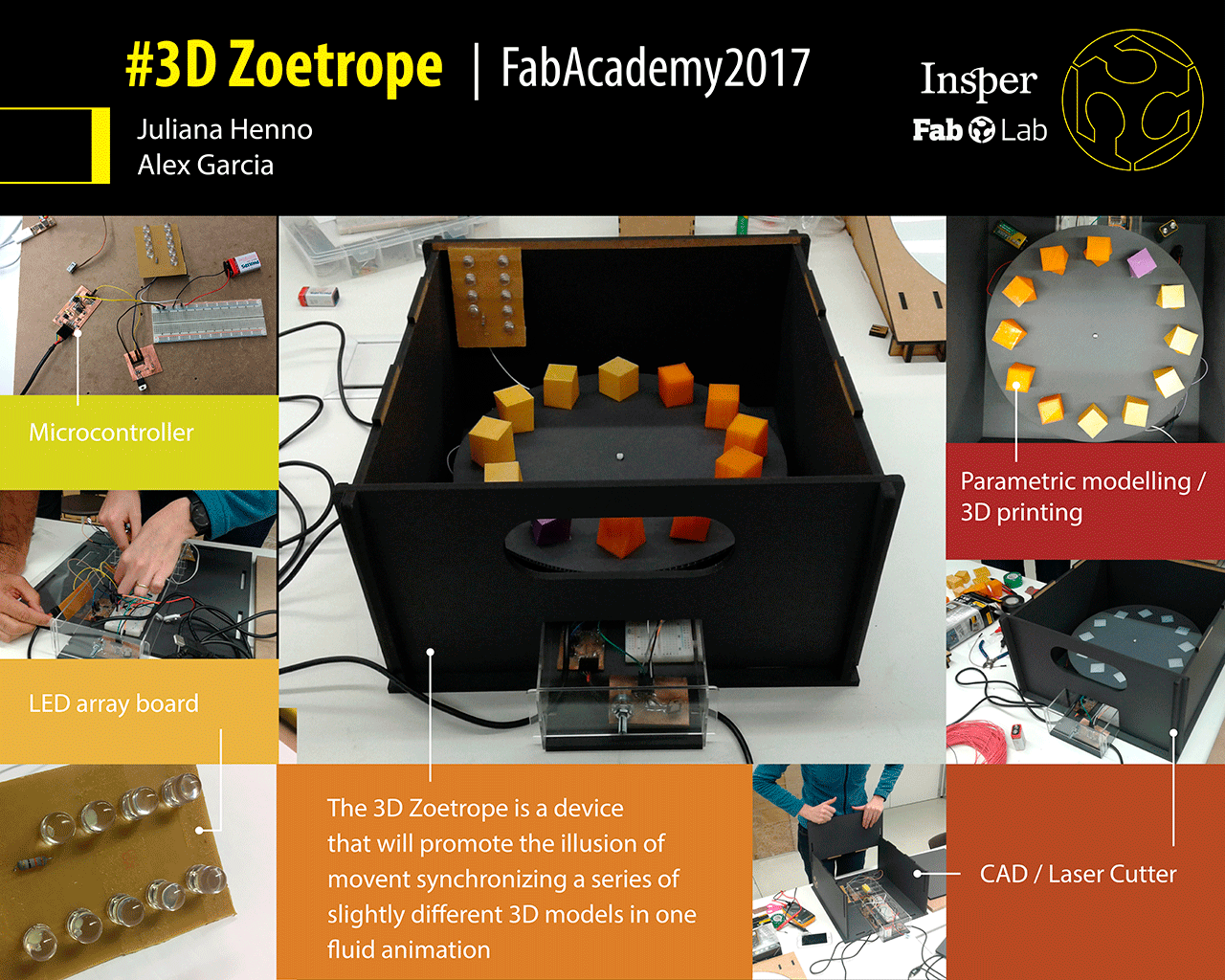 To continue developing the 3D Zoetrope after the FabAcademy ends. Me and Alex Garcia are interested to also upload the documentation of the project in other online repositories like Designoteca.com and FabLabs.io. We also intend to develop a workshop based on teaching children of low income communities to learn about animation using our 3D Zoetrope as a way of accessing it. For that we will invite Nori Figueiredo, an artist and also an art director to help us translating important theoretical concepts of the Animation as something easy and fun to learn by the kids. We intend to encourage people that come to FabLabs to create their own set of 3D models to be animated on the platform and upload the efforts in the same repository where one can download the project of the device.