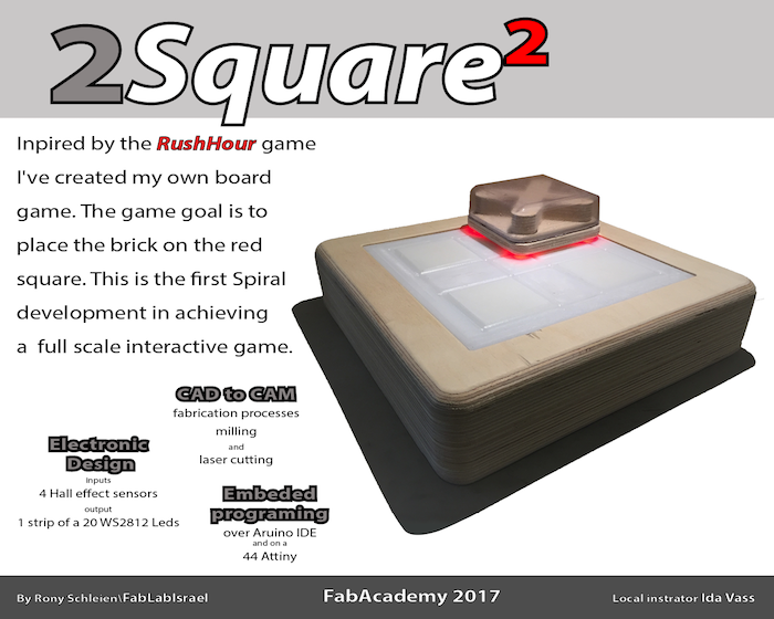 My project is an interactive board game and a uniquely and pleasantly design product. It suits both kids and adult. It is computer aided design and the fabrication can be made in every average fablab.The first development prototype model is a panel of four squares. This is the proof of concept for my final project. The game’s board is lighted with leds. A hall effect sensor reading an analog voltage is changed by the relation to a magnet. The distance of the magnet defines whether the leds are on or off.