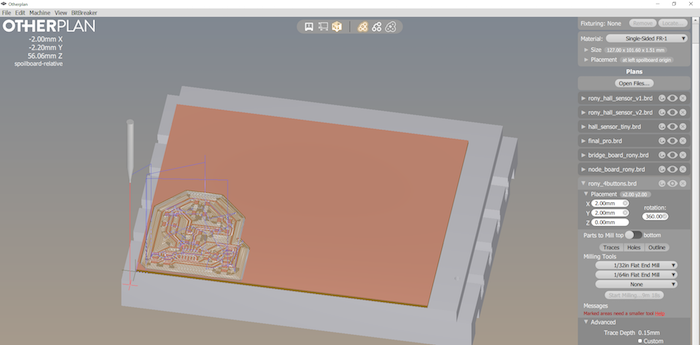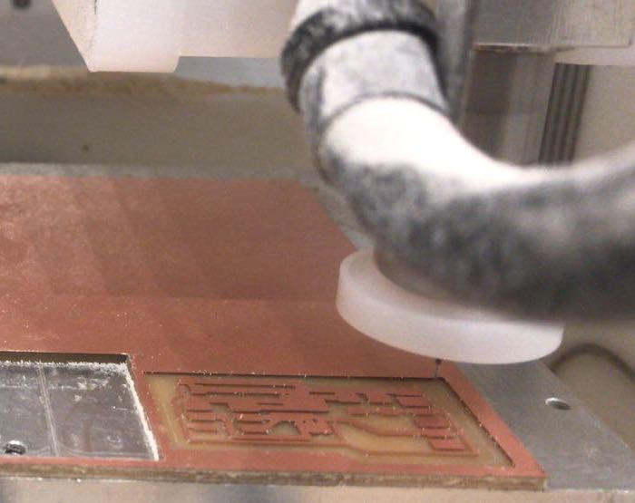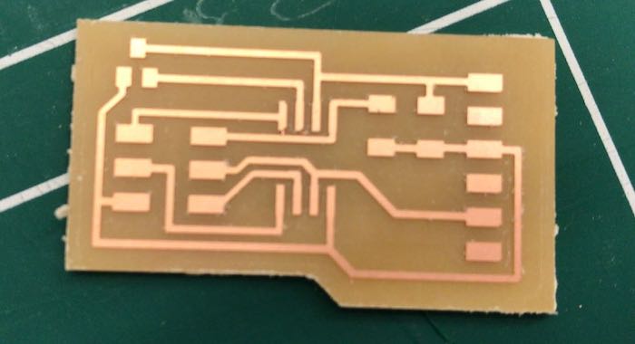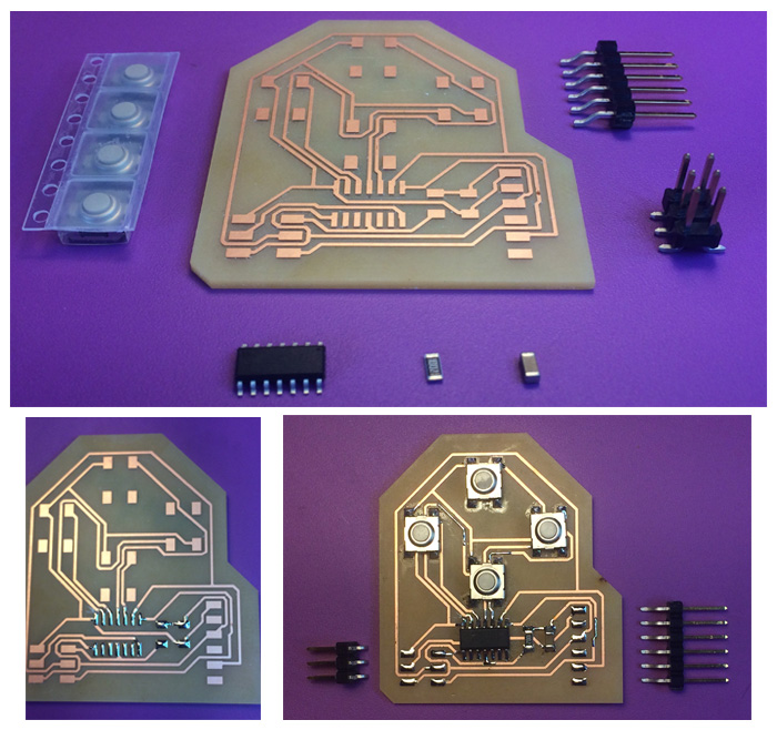 On the beginning I’ve based my design on the hello button board presented in the lecture page and made some adjustments.I’ve changed the microcontroller to ATtiny 44, for achieving more inputs entries. I used the information given on the datasheet for determining which pins to use for each functions. The planning and the design were made through Eagle. Over the schematic I’ve added the components named labeled and linked them. Then over the board window I’ve ordered the components and routed between them.