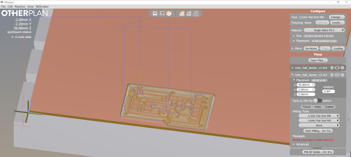 This time I’ve tried a new tool, the Autorouter, on Eagle. When the unrouted layer is selected in the layout window the unrouted traces over the board can be seen clearly. I entered the route tool menu and define the different variables to fit my neads. After choosing and setting the autorouter tool I got different solutions to my design. None of them gave a 100% result, so I had to finish the design on my own.