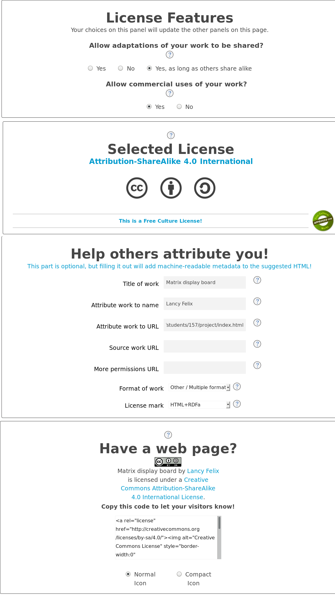 Licensing my work - For my Fab Academy works, I would be using CC-BY-NC, for all the documentation, design files and source codes. The CC-BY-SA, satisfies the terms which I look into ,i.e All my works should be openely available, free to remix and distribute as long as they give me credit and are using for non-commercial purposes.