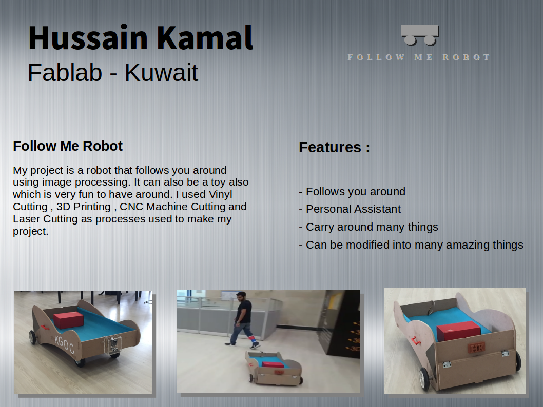 My project is a wagon that will follow you by using pixi-camera (image processing based on colors) , it will also avoid crashing any obstacle using ultrasonic sensor. The main idea of my project is creating a robot that follows you around which can be used as a cart , personal assistant while working , wagon to transfer many things at the same time without any effort at construction sites and warehouses. I am proud of myself that I gained the knowledge from Fab Lab to make my project. Of course I have many enhancements to make on my project on the structure design to differently use the robot in many useful ways in our daily lives.