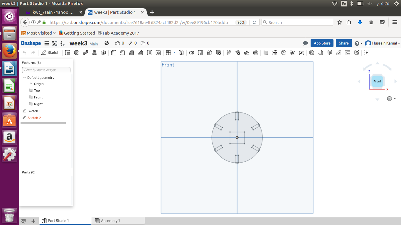 Then I realized that I have to use OnShape because it has parameters , so I used OnShape and designed a circular shape, with six rectangular slices equally distributed around the circular shape with a square cut in the middle , the small rectangular slices width were 2.7 mm due to the thickness of the acrylic I’m using which was around 2.68 , I made the width f the slice a little wider in order to fit a duplicate piece of my design. The idea is to duplicate my circular shape many times and make any object I desire.