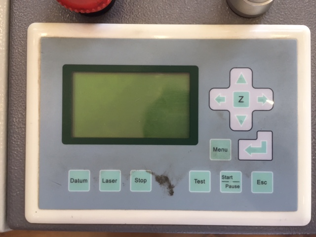This is the control panel of the laser cutting machine which is really simple to use to start cutting , stop cutting , and to test the place of the cutting before starting to be sure that there is enough space to cut in the existing sheet.