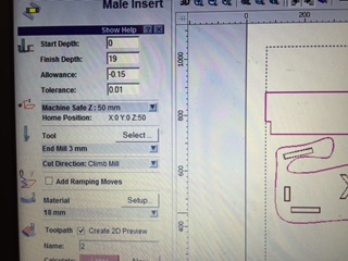 I fixed the cutting (finish) depth to be 19 mm as the wooden sheet is 18 mm so it will cut all the way through. I clicked select tool and chose 3 mm as a bit. Then I calculated the tool path to cut my objects and I saved tool paths. Spindle speed is the rotational frequency of the spindle of the machine, measured in revolutions per minute (RPM). The plunge rate is the speed of the z-axis cut from on place to another. Feed Rate is the speed of movement of the x-axis and y-axis.