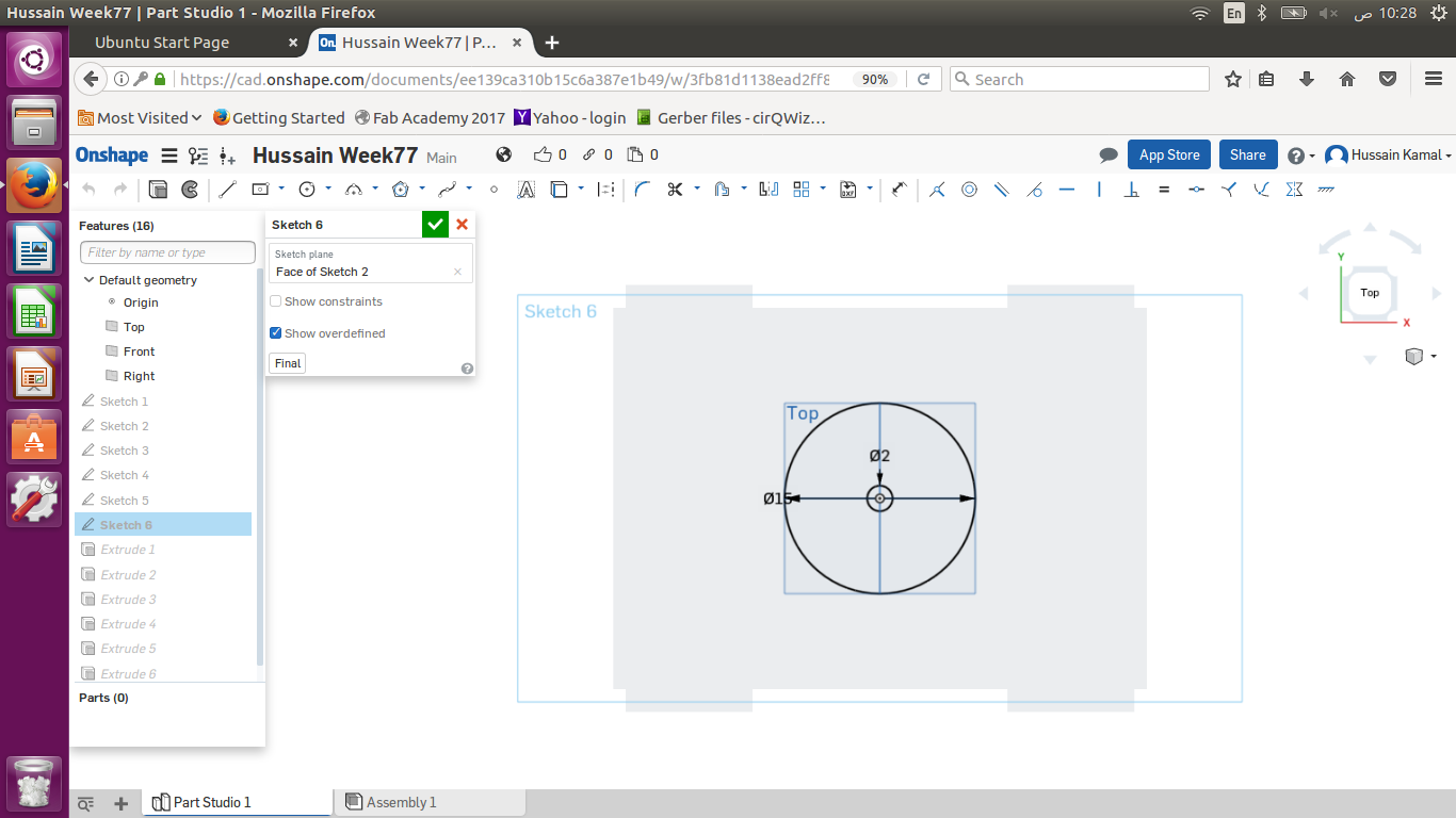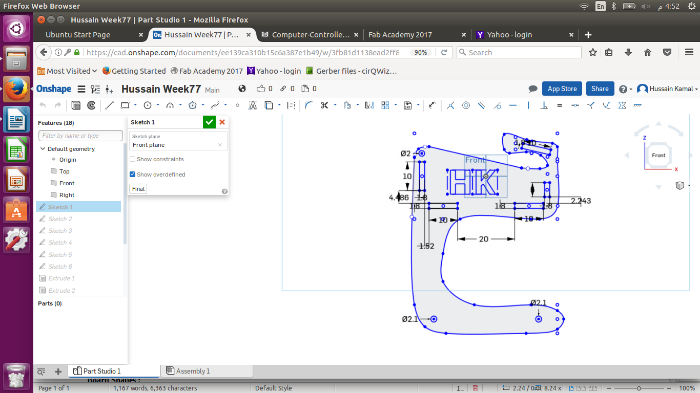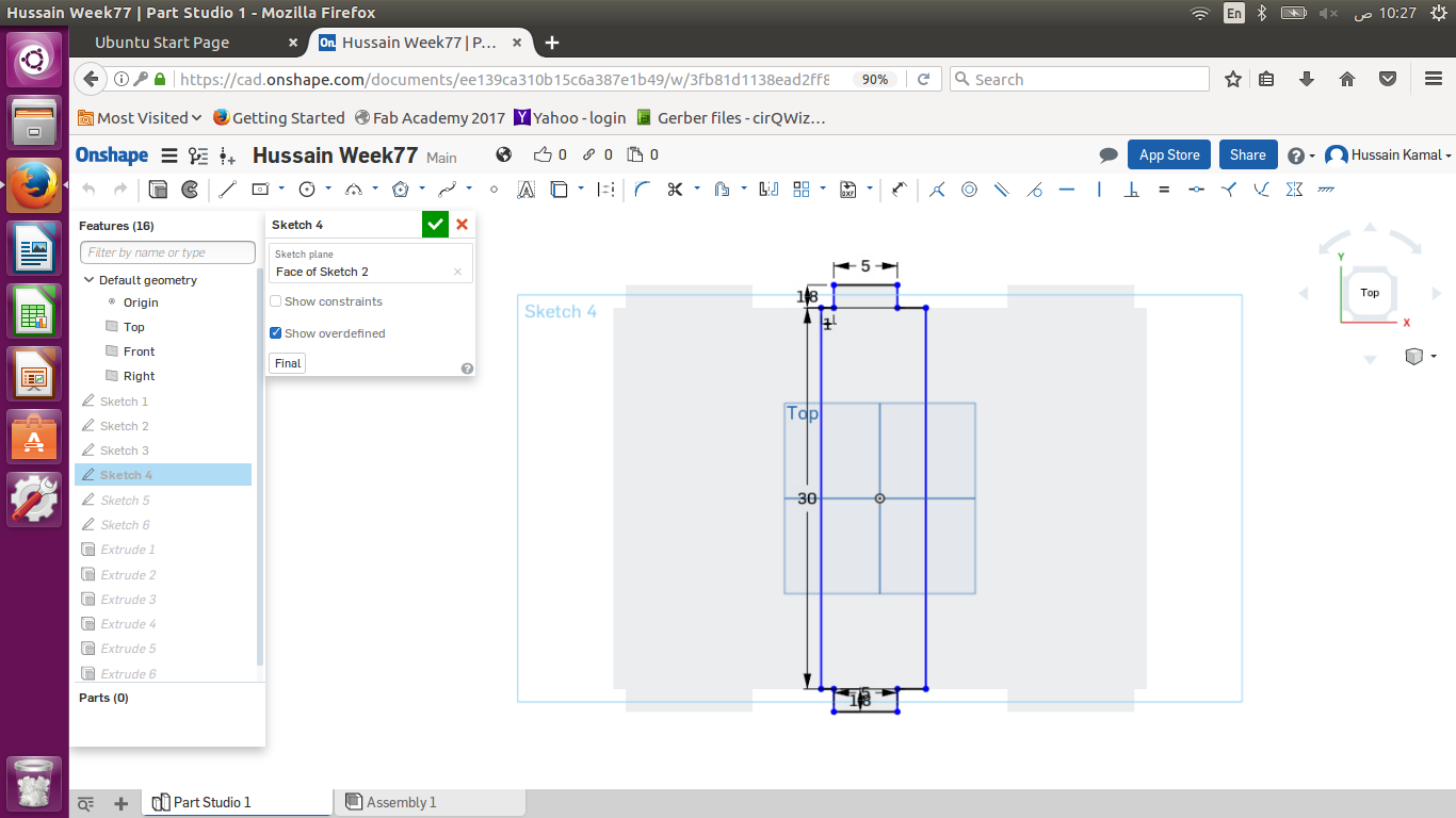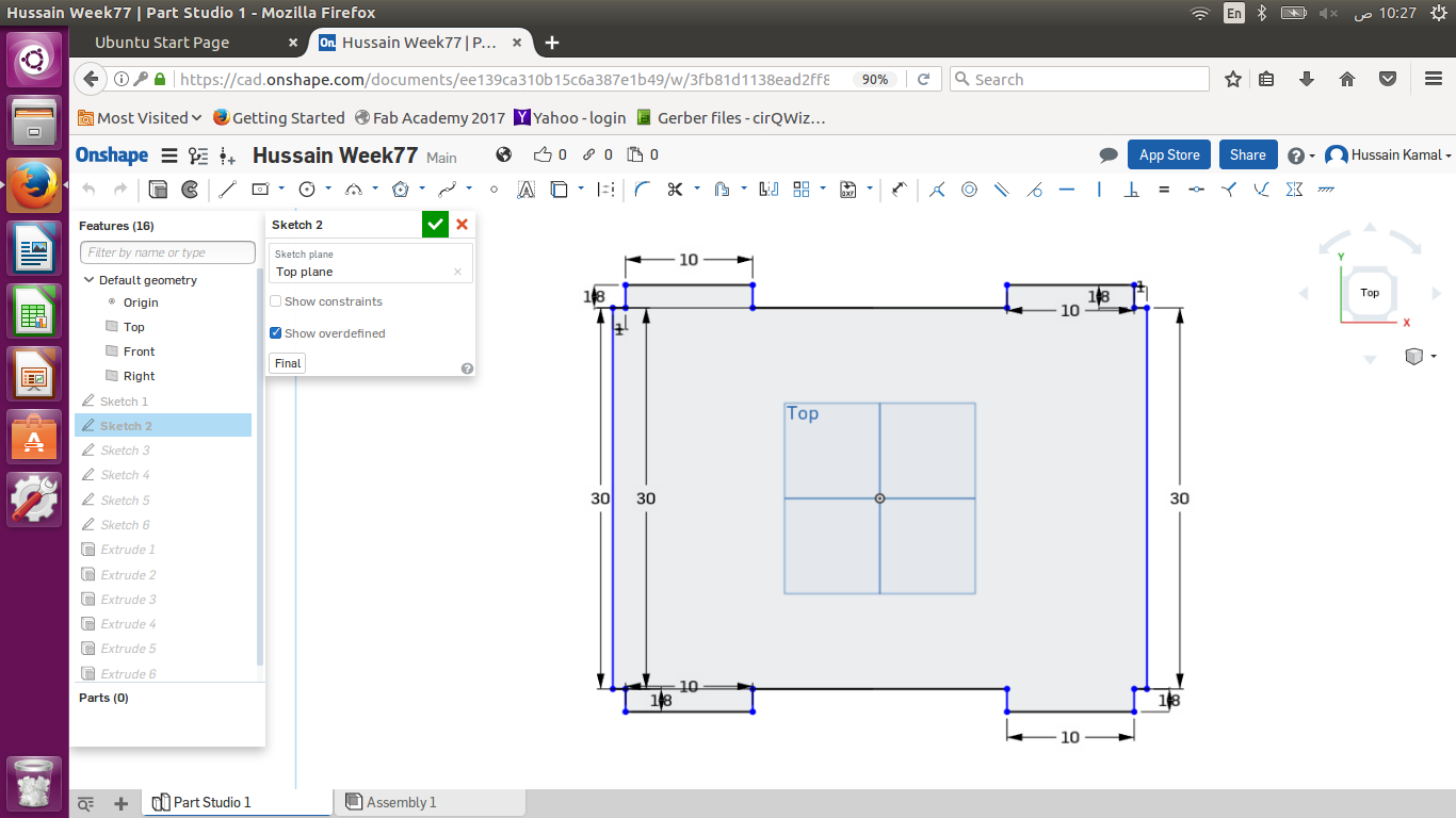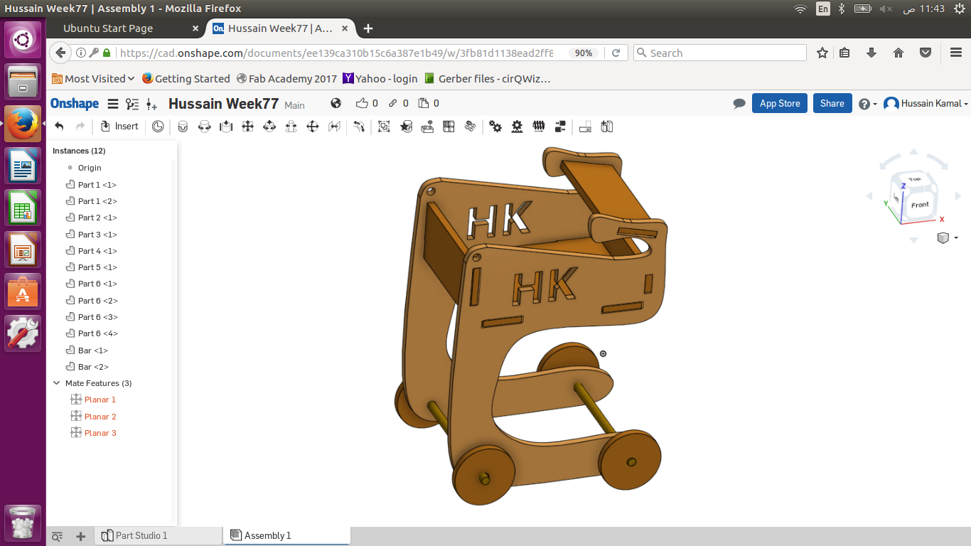 I used Onshape to design my object. I wanted to design a prototype shape of my final project ( Cart ). So I designed a simple shape of a cart to mirror it and have 2 of the shapes in parallel , considering all the press fits to fix the basket later , the horizontal small rectangles (10 cm x 1.8 cm) are the press fits to place the ground board of the cart. While the vertical rectangles (10 cm x 1.8 cm) & (5 cm x 1.8 cm) to hold the front & back boards of the basket as shown below .